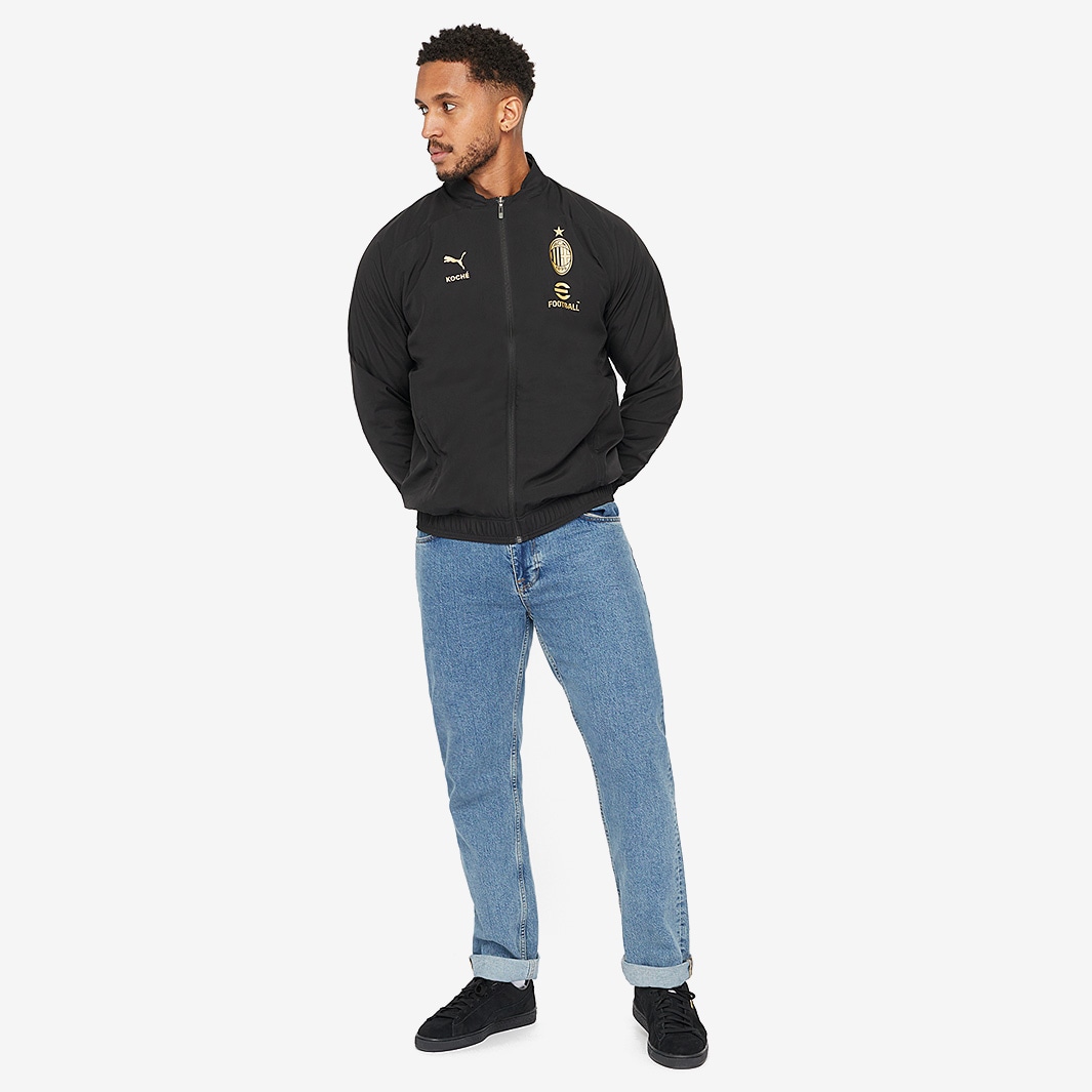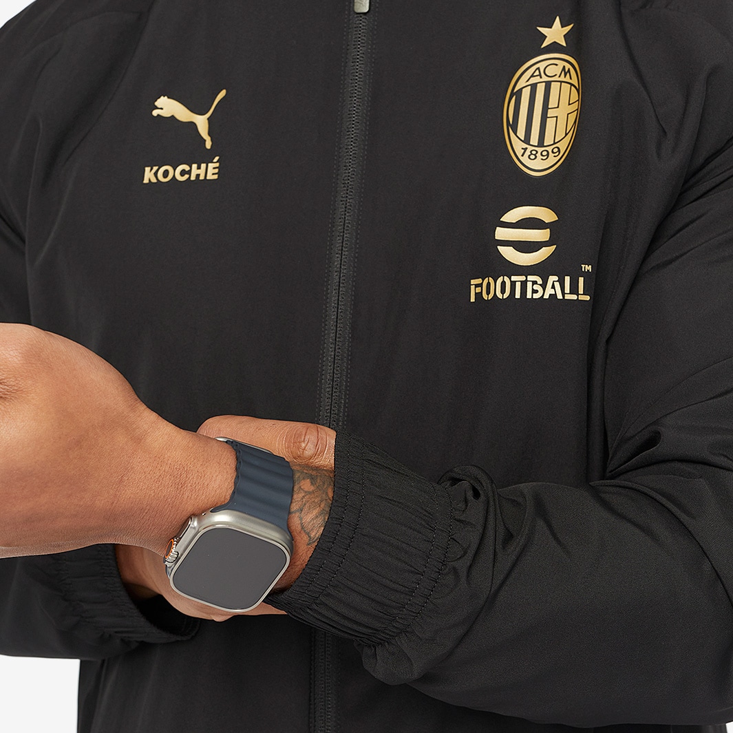 The Puma AC Milan x KOCHE Pre-Match Jacket in Puma Black / Puma Team Gold is the perfect way to show off your support for the Rossoneri in style.