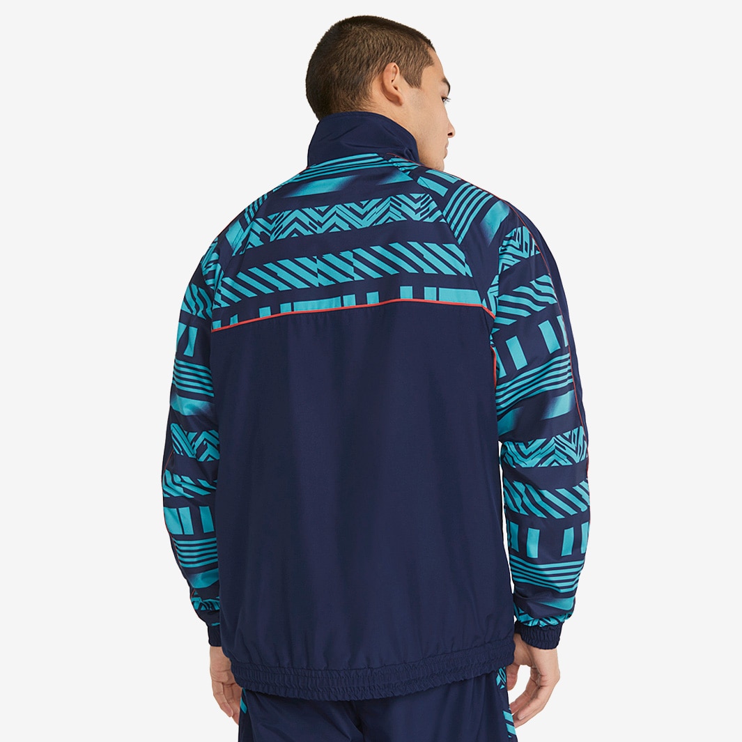 This jacket pays tribute to City in old-school style, with the famous badge on the left chest and the PUMA King logo on the right. A striking geometric design covers the chest and arms for an eye-catching, retro look.
