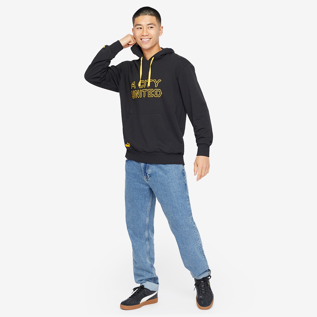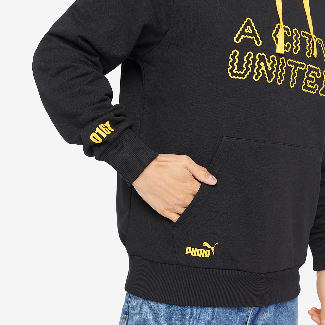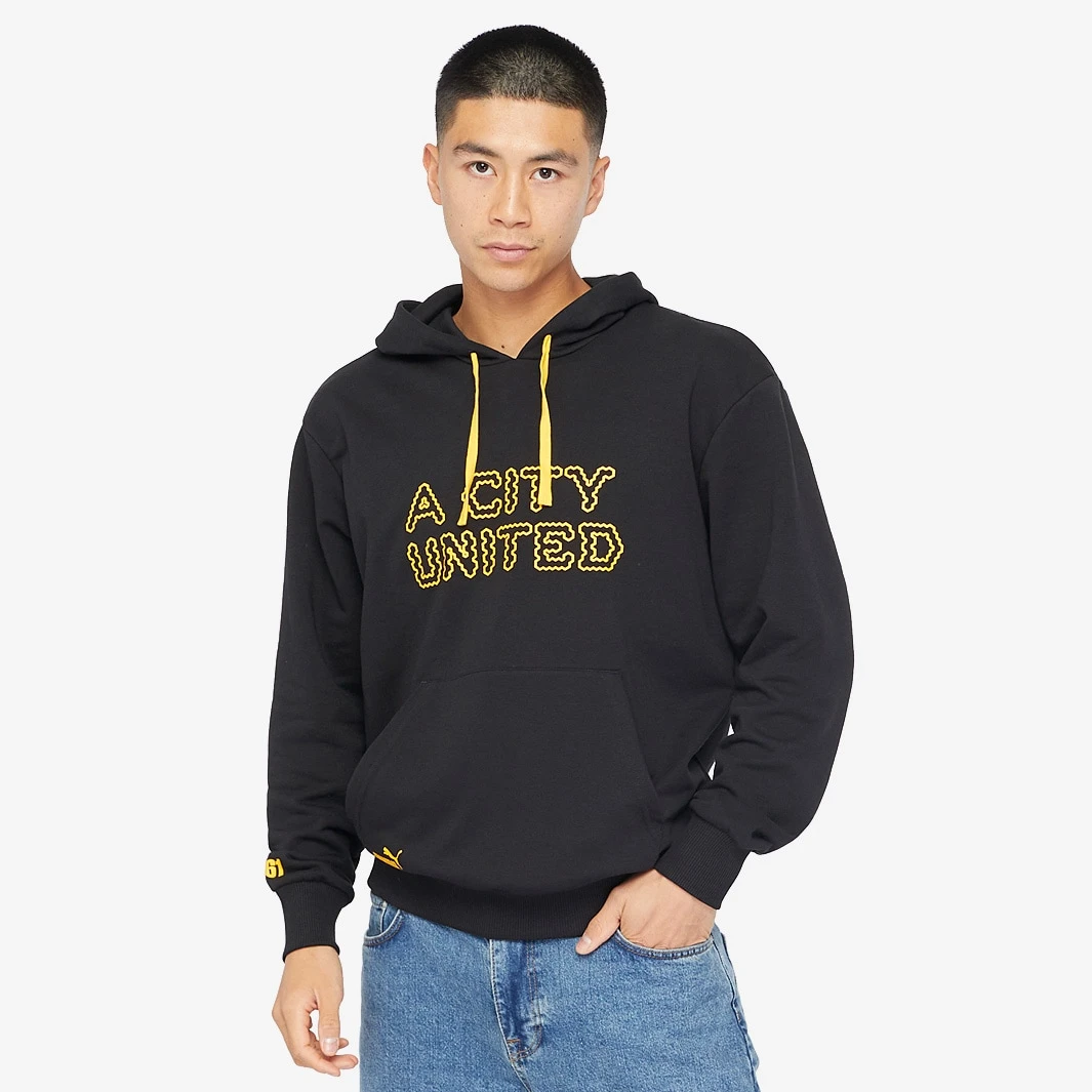 The PUMA MCR City Pack II Hoodie features large 'A City United’ lettering across the chest, together with other locally-inspired details like the city area code, and PUMA logos.