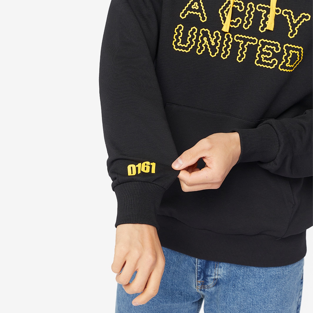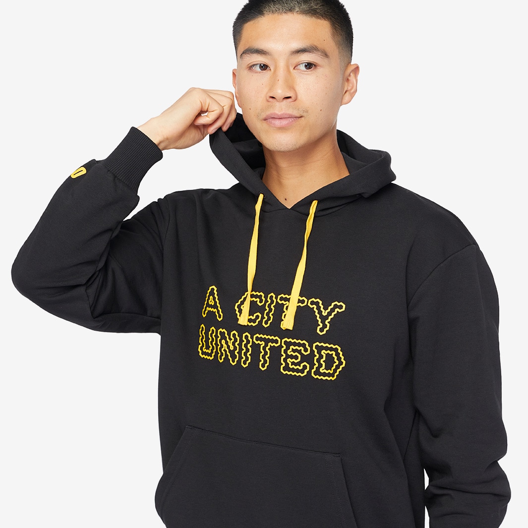 This regular fit, pullover hooded sweatshirt features industrial yellow embroidered details that combine the city’s historical music culture with its sporting heritage to create a closet staple with a classy, modern design.