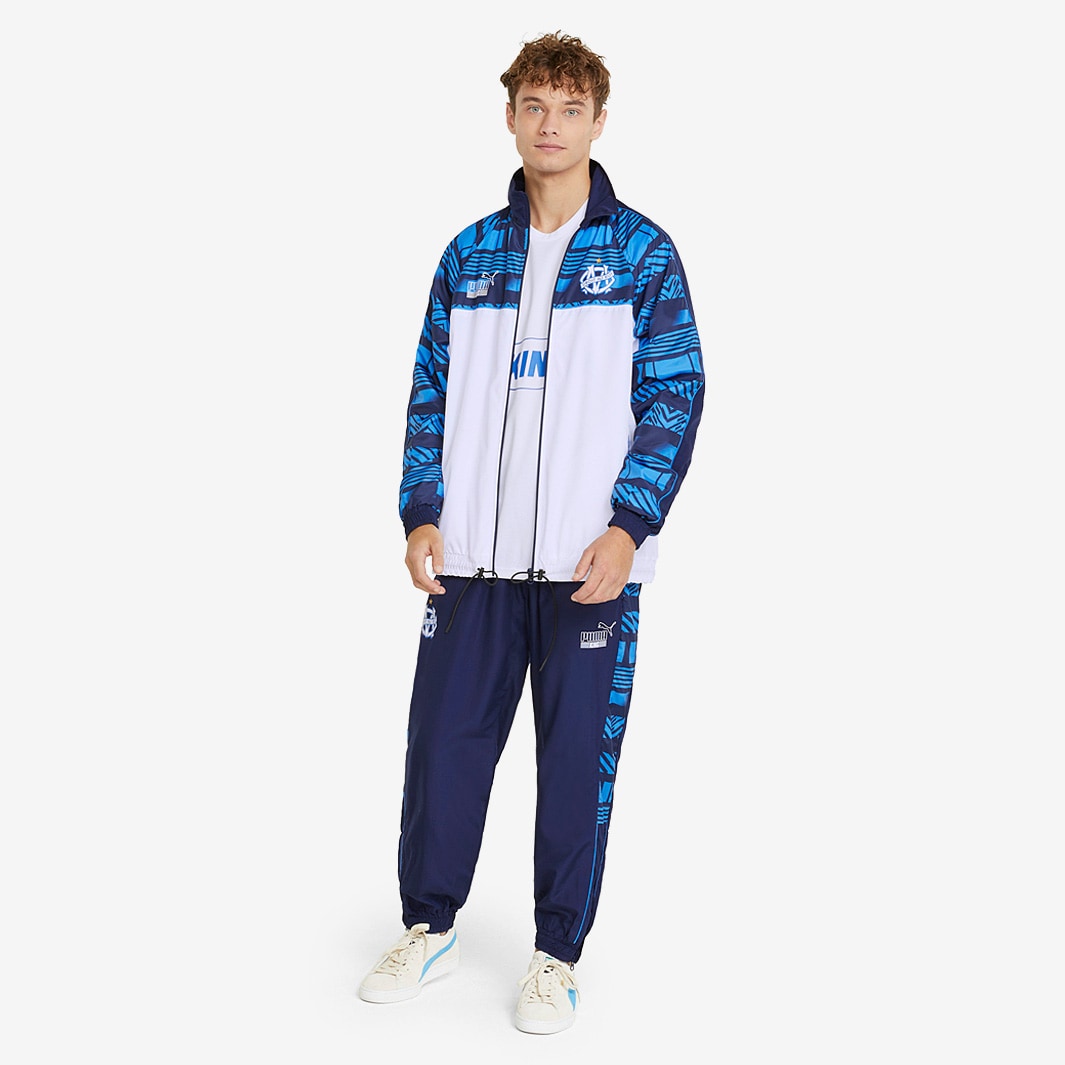 This track jacket pays tribute to Marseille in style, with a monogram inspired, old-school Marseille badge on the left chest and a PUMA King logo on the right. A striking geometric design covers the chest and arms to complete an eye-catching, retro look.