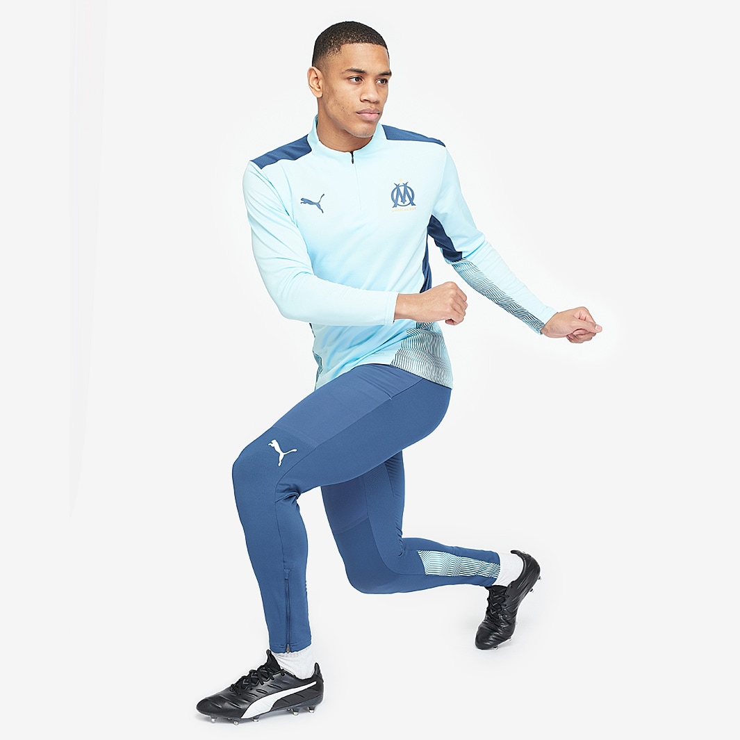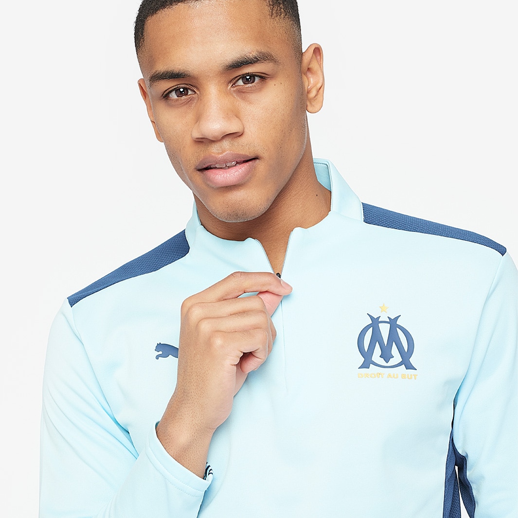 Set the standard with the PUMA Olympique Marseille 21/22 Training Drill Top in Blue Glow/Dark Denim, featuring official branding for the authentic OM look.