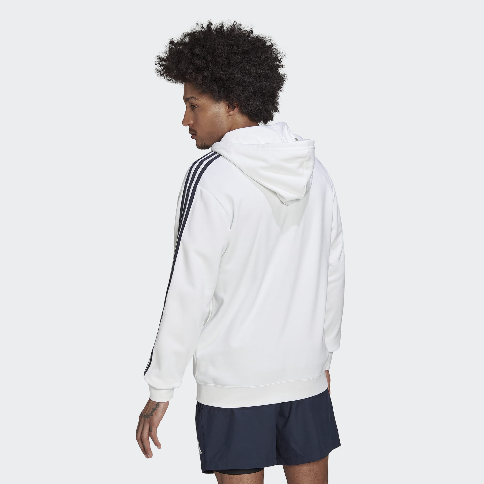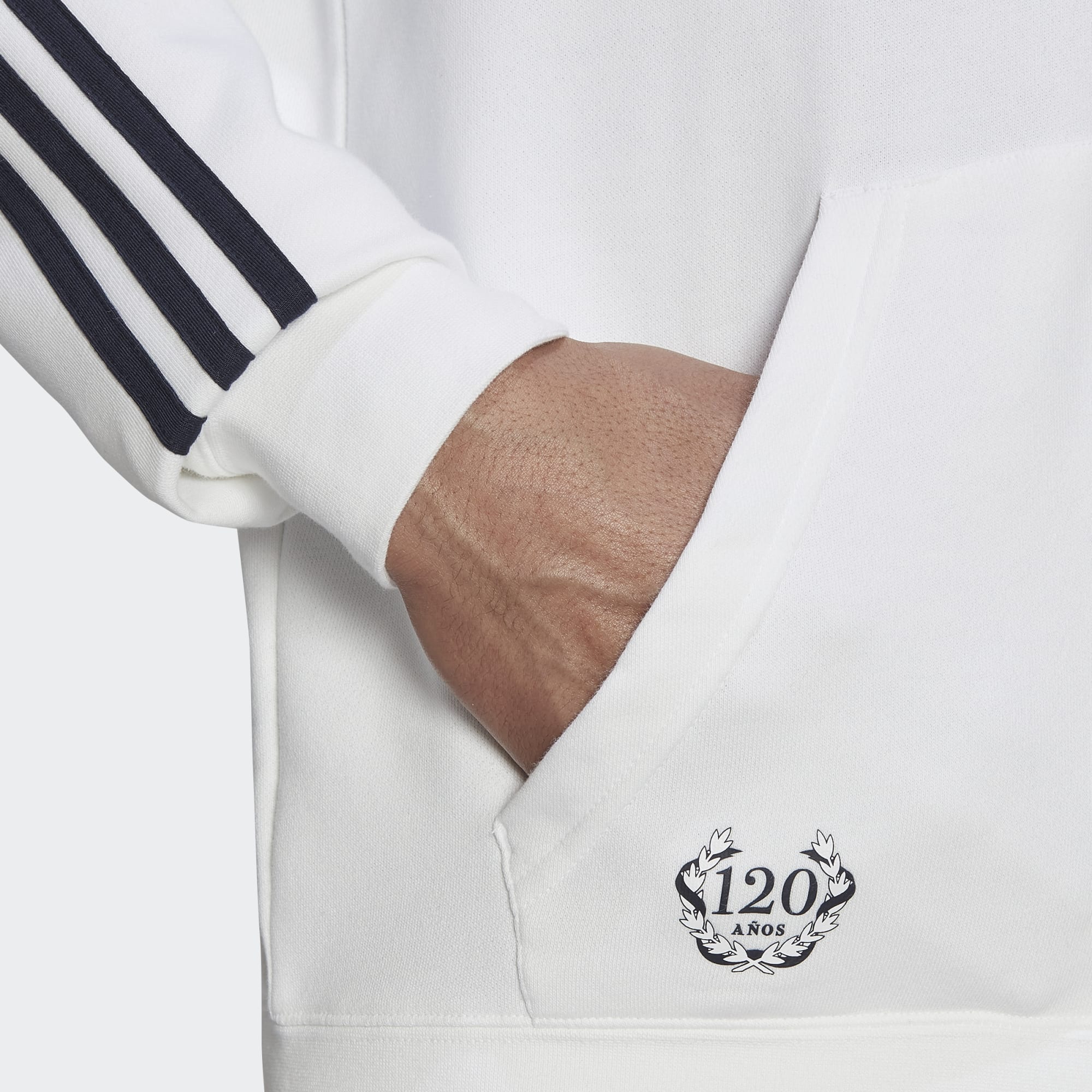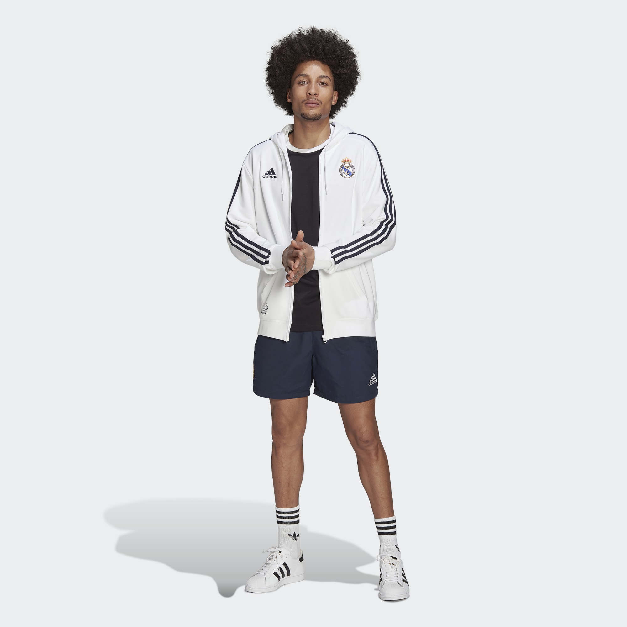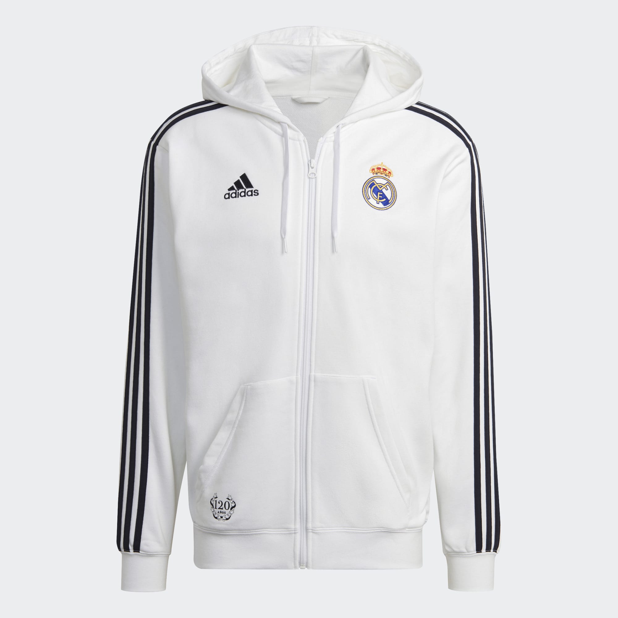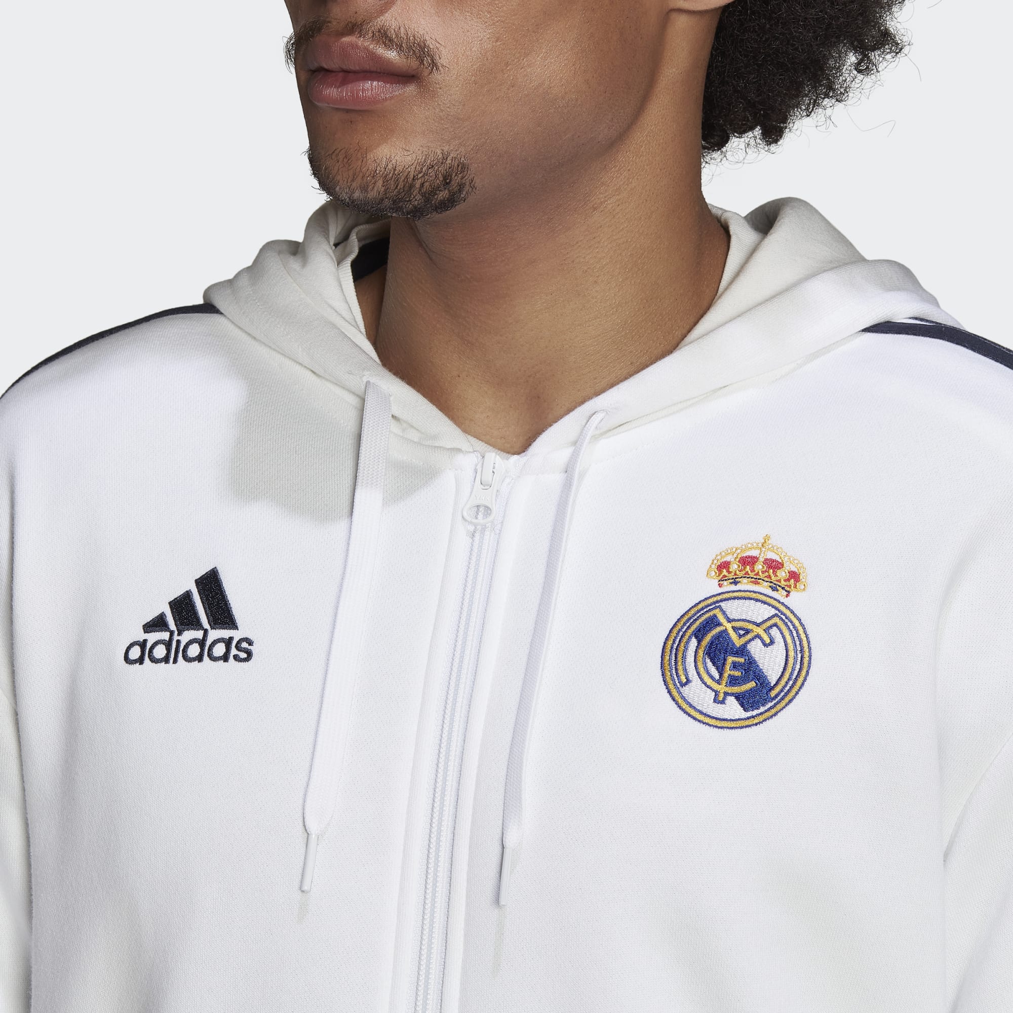 This adidas Real Madrid DNA 3-Stripes Full-Zip Hoodie shows off the club's world-famous badge and navy 3-Stripes over those crisp, clean home colours.
