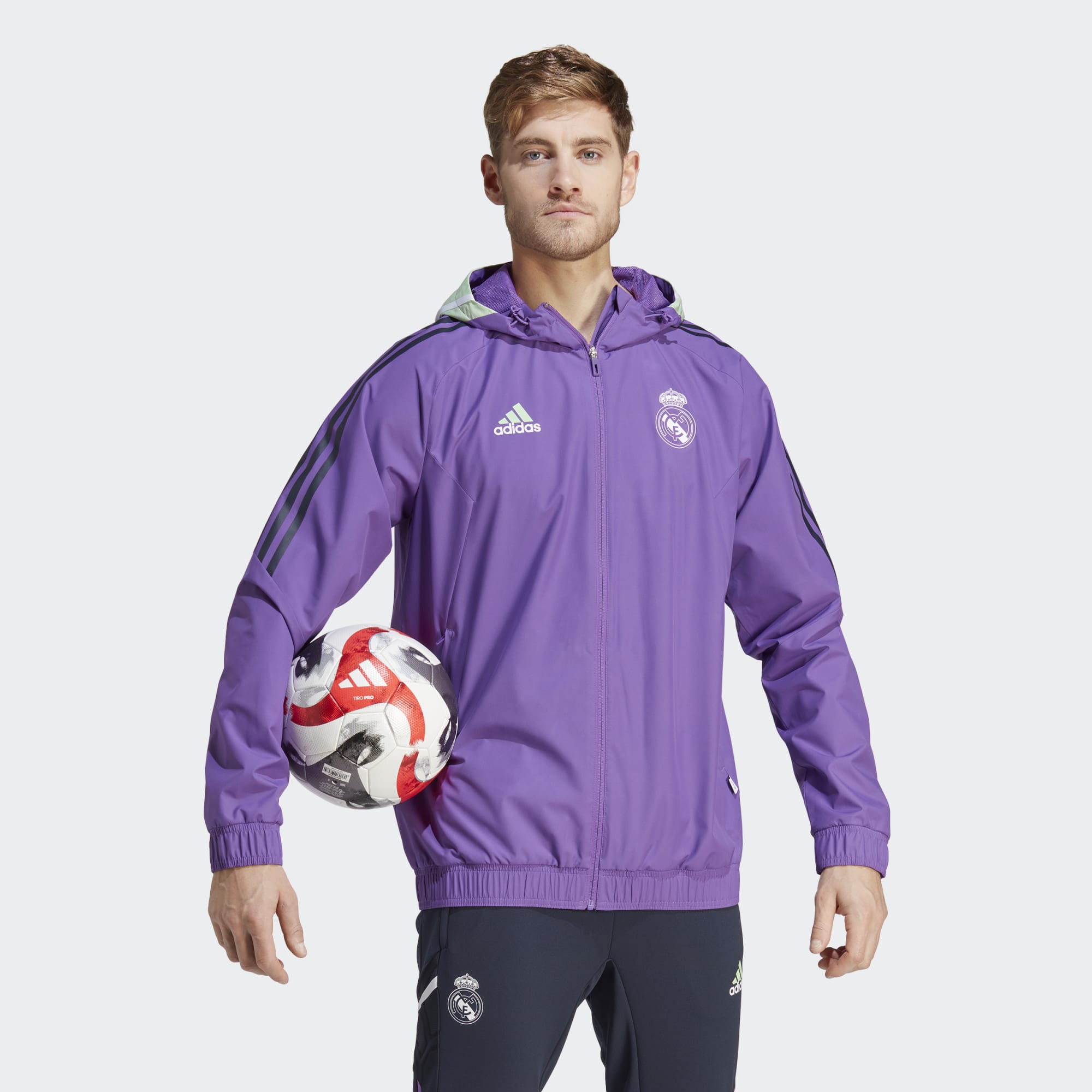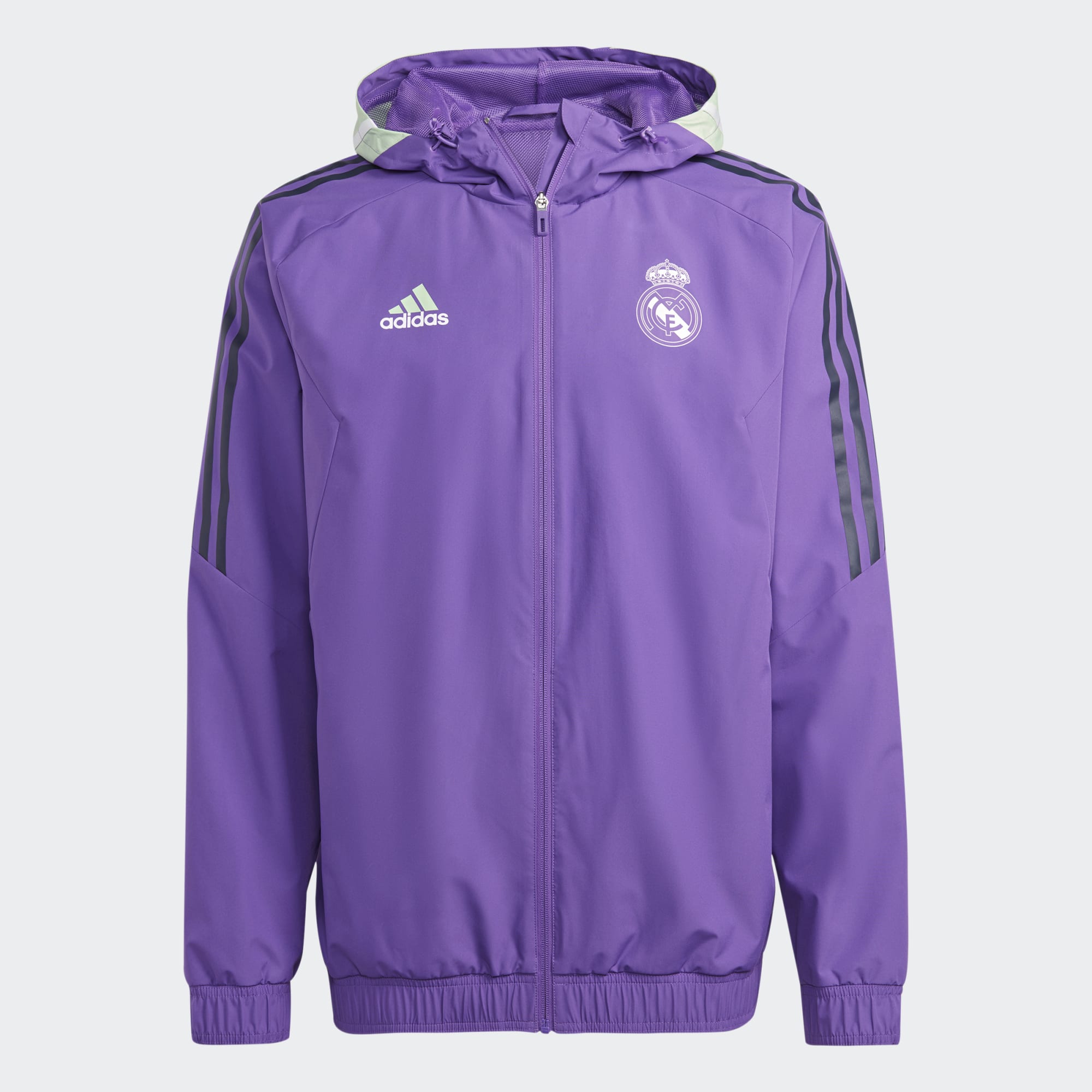 Part of Real Madrid's Condivo 22 training range, this adidas football jacket easily shrugs off light showers with its water-repellent finish. Inside, a mesh lining keeps you comfortable so you can concentrate on your game.