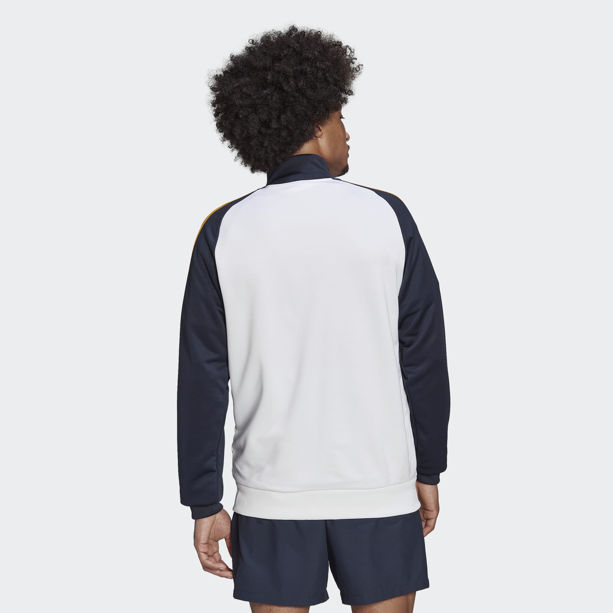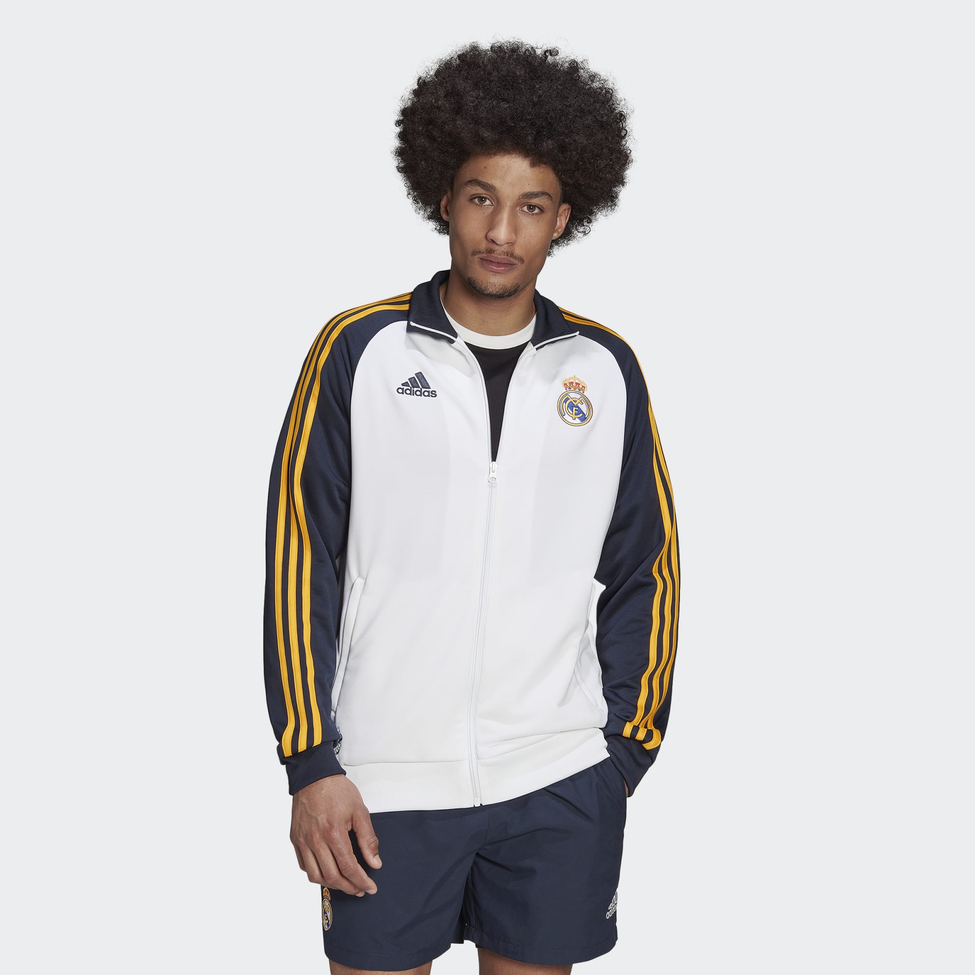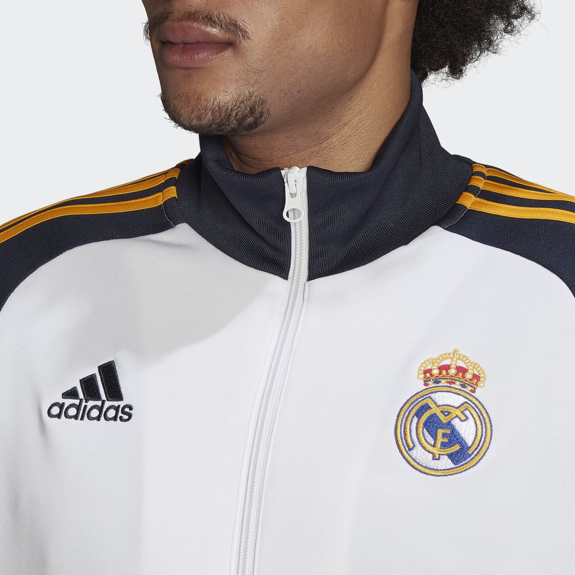 Sampling the club's famous badge, yellow 3-Stripes stand out against the navy sleeves of this adidas Real Madrid DNA 3-Stripes track top in White / Night Navy.
