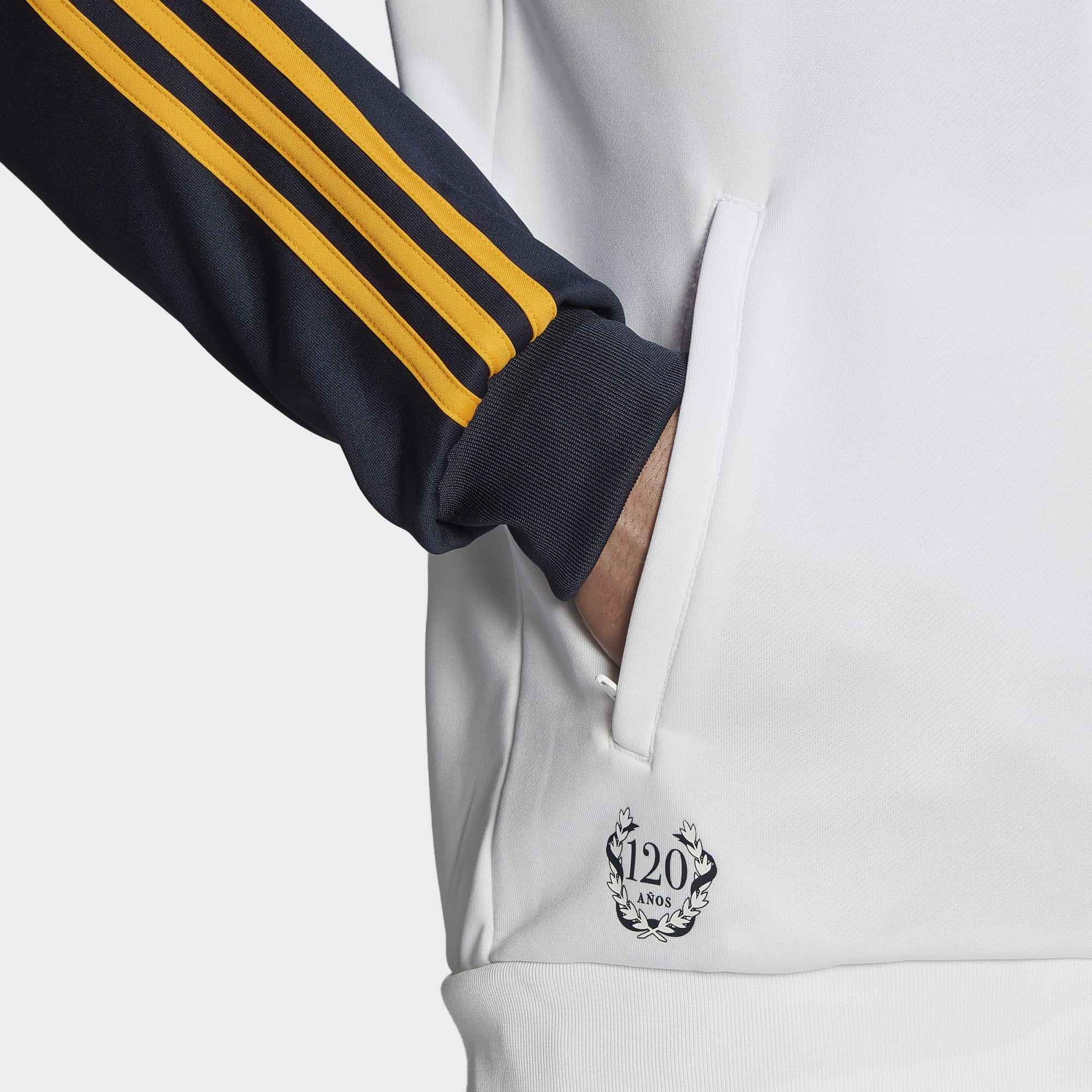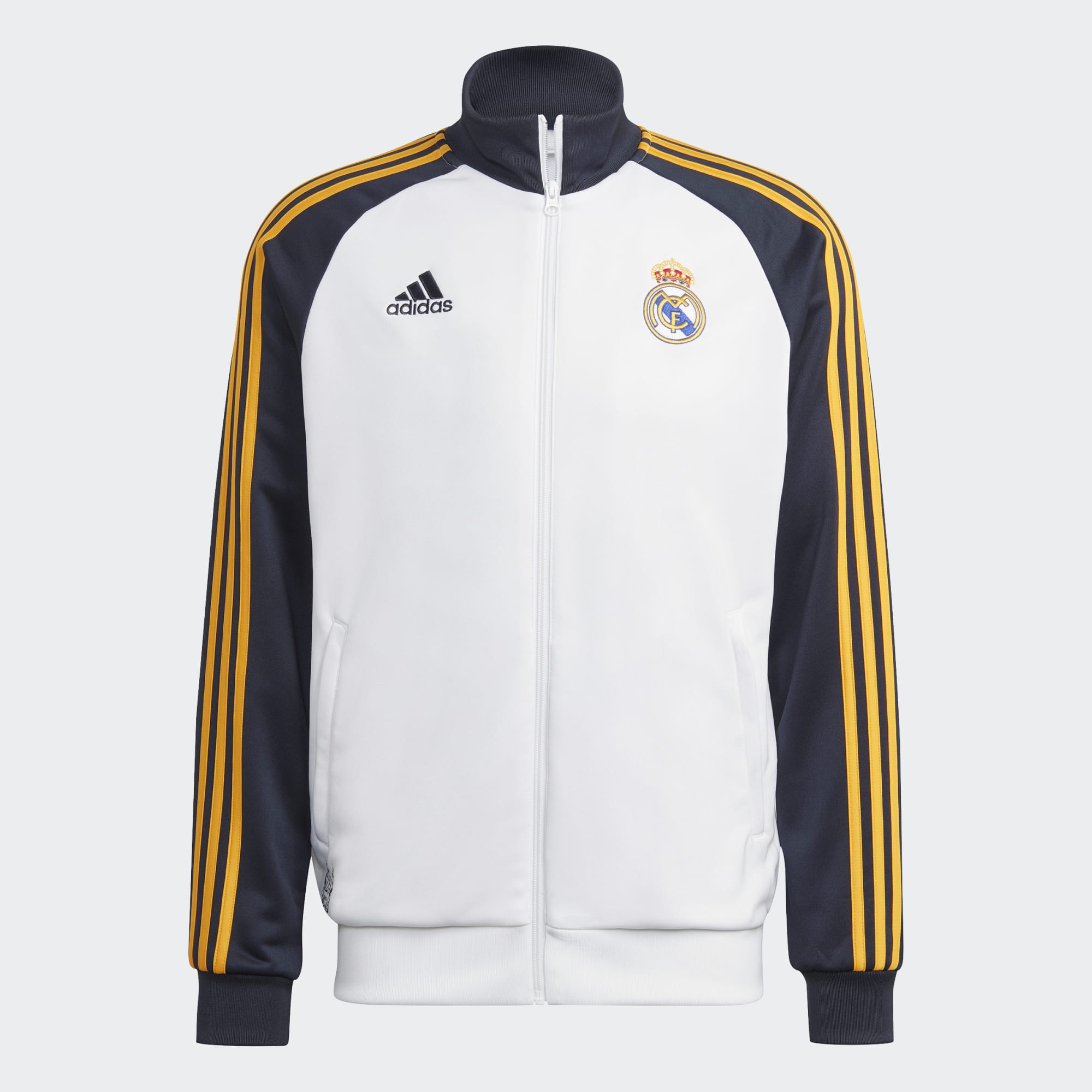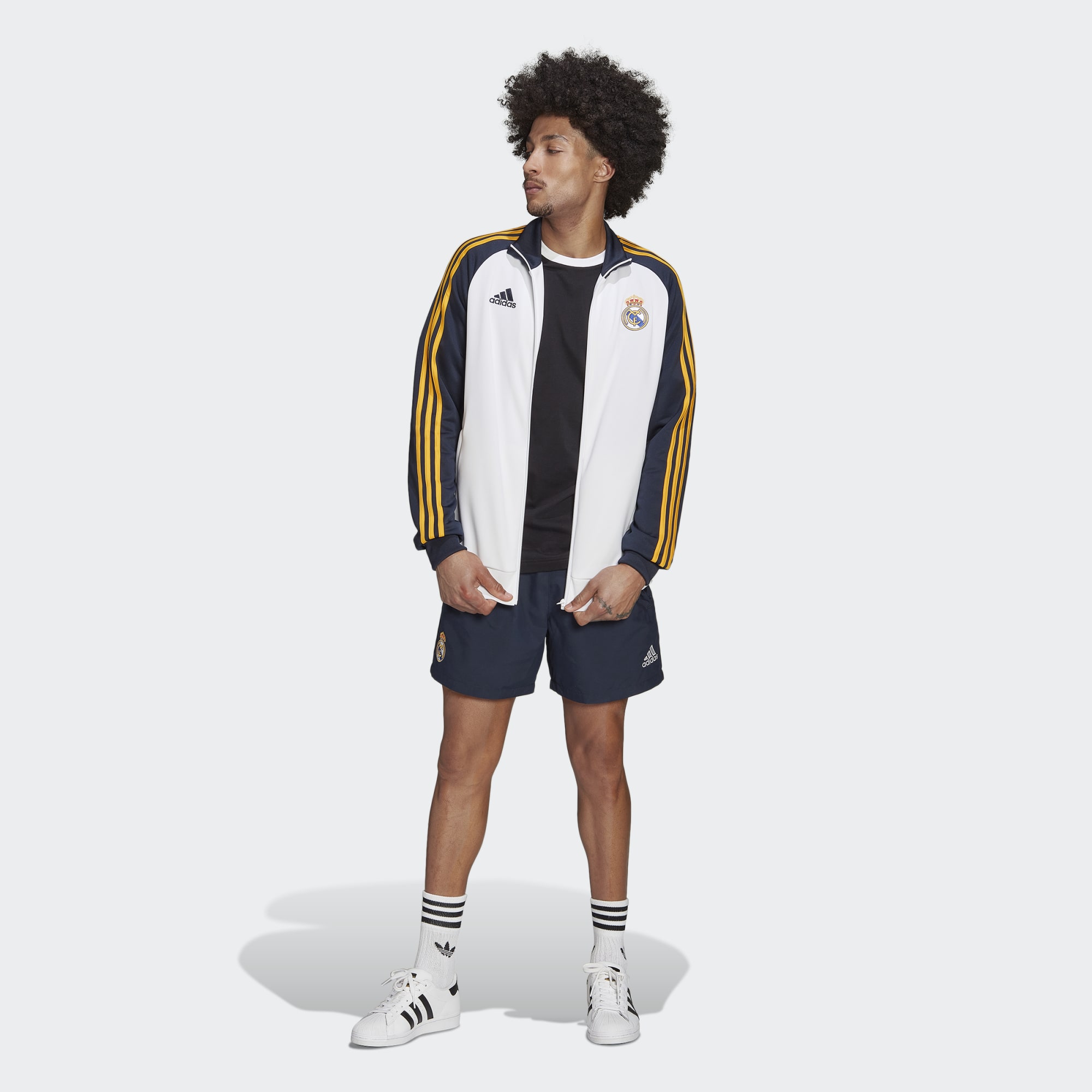 Sampling the club's famous badge, yellow 3-Stripes stand out against the navy sleeves of this adidas Real Madrid DNA 3-Stripes track top in White / Night Navy.