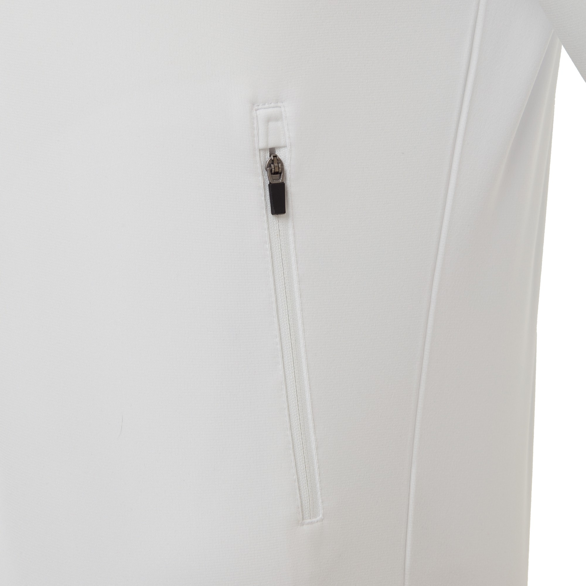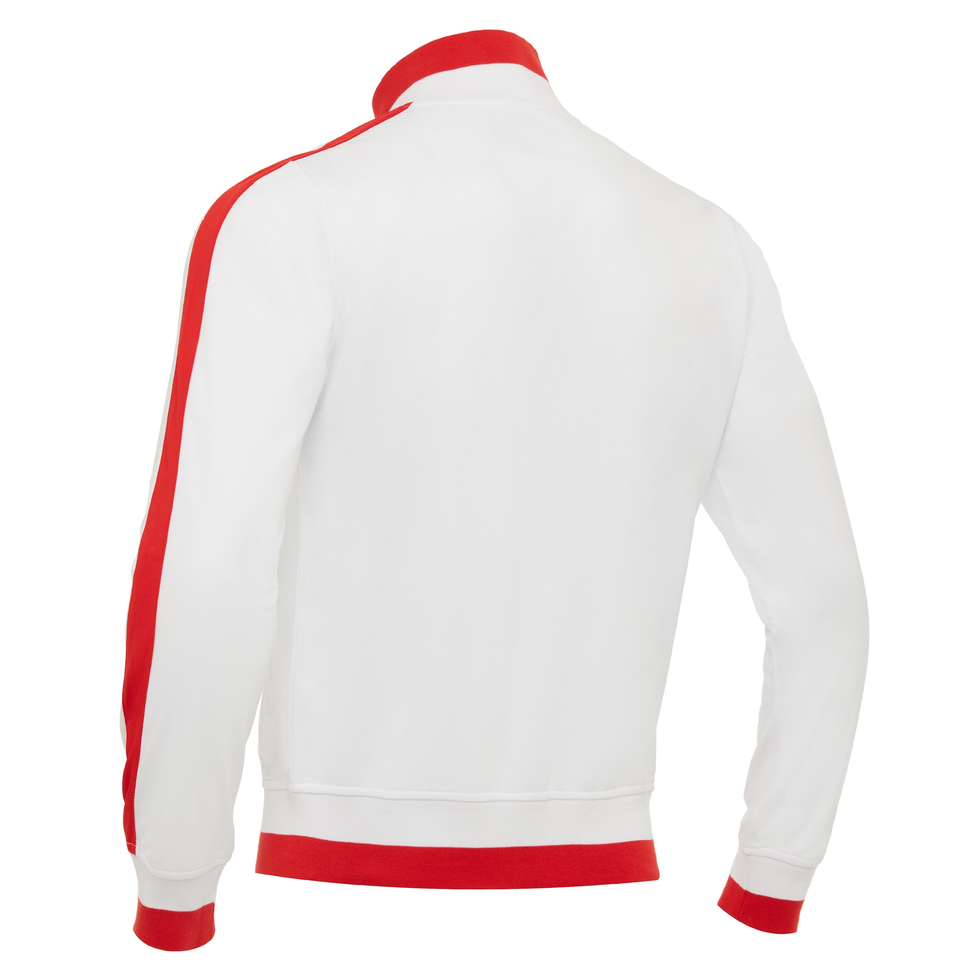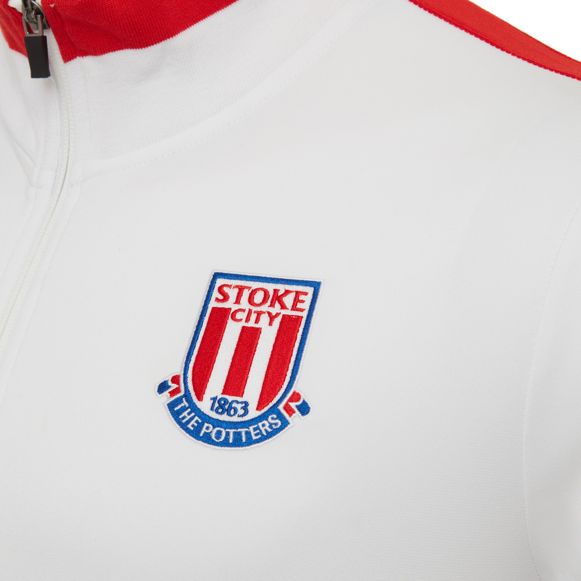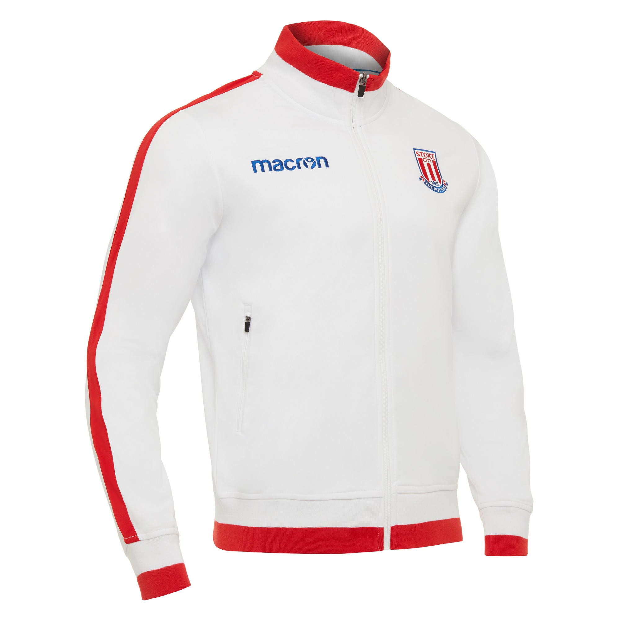 Stoke City FC's 17/18 Macron Anthem jacket is mostly white, with two vertical bands in red on the sleeves. The jacket has a practical zip fastener, while the sleeve cuffs and the bottom of the jacket feature a two-tone red and white knit, symbolising elegance and comfort.