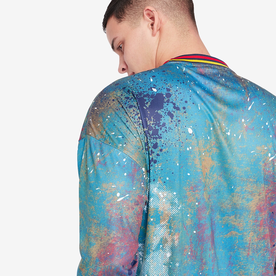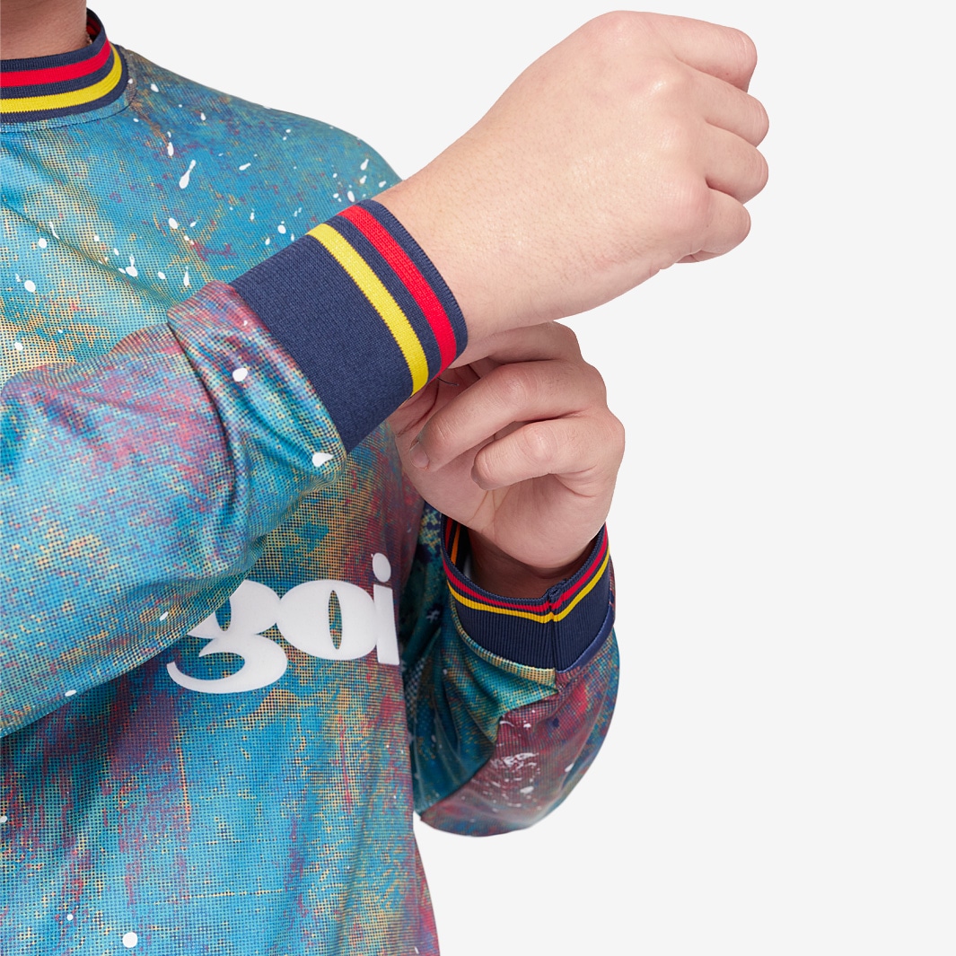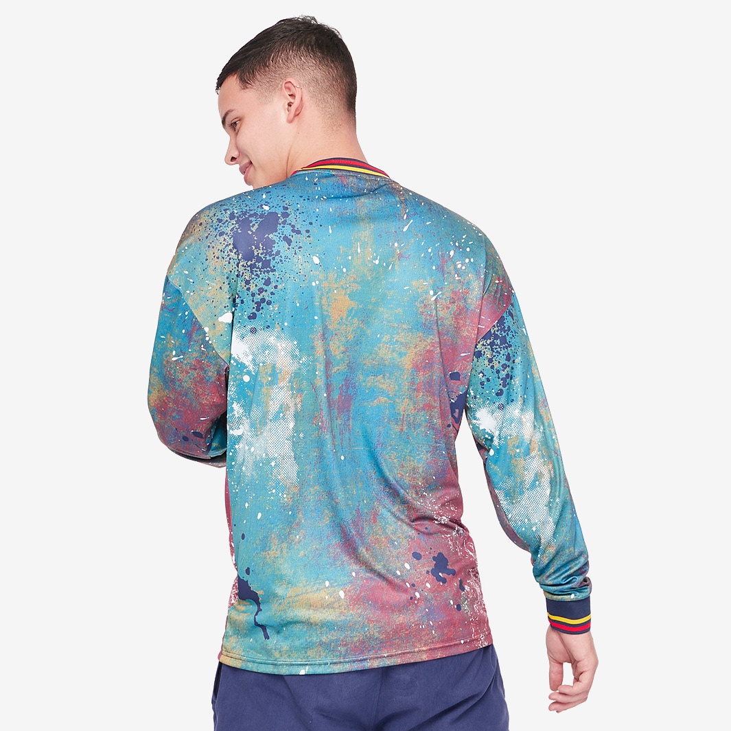 With an all-over splash print design, this 90s acid house-inspired football shirt is the result of a coming together of music, fashion and football.