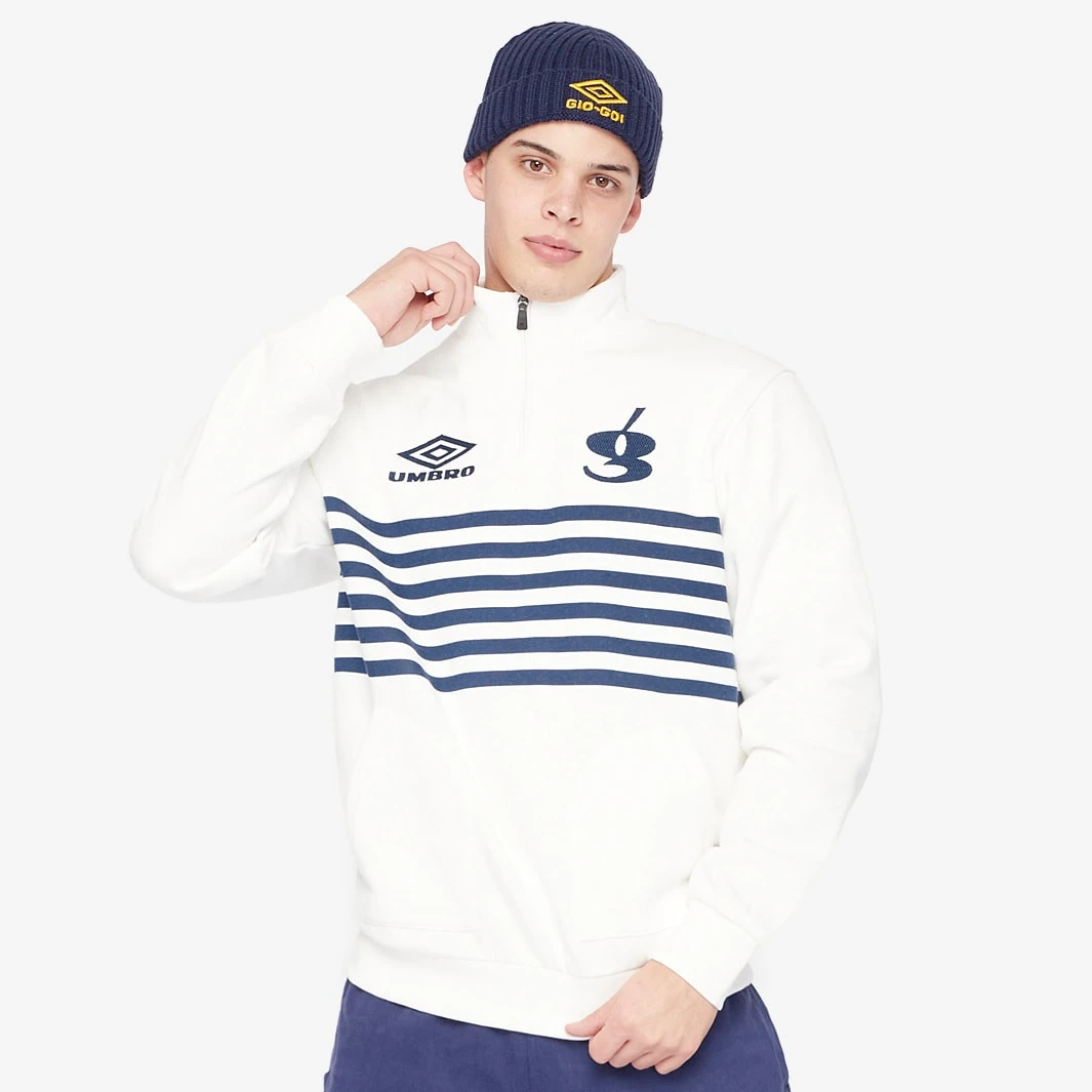 Stay warm and comfy all the way from the sports hall to the dancehall in the Umbro x Gio-Goi Shore Leave Sweat in Marshmallow/Patriot Blue.