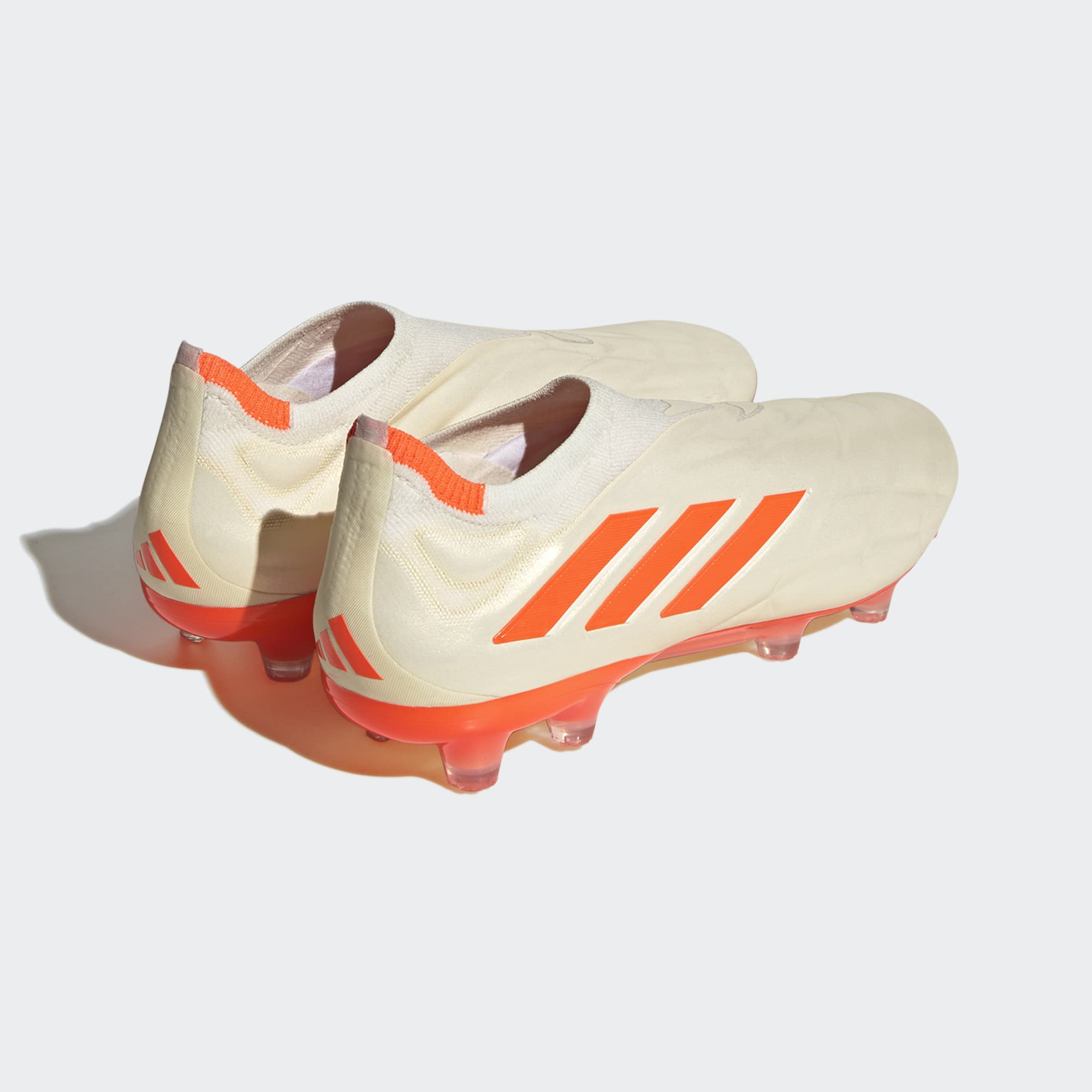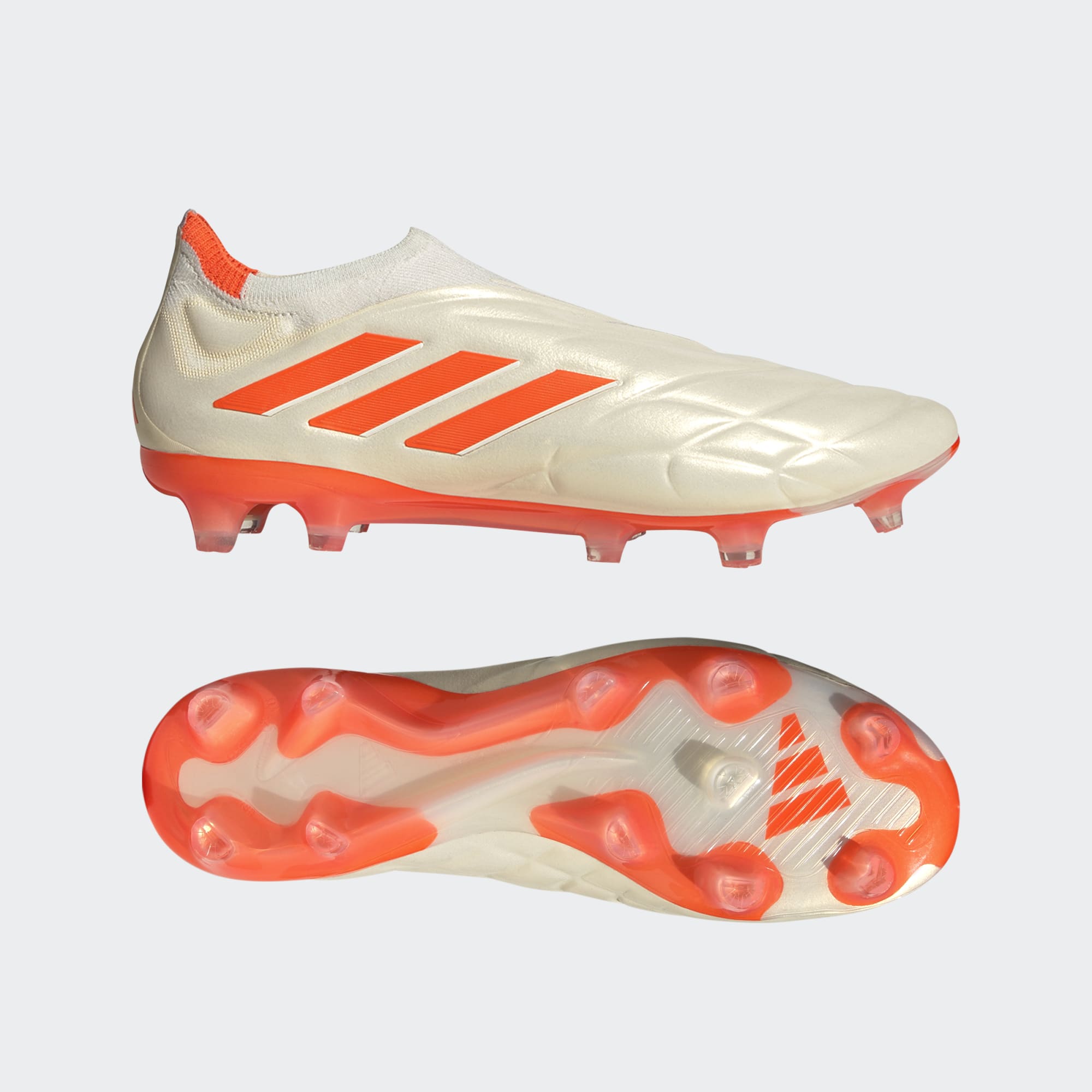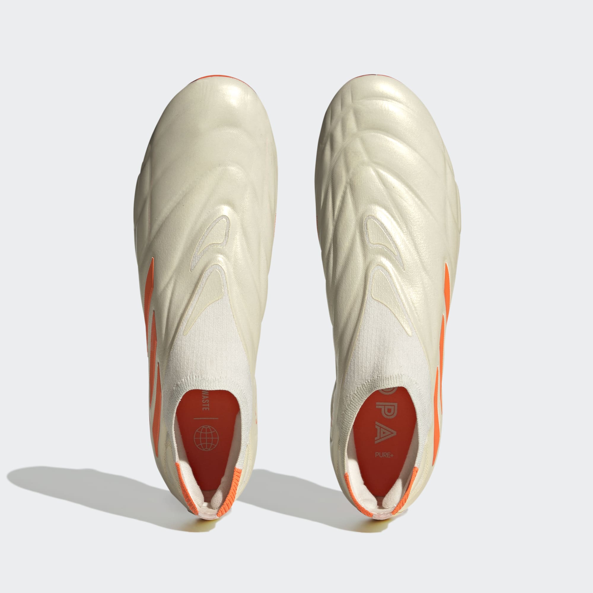 These laceless adidas Copa Pure+ FG Heatspawn football boots in Off White/Team Solar Orange/Off White feature a quilted Fusionskin leather forefoot seamlessly blended with an adidas PRIMEKNIT collar for cushioned touch and stability.