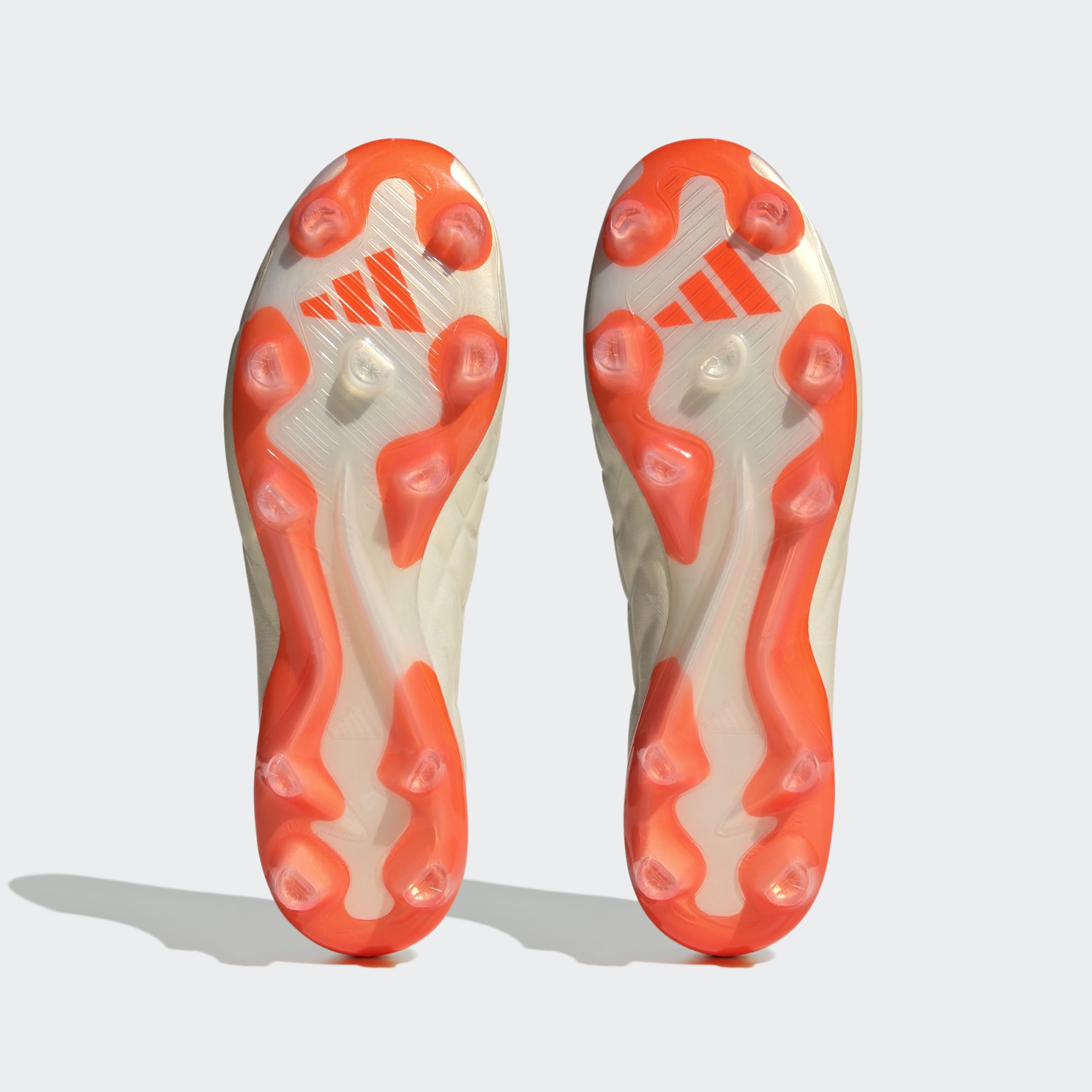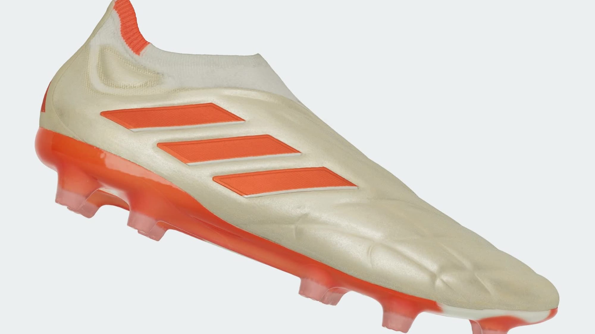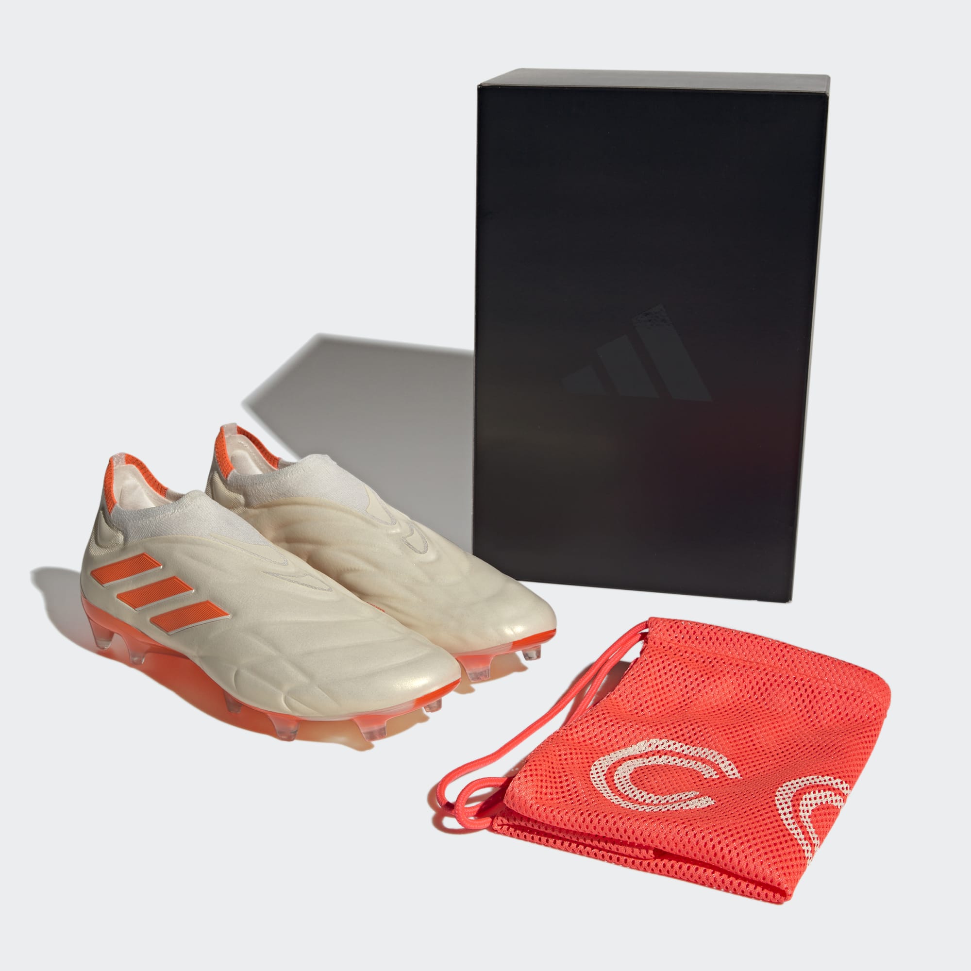 These laceless adidas Copa Pure+ FG Heatspawn football boots in Off White/Team Solar Orange/Off White feature a quilted Fusionskin leather forefoot seamlessly blended with an adidas PRIMEKNIT collar for cushioned touch and stability.