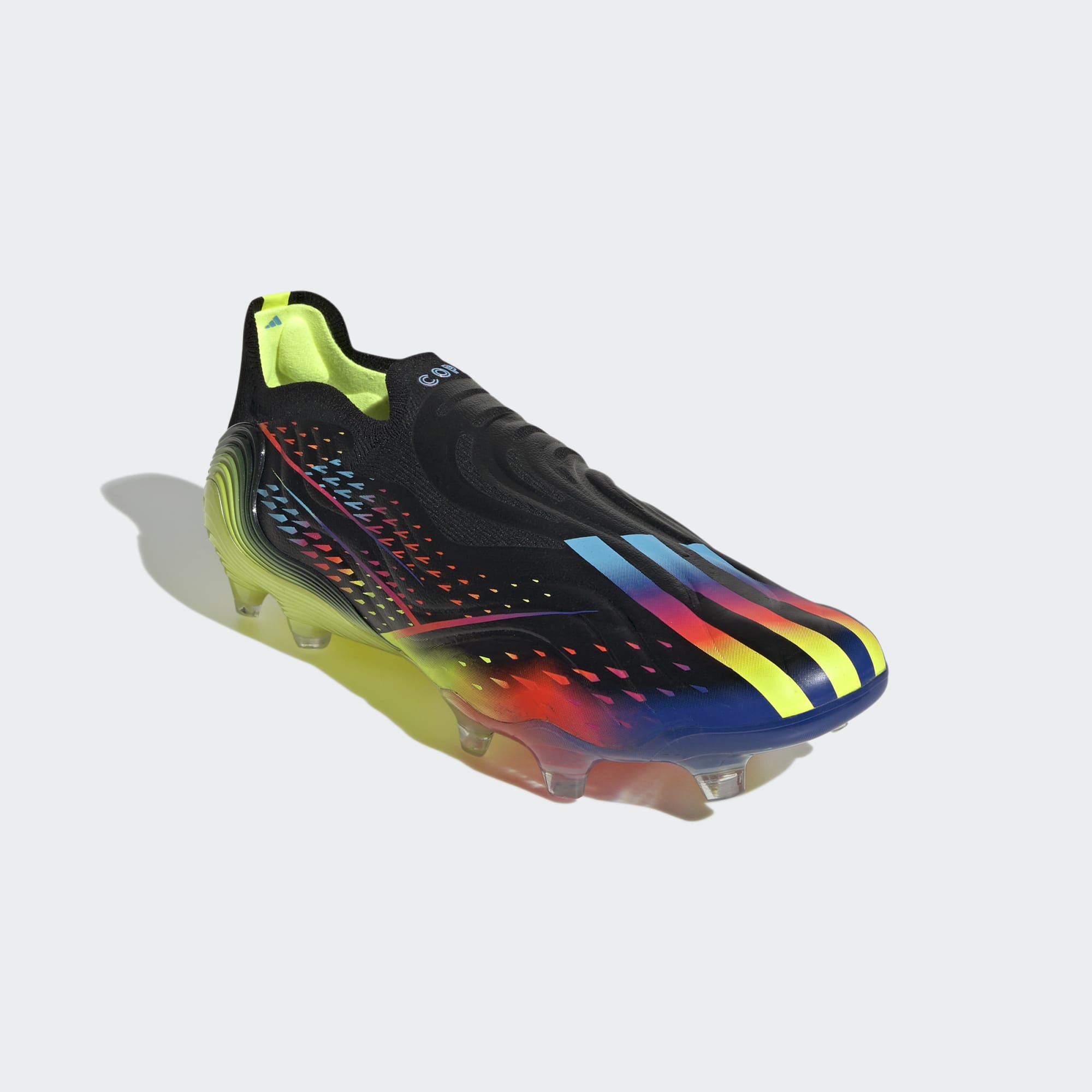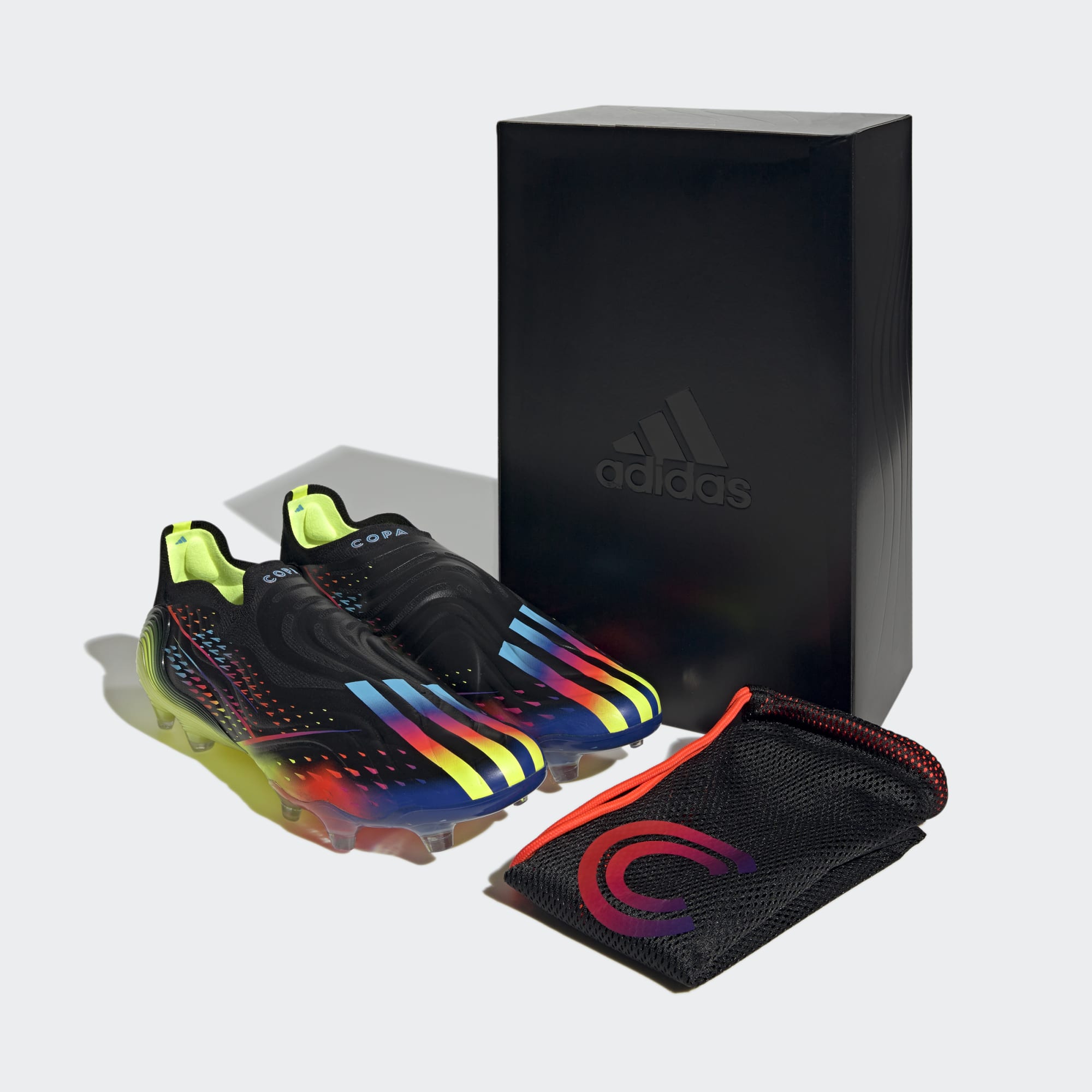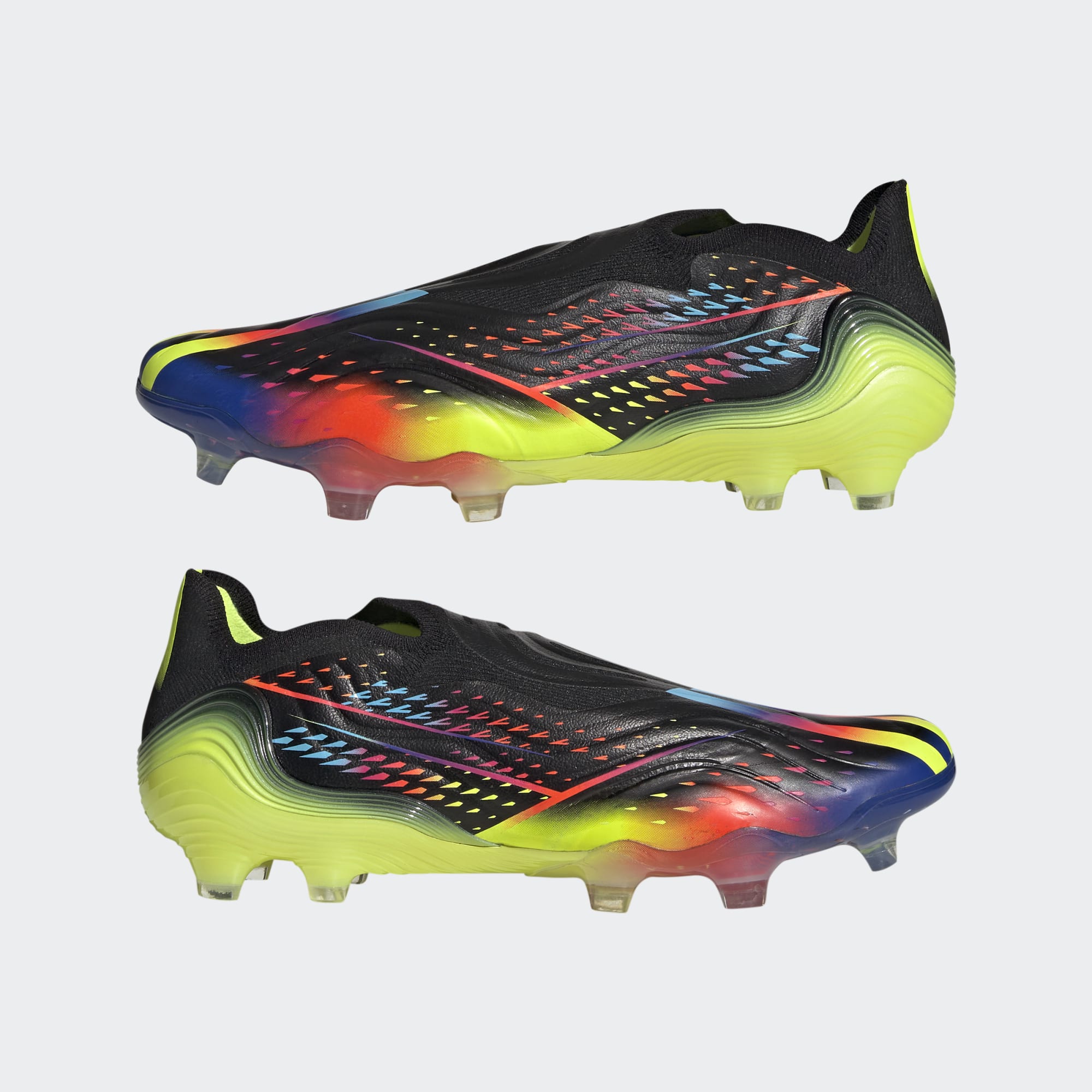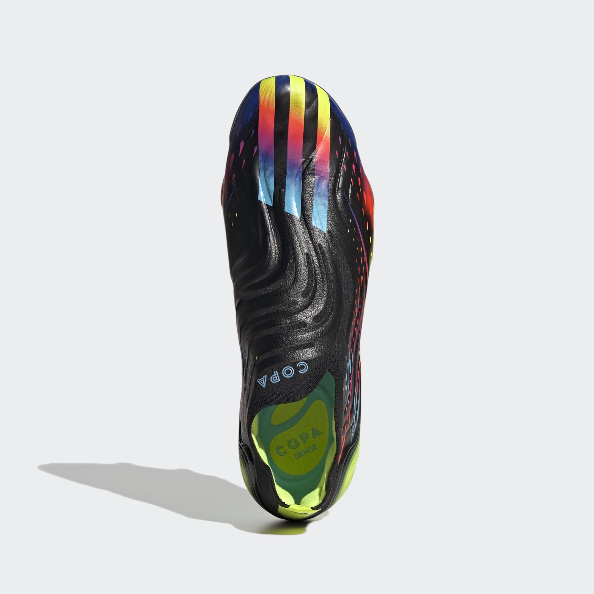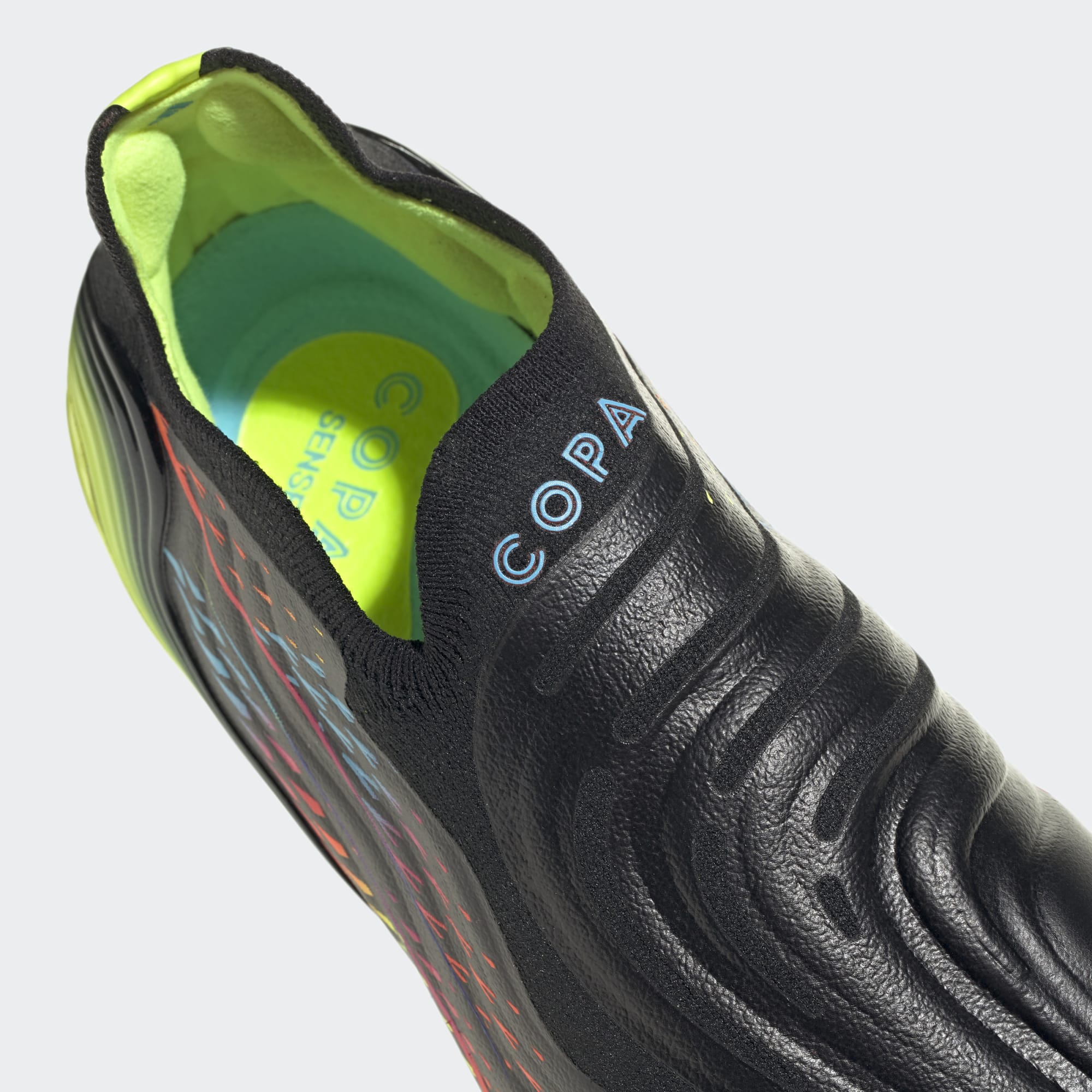 Get closer to the ball in these adidas Copa Sense+ FG Al Rihla football boots in Core Black/Bright Cyan/Team Solar Yellow. Seamlessly blended by Fusionskin technology, their laceless adidas PRIMEKNIT collar and K-leather forefoot ensure velvety-smooth play.