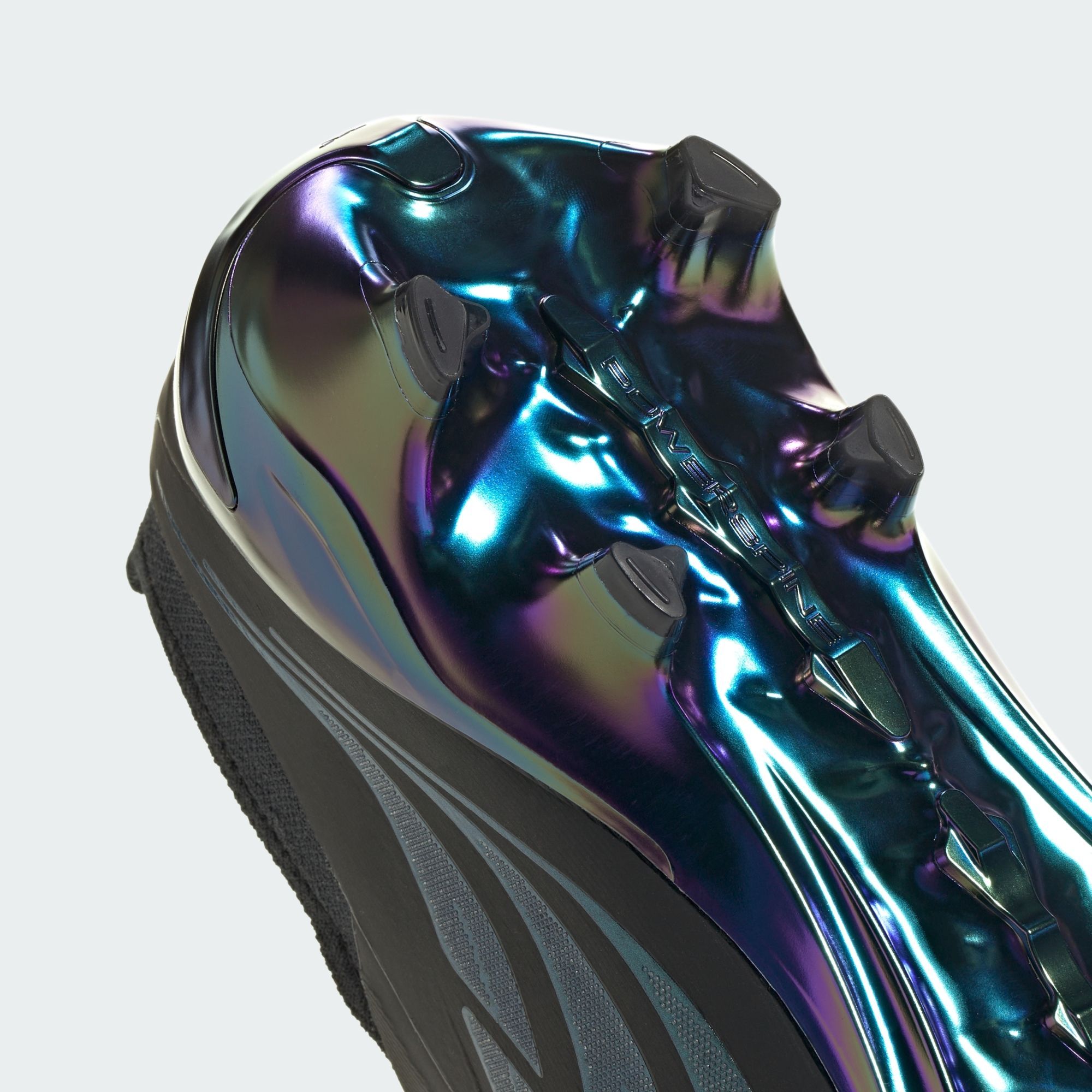The Adidas Predator EQT boots arrive in a predominantly black finish with teal accents across the upper and branding. A distinctive iridescent outsole displays shifting tones of blue, purple and green, creating a reflective effect across the soleplate and stud configuration. The fold over tongue sits above the lacing system and carries Adidas Equipment branding, referencing the historic EQT line.