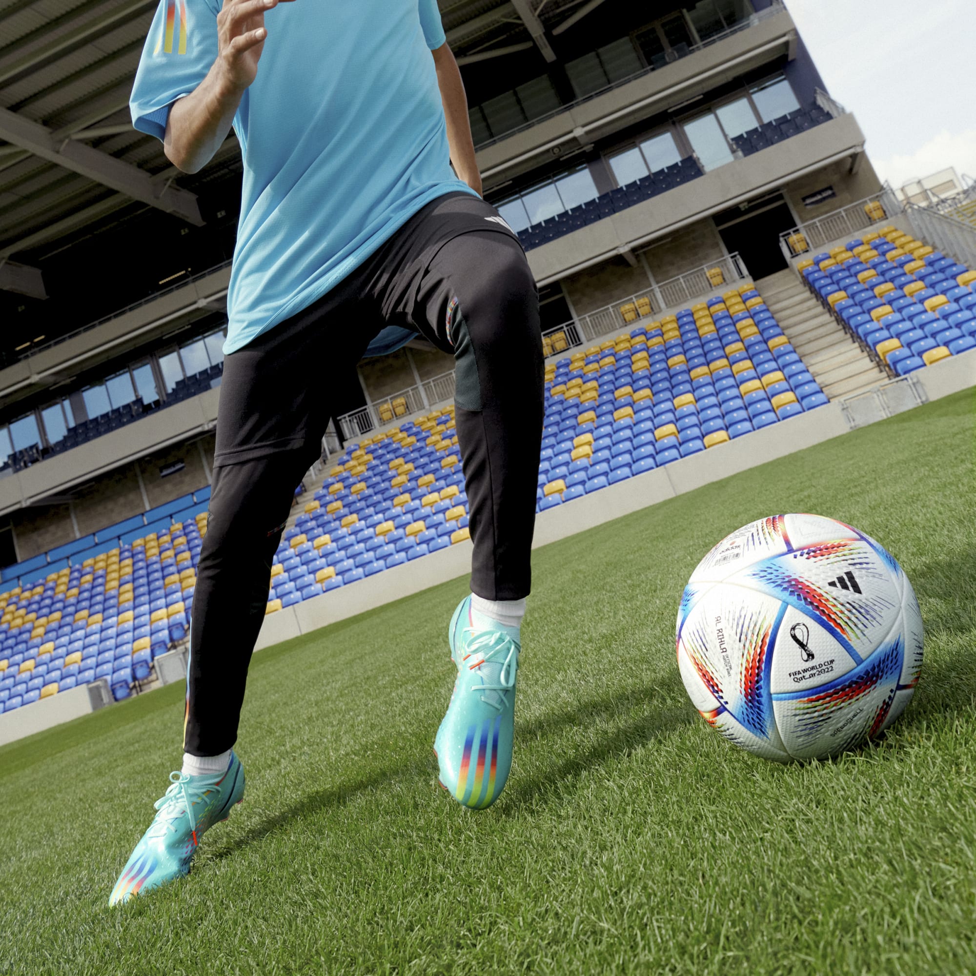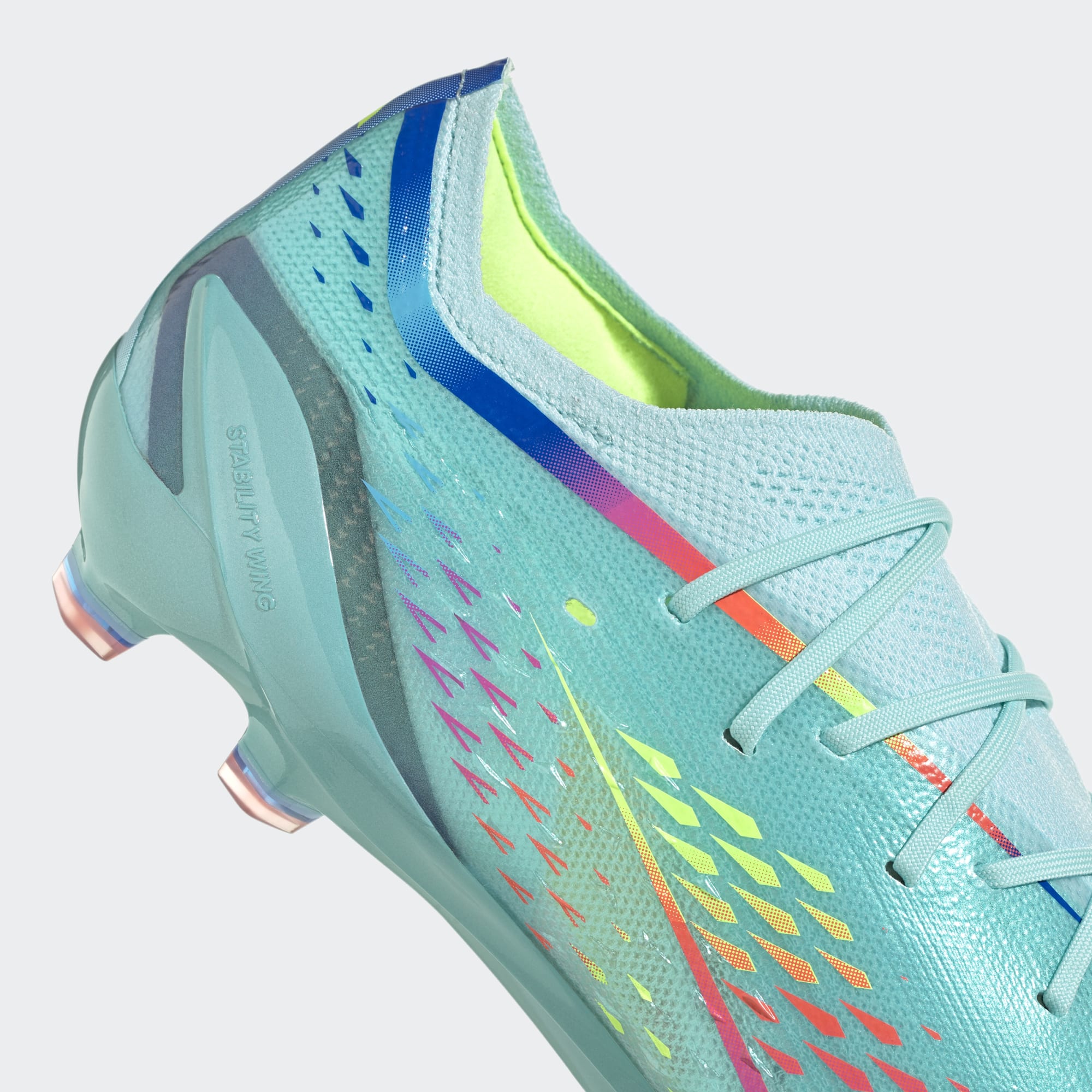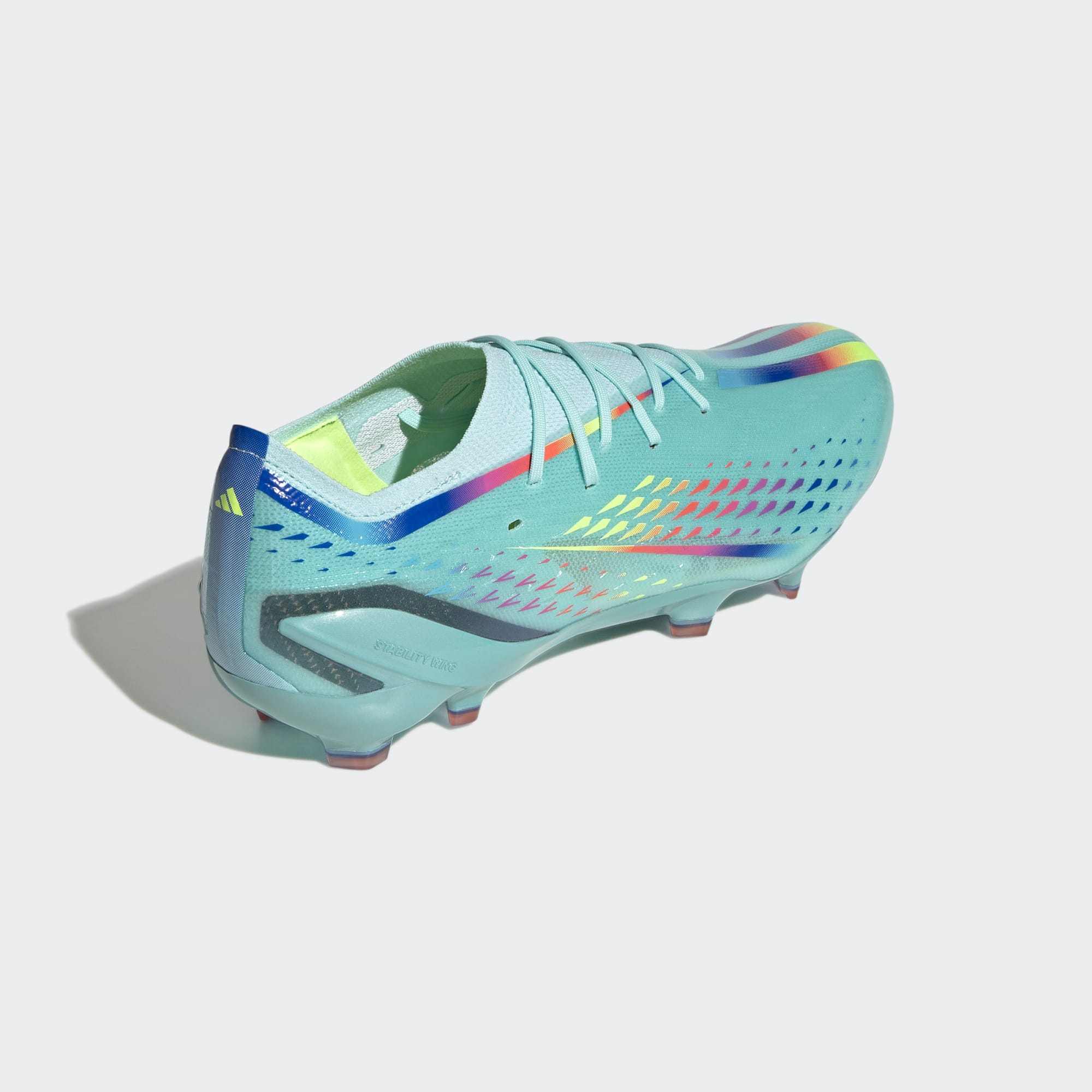 These adidas X Speedportal.1 FG Al Rihla football boots in Clear Aqua/Solar Red/Power Blue support instant reactions with a flexible, full-length Carbitex carbon plate on their firm ground outsole.