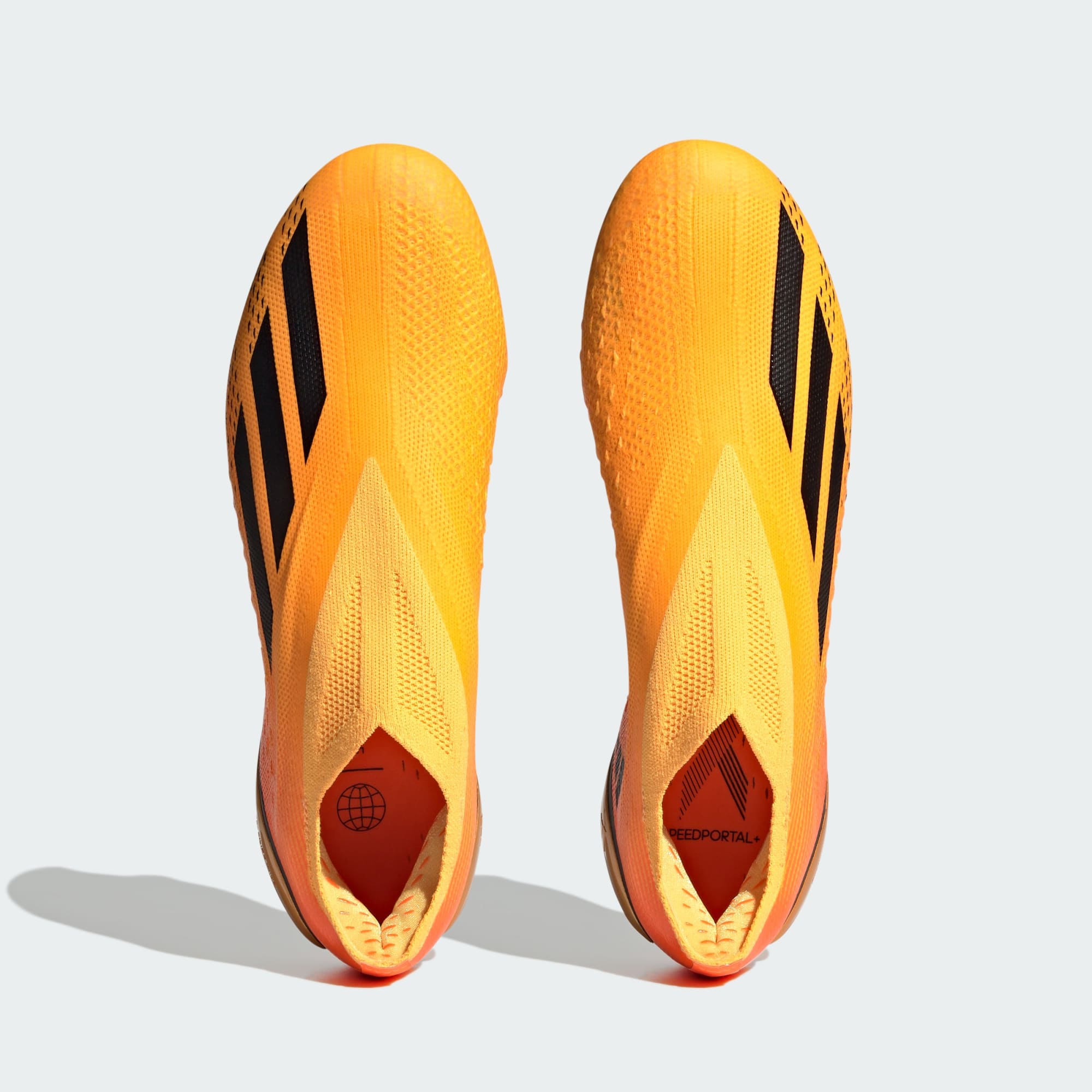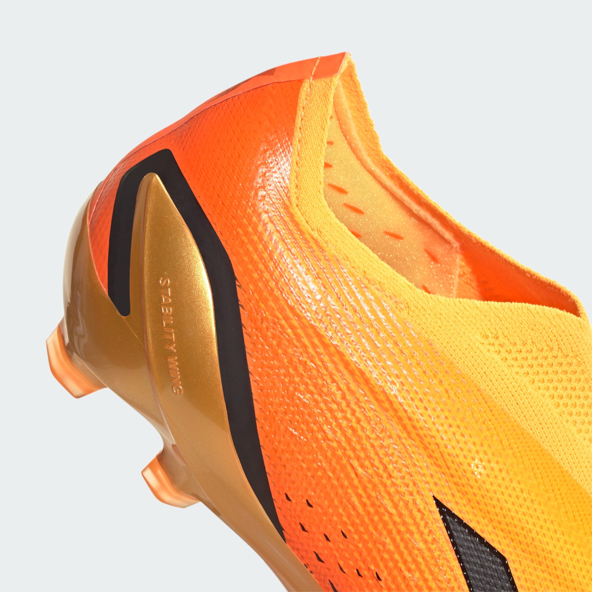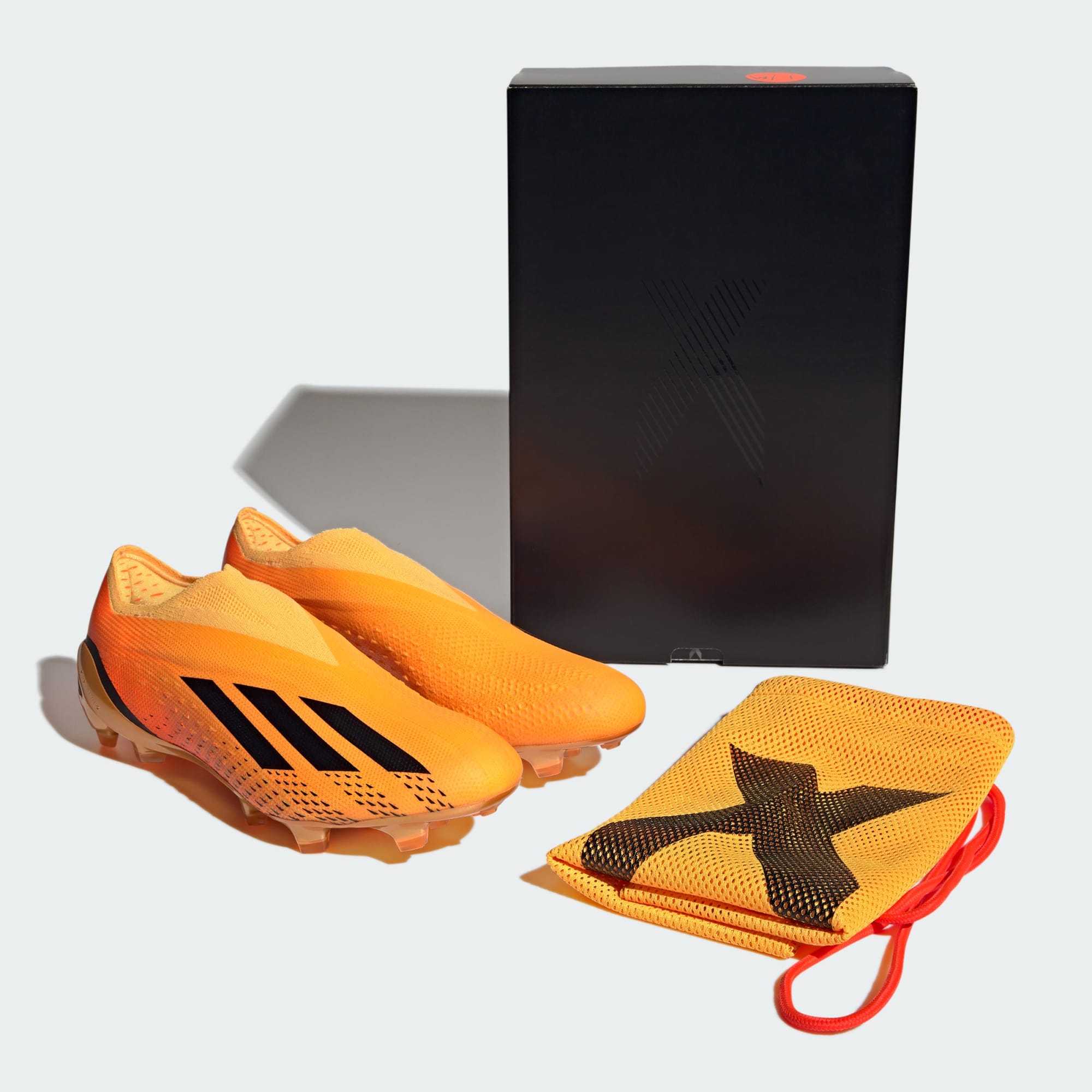 The laceless Adidas X Speedportal+ FG Heatspawn football boots in Solar Gold/Core Black/Team Solar Orange feature a Speedskin upper that is lightweight and fits snugly around the foot.