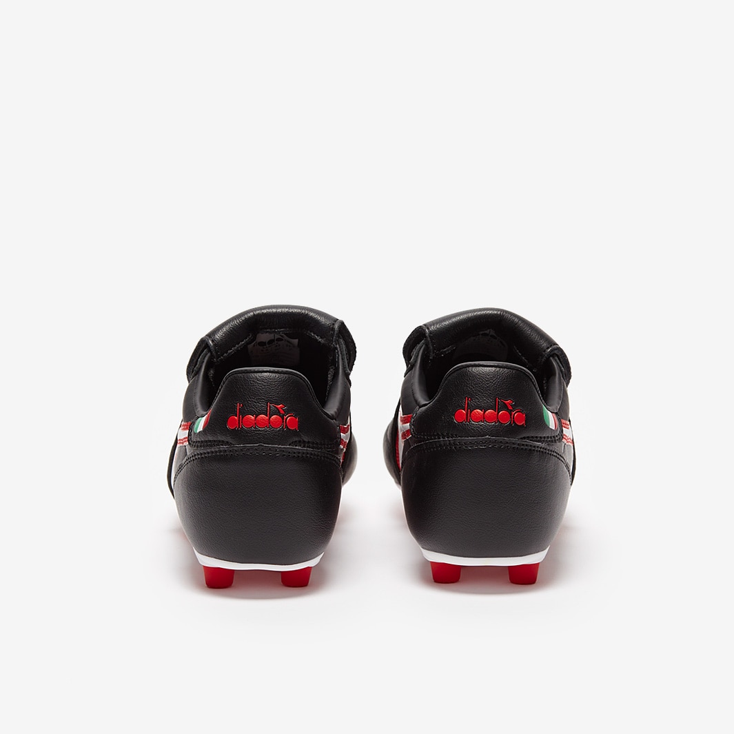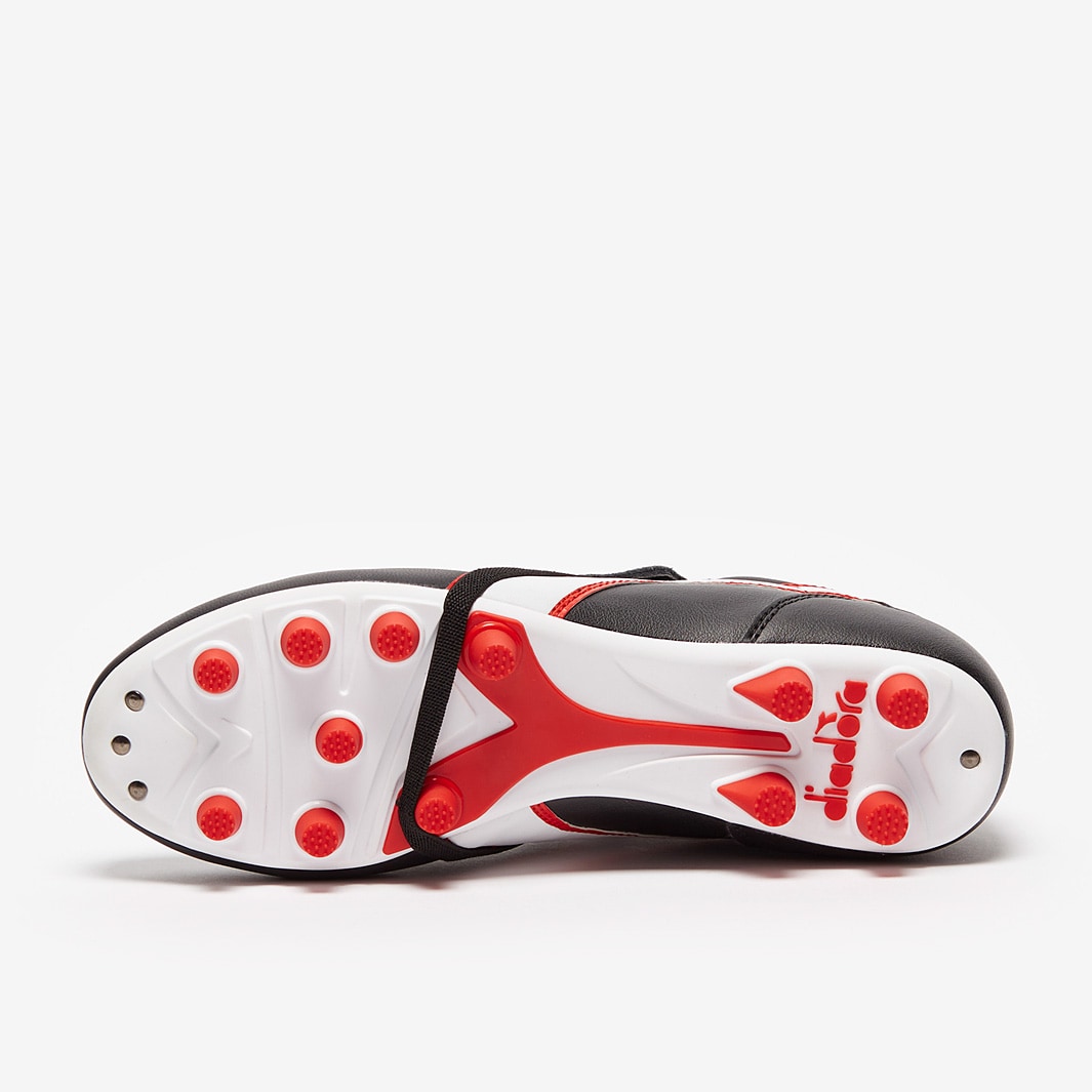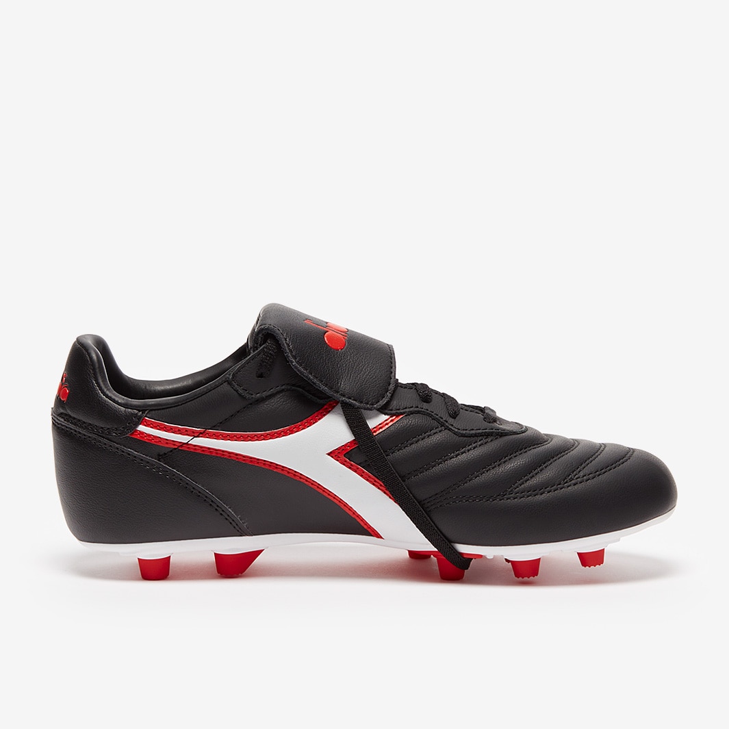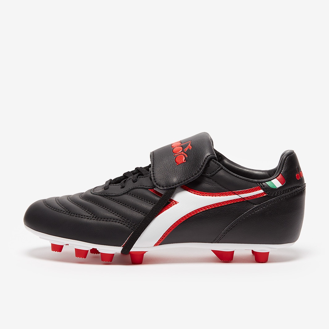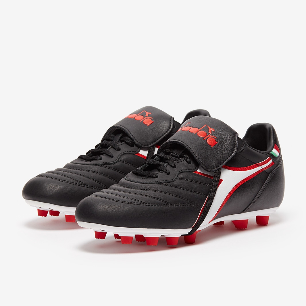 Introducing the brand-new Diadora Brasil Classico FG football boots in Black /White/Milano Red, featuring a classic foldover tongue.