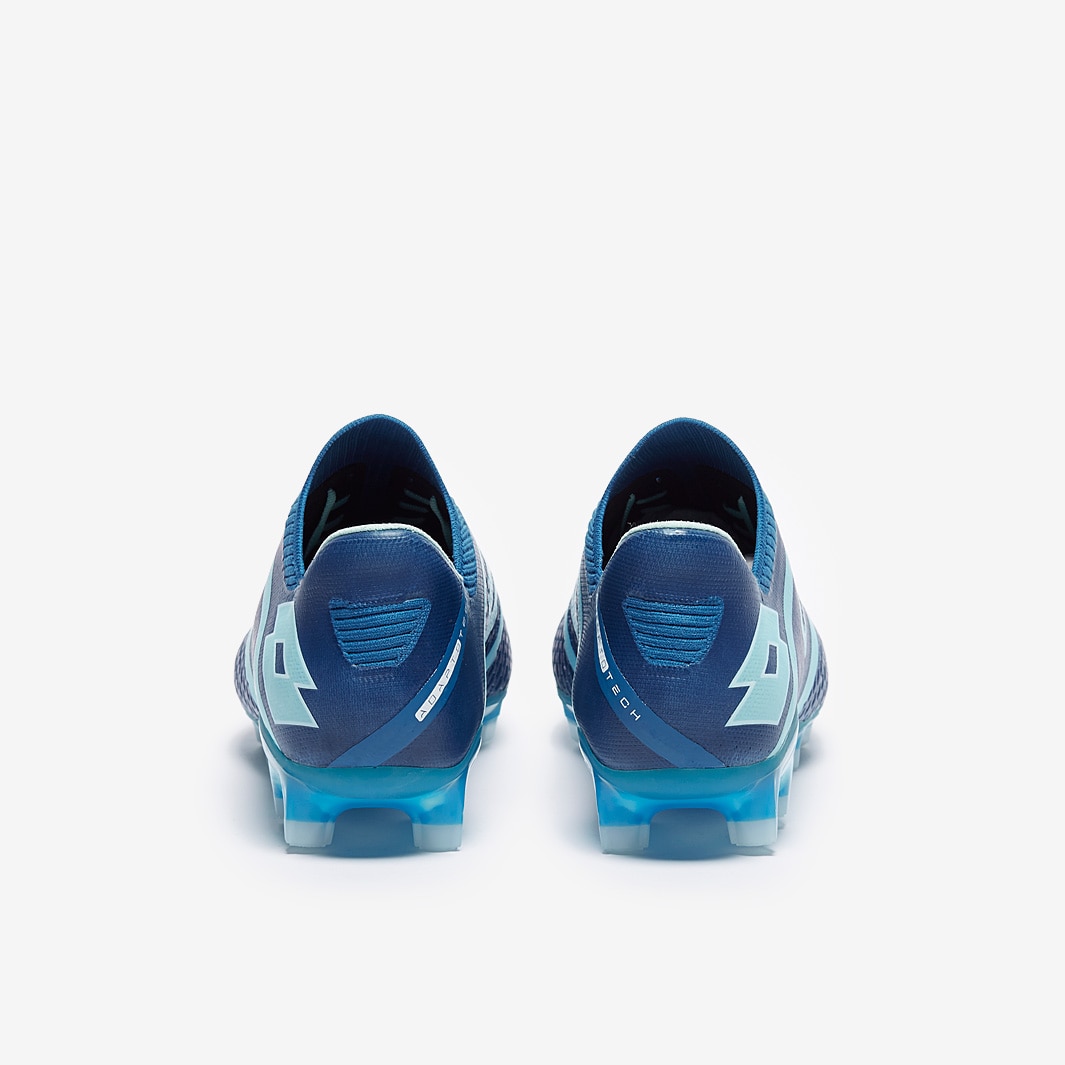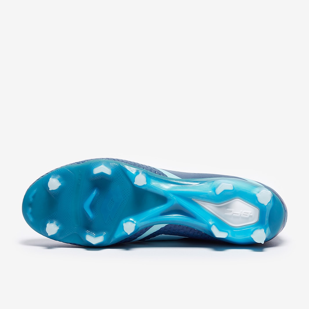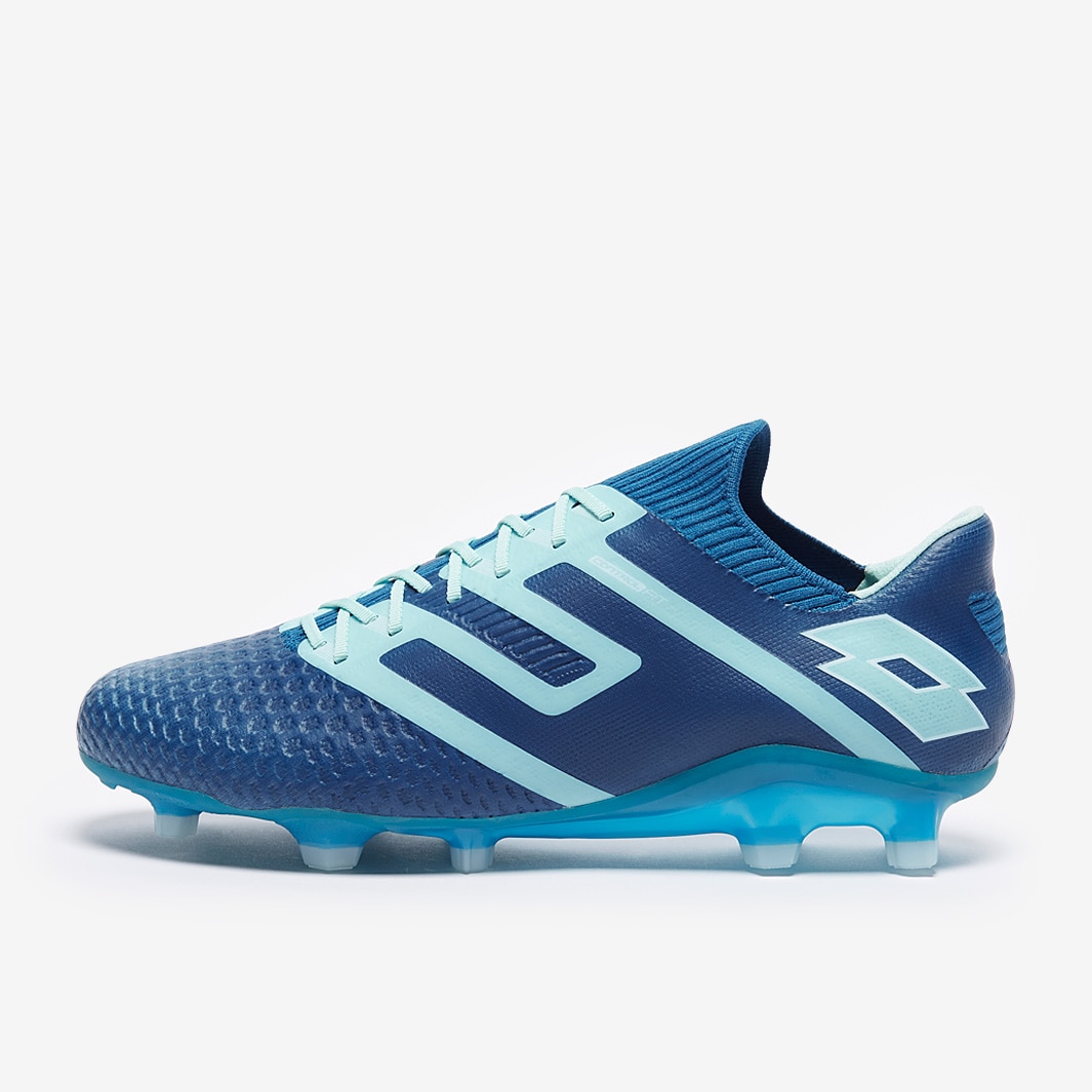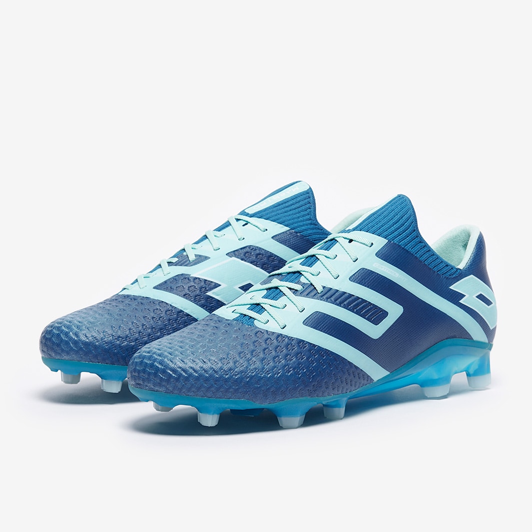 These are the Lotto Maestro 100 IV FG firm ground football boots in Mykonos Blue/Blue Paradise/White, featuring a new soleplate and heel unit to enhance support and stability as you move.