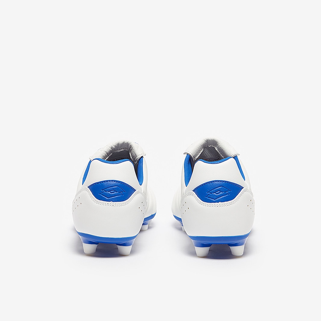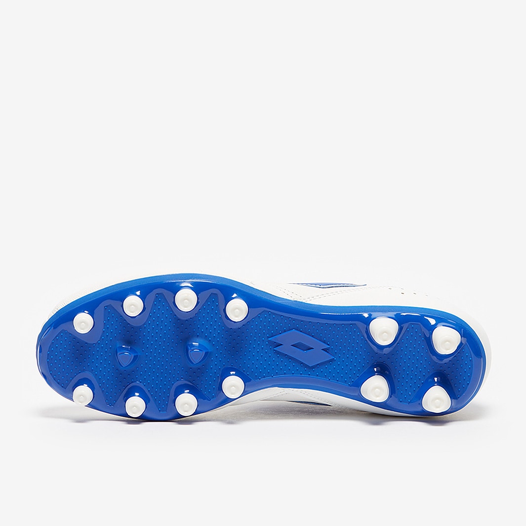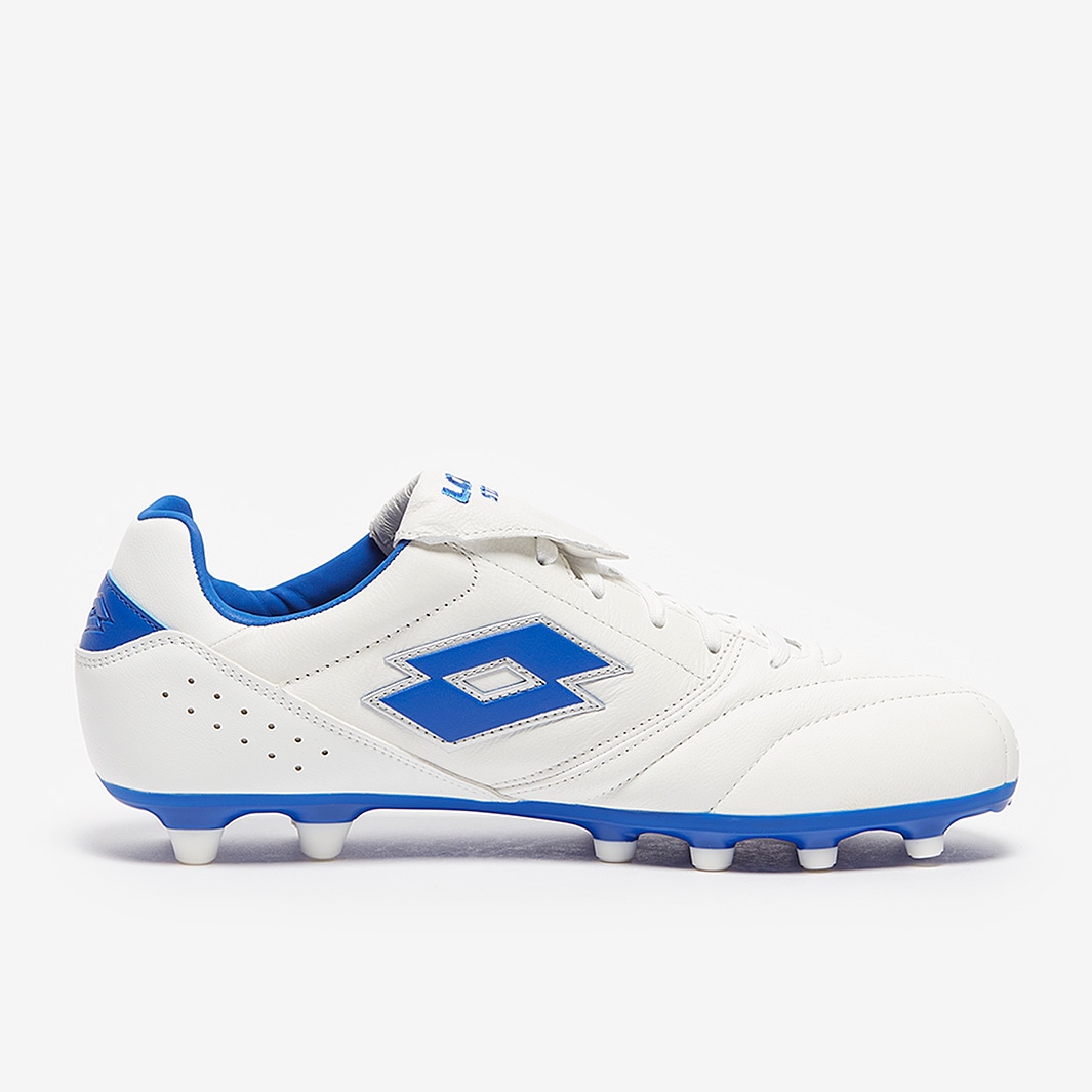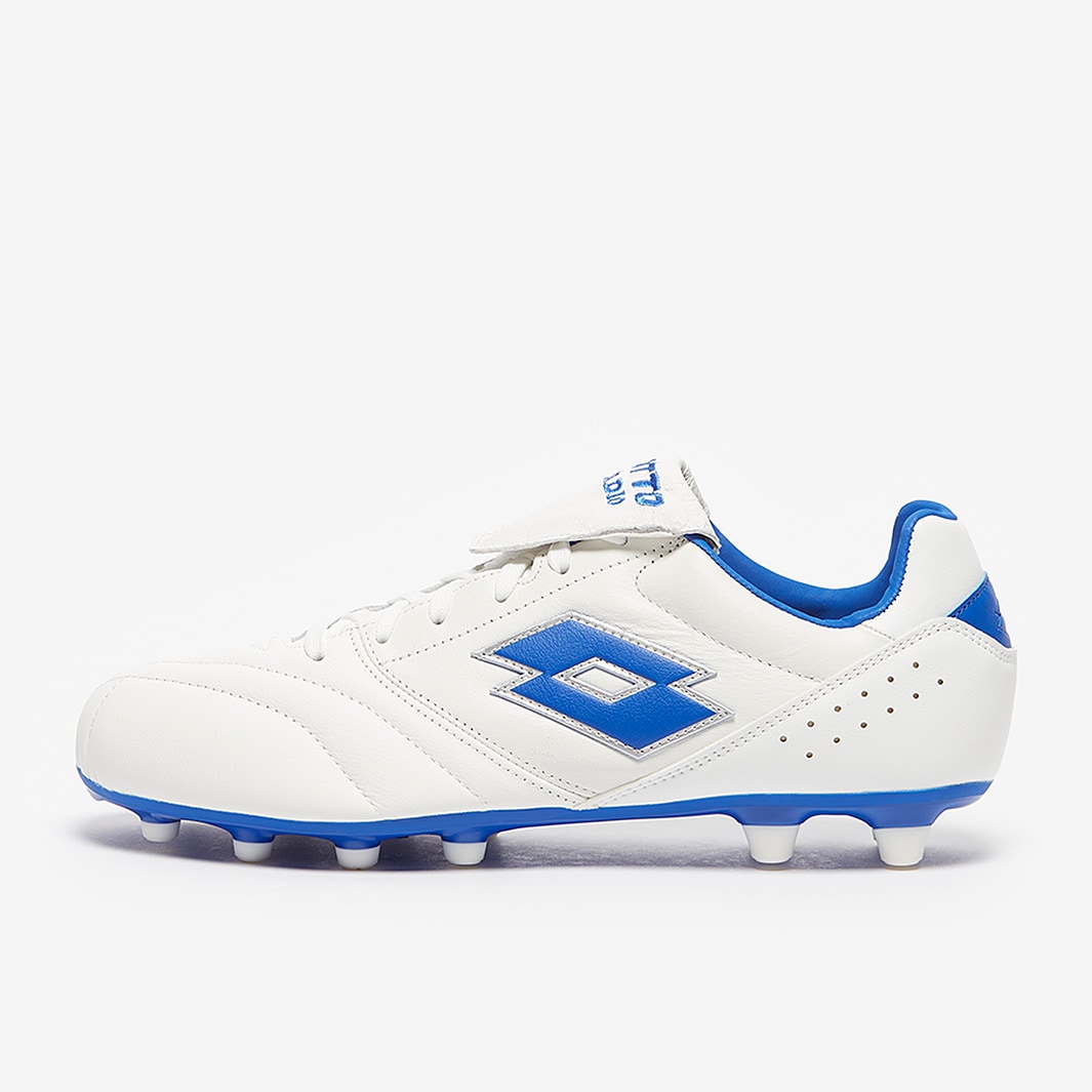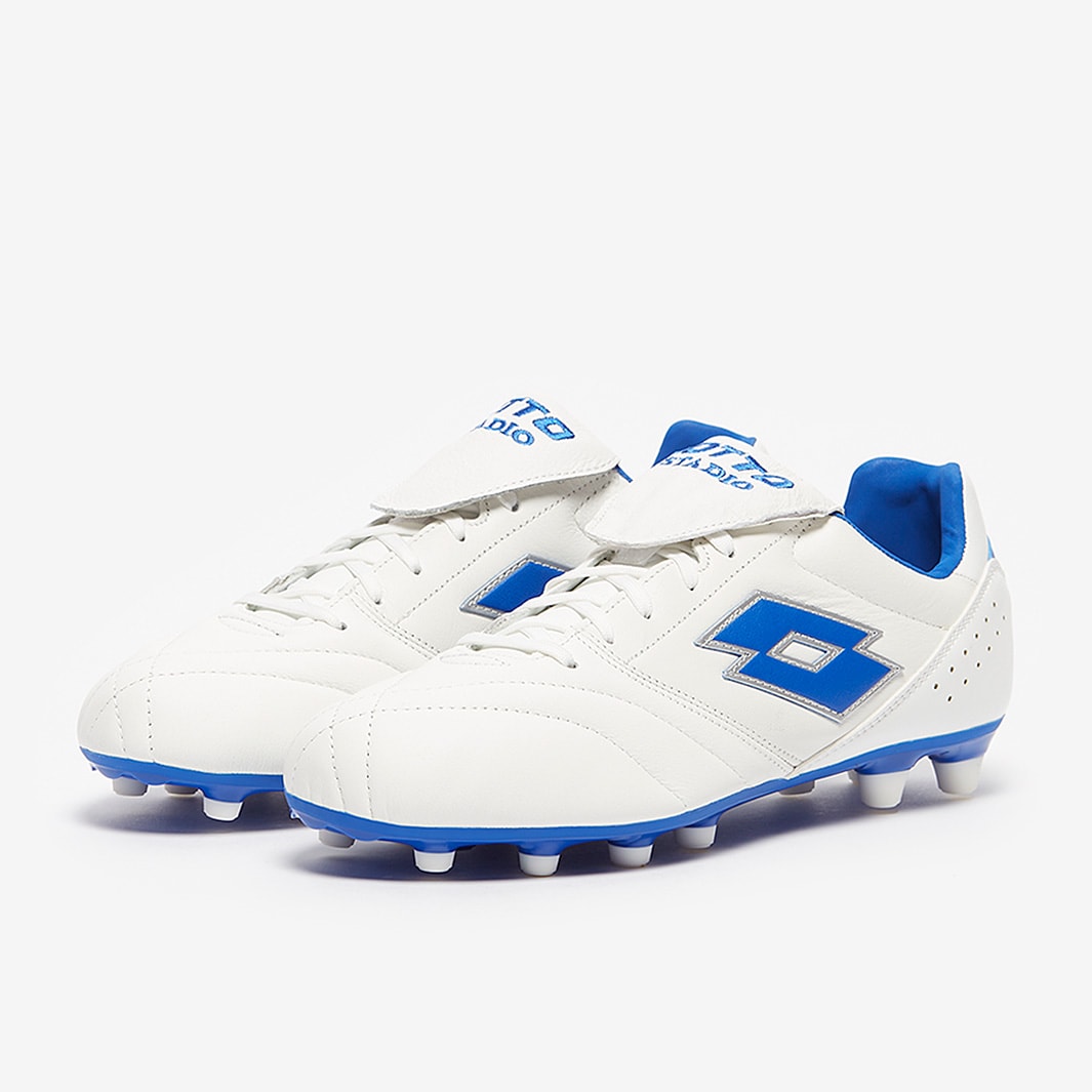 Control the game in comfort wearing Lotto Stadio 200 III FG football boots in All White/Pacific Blue, featuring a leather upper for a perfect first touch.