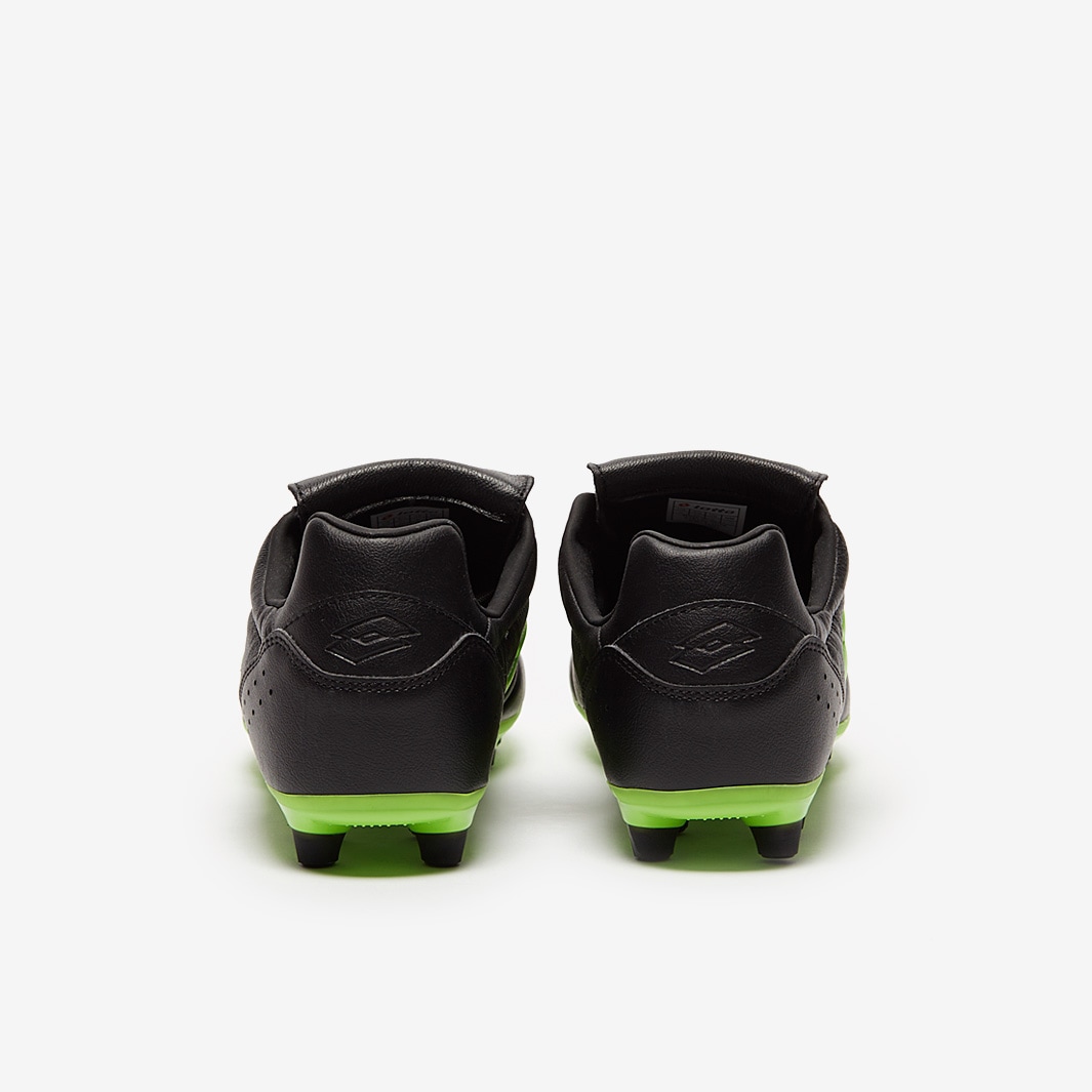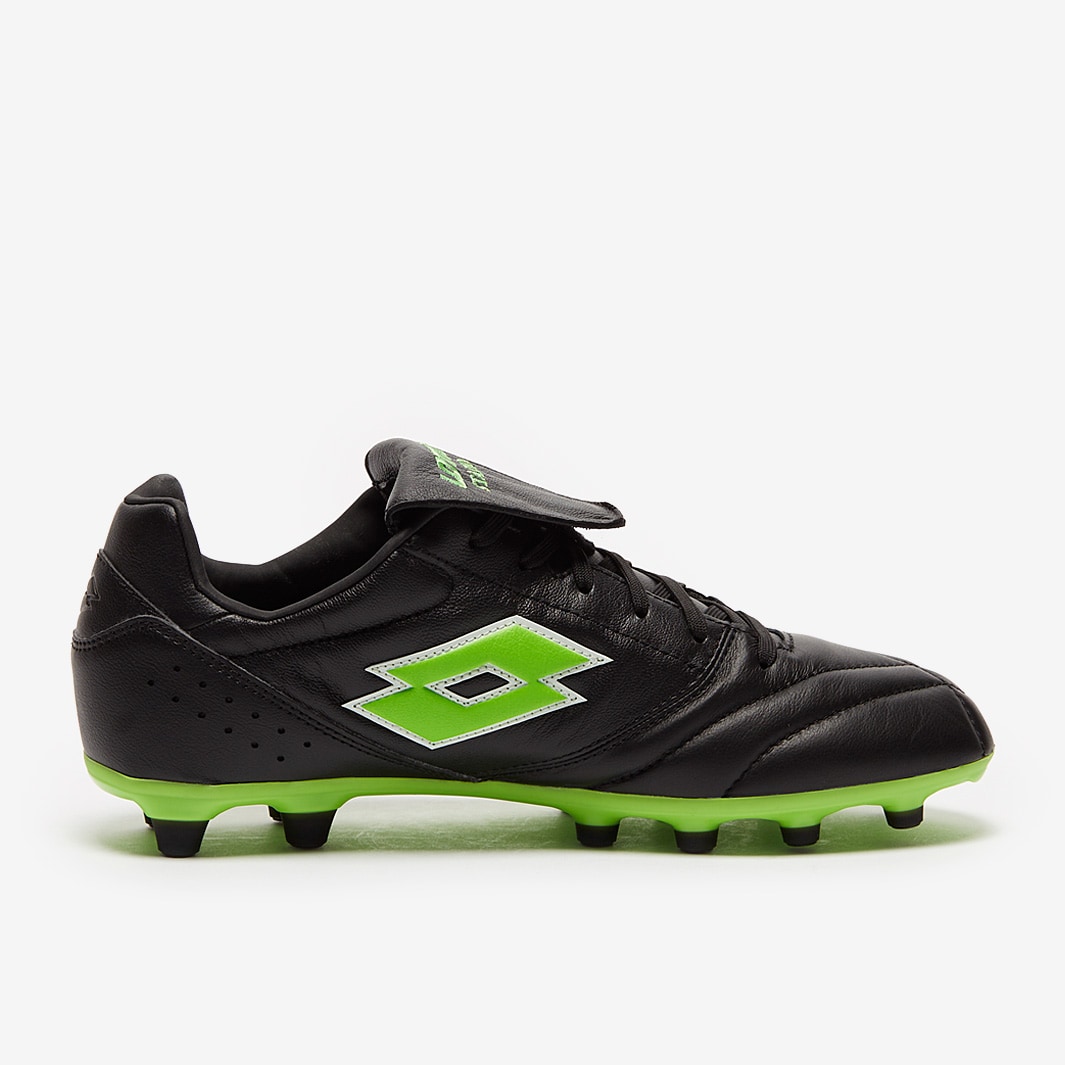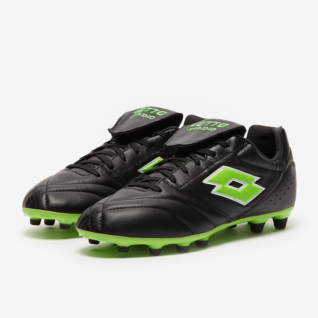 These are the Lotto Stadio 200 III FG football boots in Black/Spring Green, featuring a leather upper for a perfect first touch.
