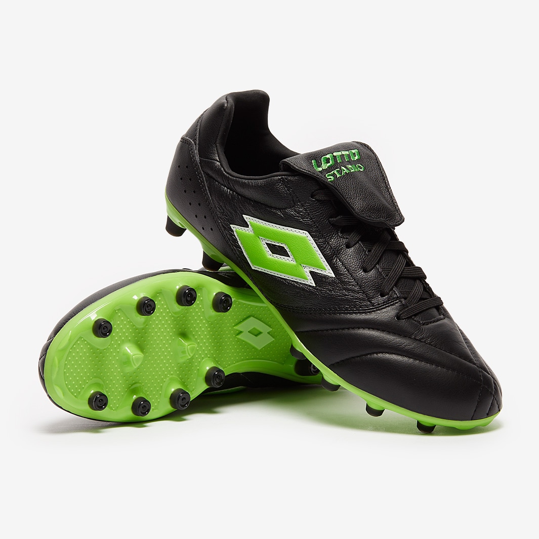 These are the Lotto Stadio 200 III FG football boots in Black/Spring Green, featuring a leather upper for a perfect first touch.