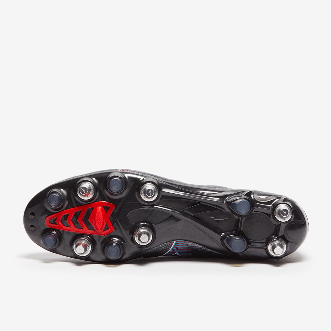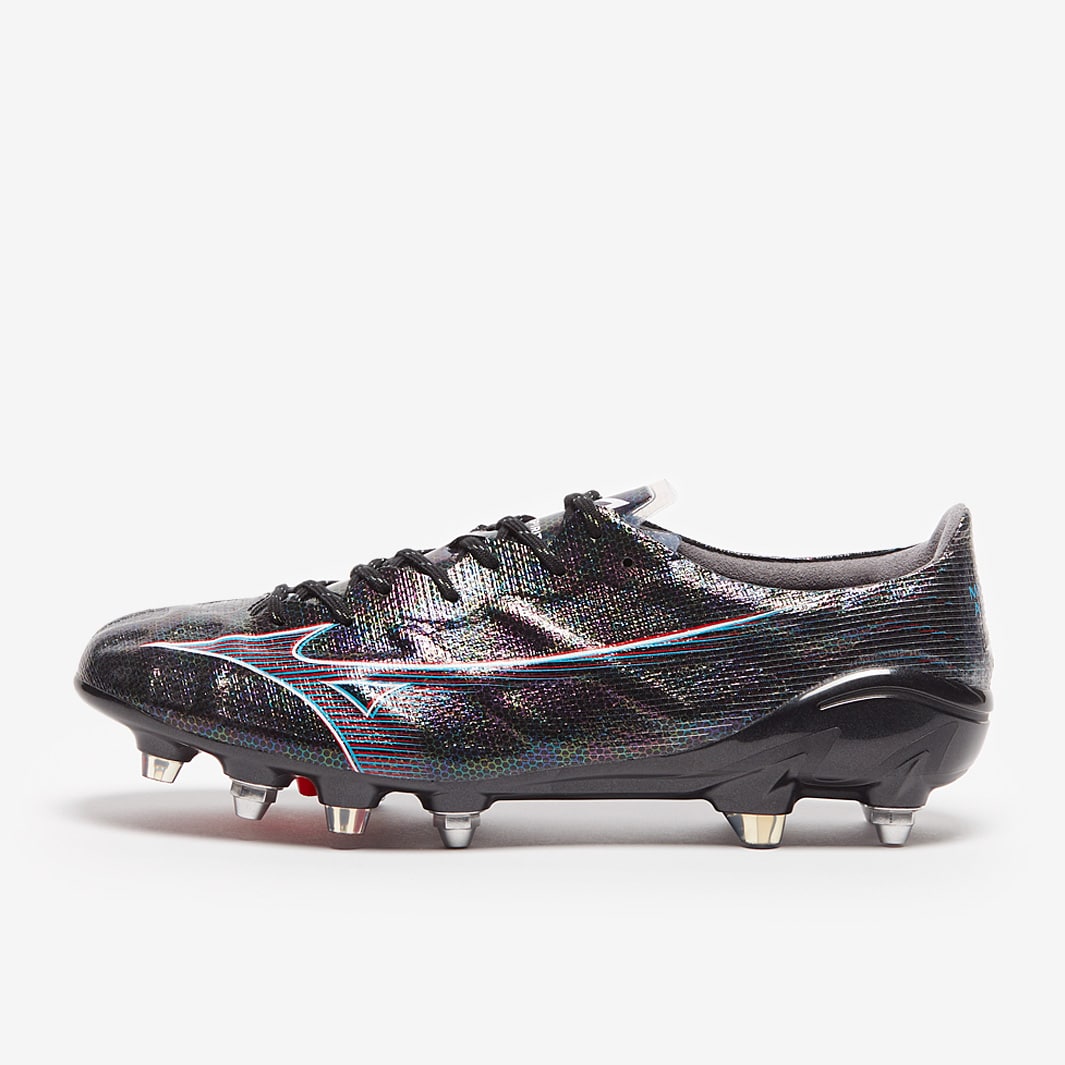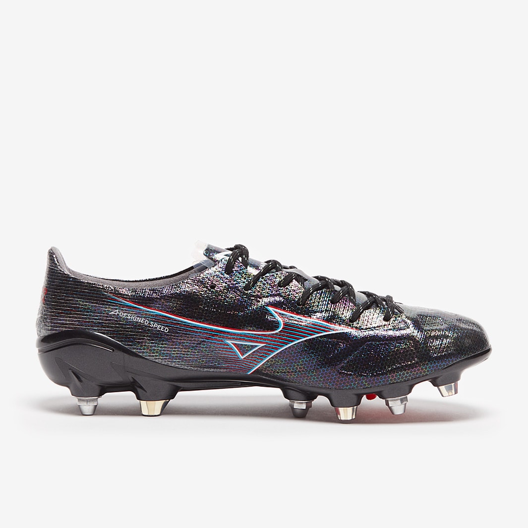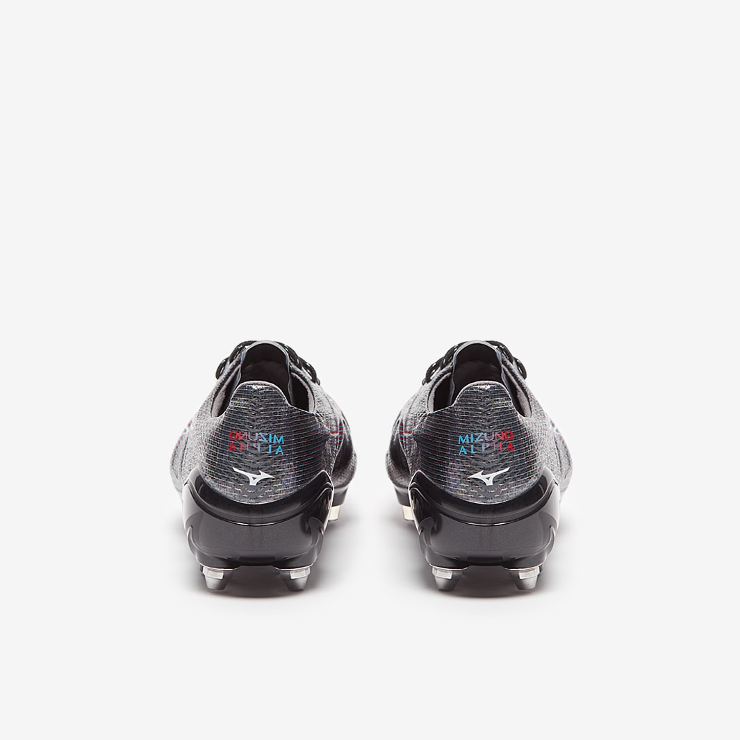 These are the new Mizuno Alpha Made In Japan SG Mix football boots in Black/Ignition Red, designed to enhance speed and agility on the pitch.