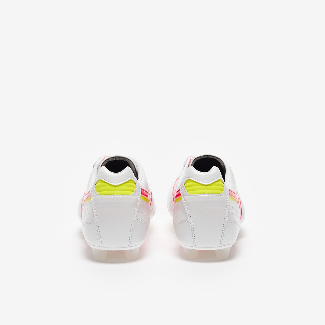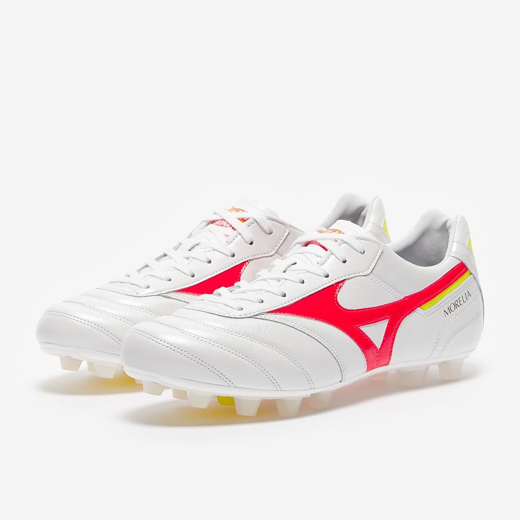 Elevate your game with the Mizuno Morelia II Japan FG football boots in White/Fiery Coral/Bolt, boasting the prestigious "Made in Japan" quality for unmatched confidence in your play.