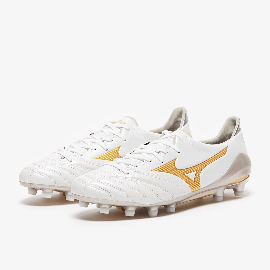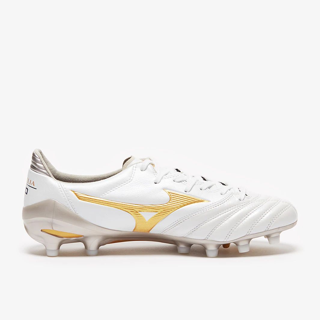 The Mizuno Morelia Neo II FG football boots in white and gold have an ultra-thin, super-soft and lightweight Kangaroo leather forefoot which moulds to the shape of your foot, resulting in a fantastic personalised fit on firm, natural ground.
