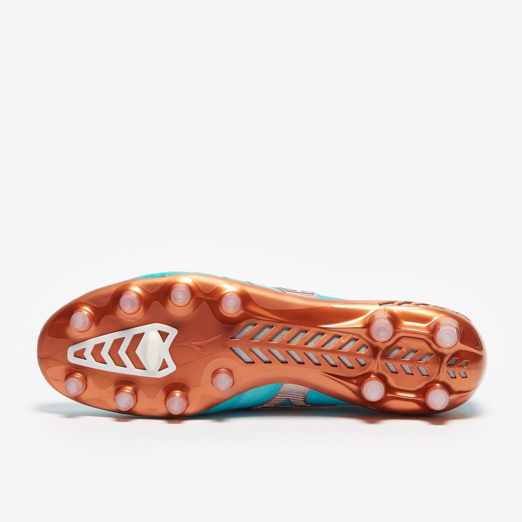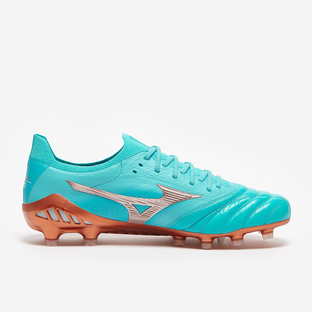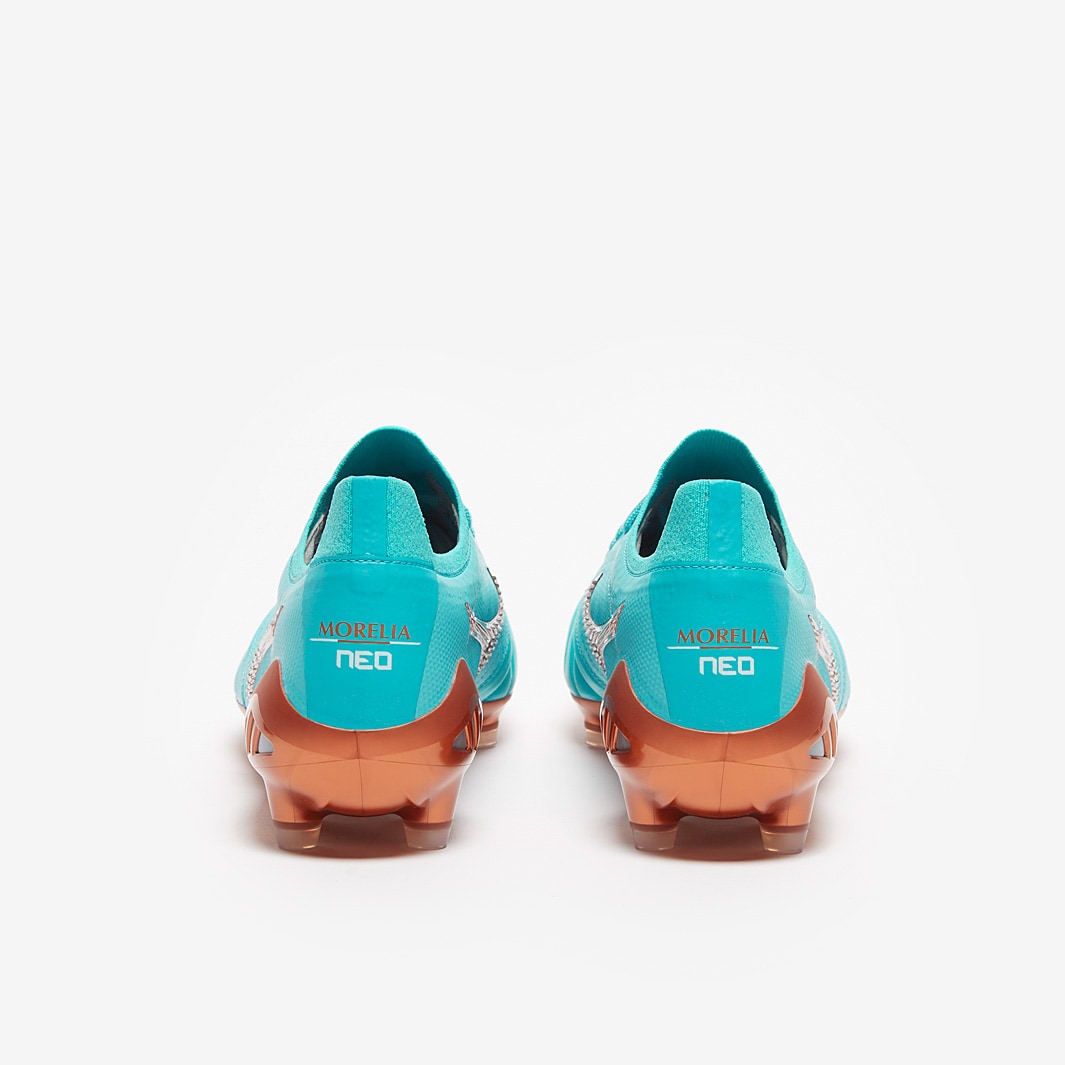 These are the new Mizuno Morelia Neo 3 β Made In Japan FG Azure Blue football boots in Blue Curacao/Galaxy Silver/Blue Curacao, featuring a lightweight, streamlined design that’s refined for absolute speed.