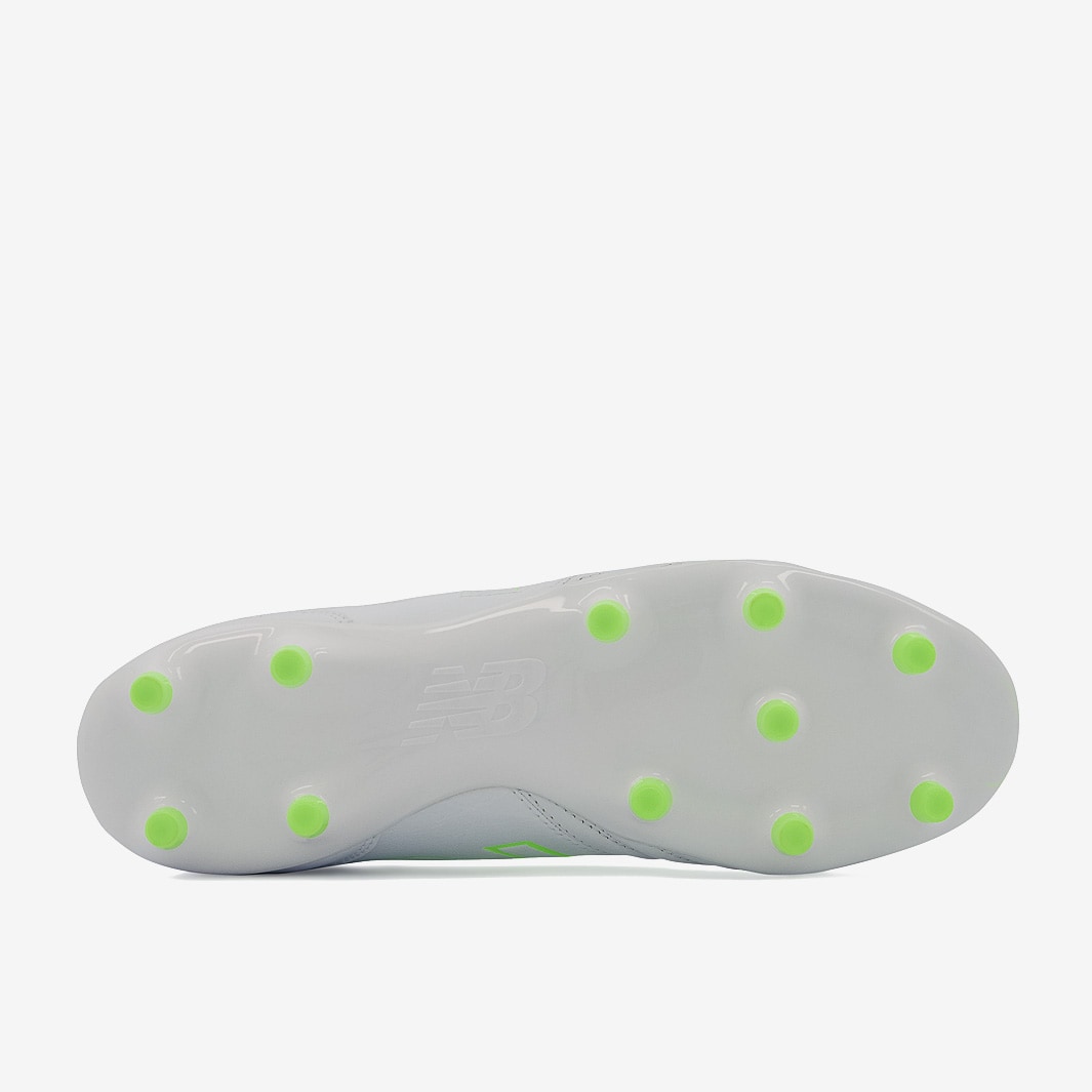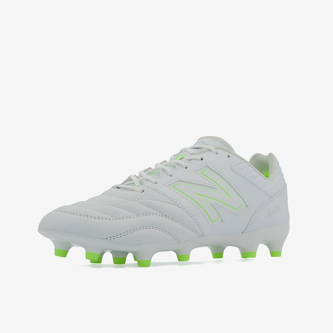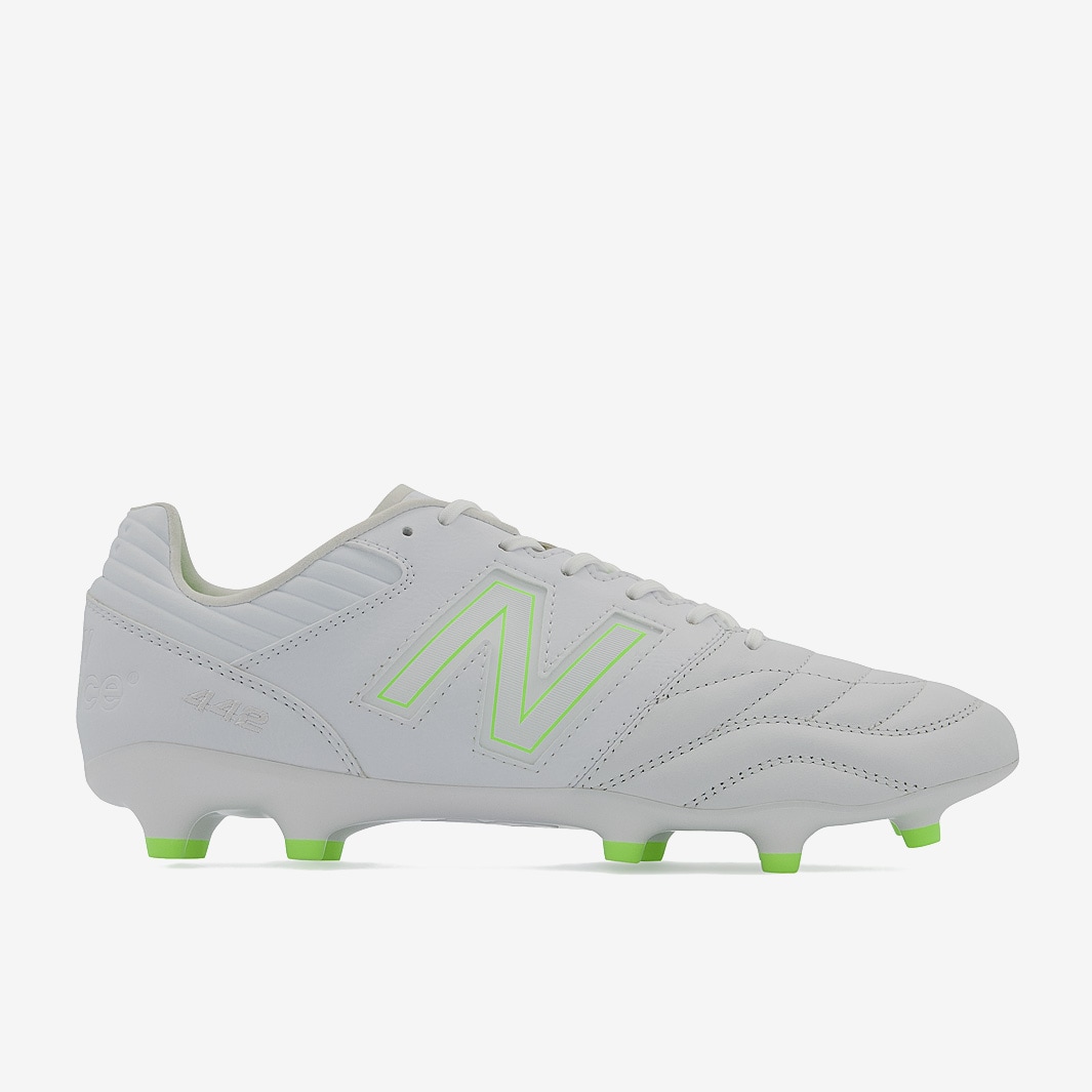 These are the New Balance 442 V2 Pro FG Tri-Aura football boots in White/Silver, a premium K-leather boot updated with a new stitching pattern and elite-level nylon soleplate.