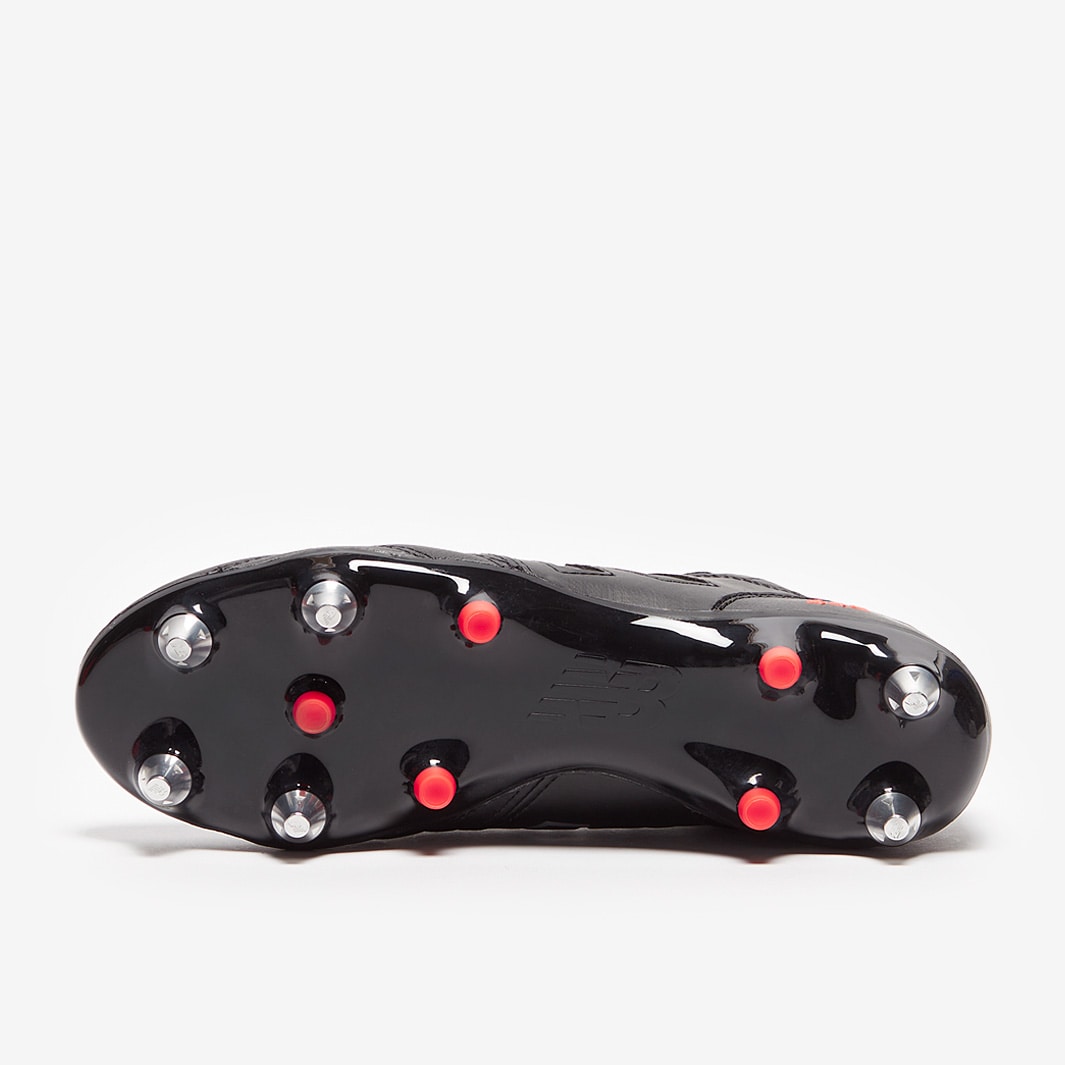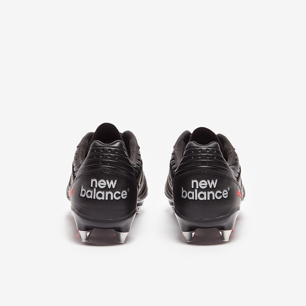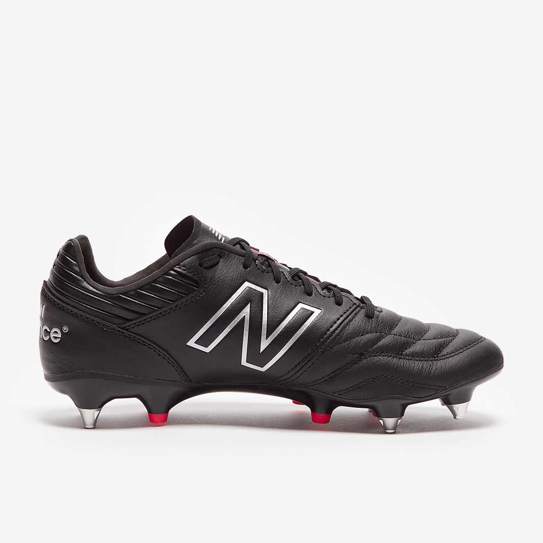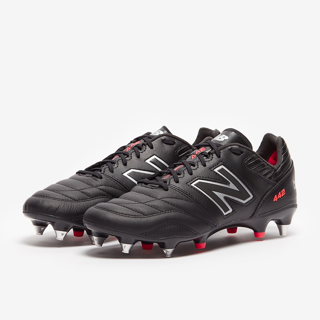 These are the New Balance 442 V2 Pro SG football boots in Black/Silver, a premium K-leather boot updated with a new stitching pattern and elite-level nylon soleplate.