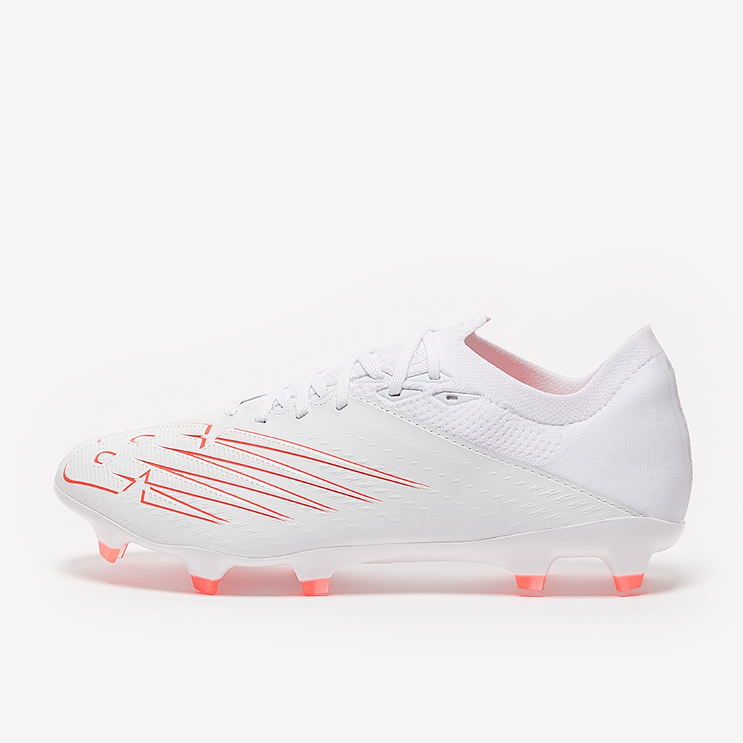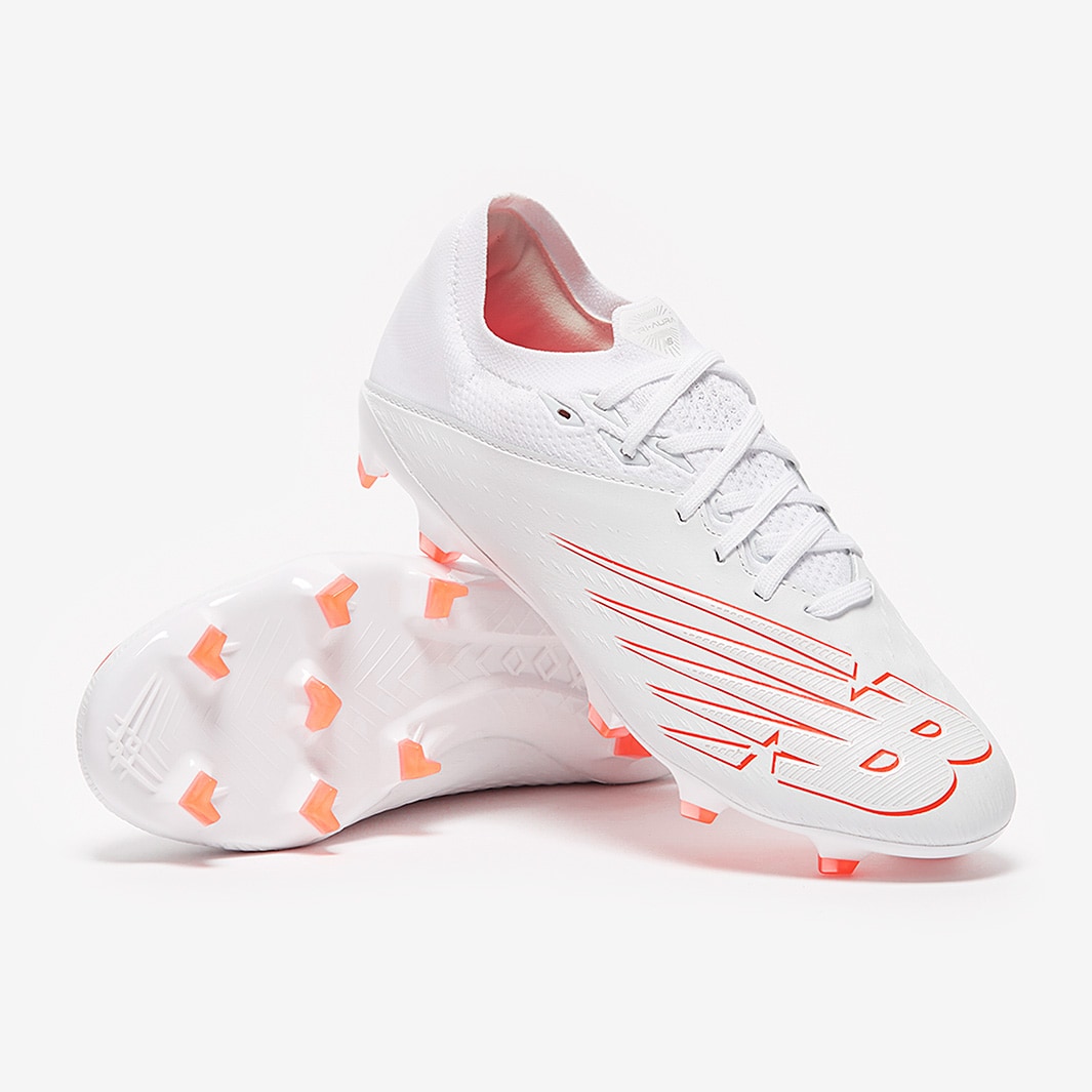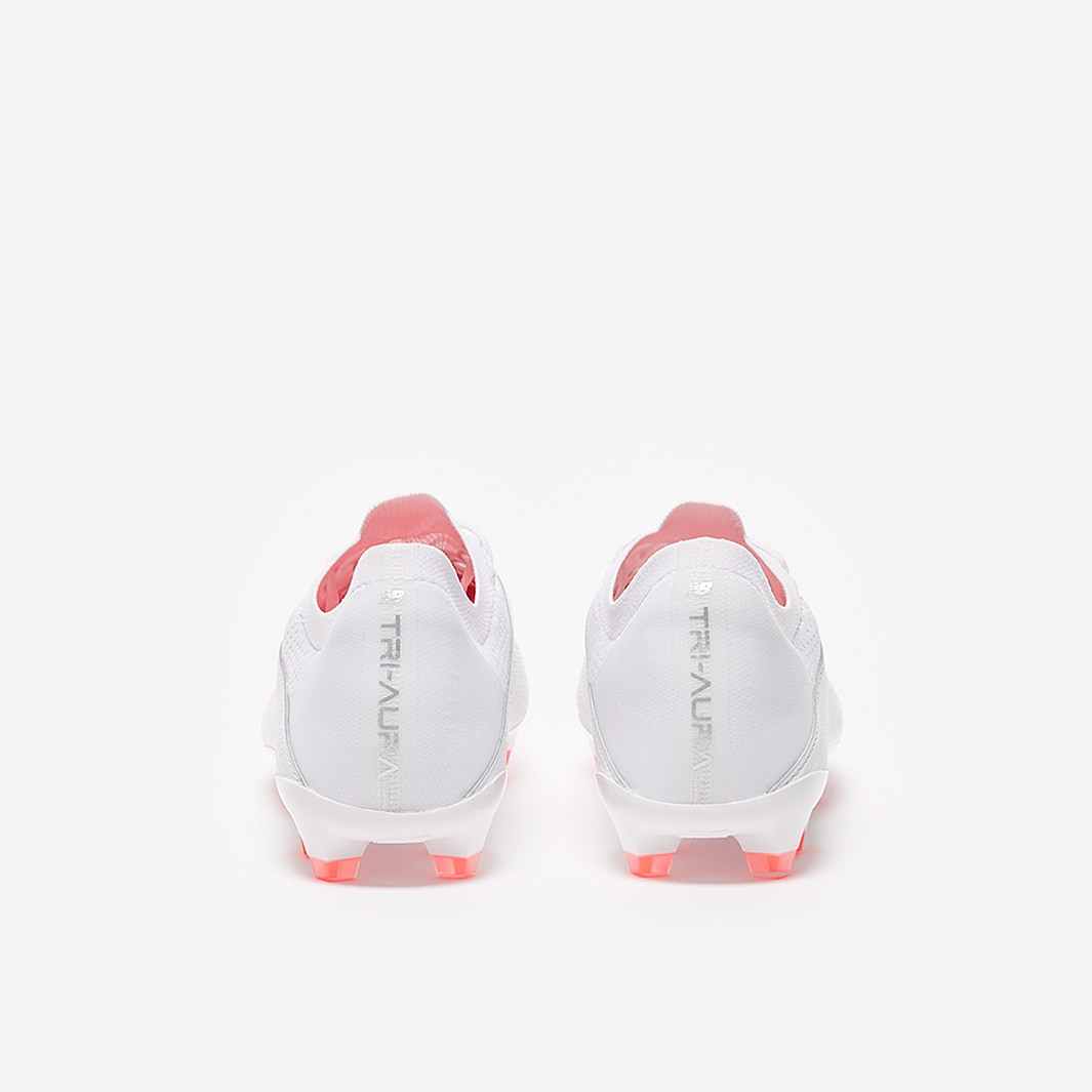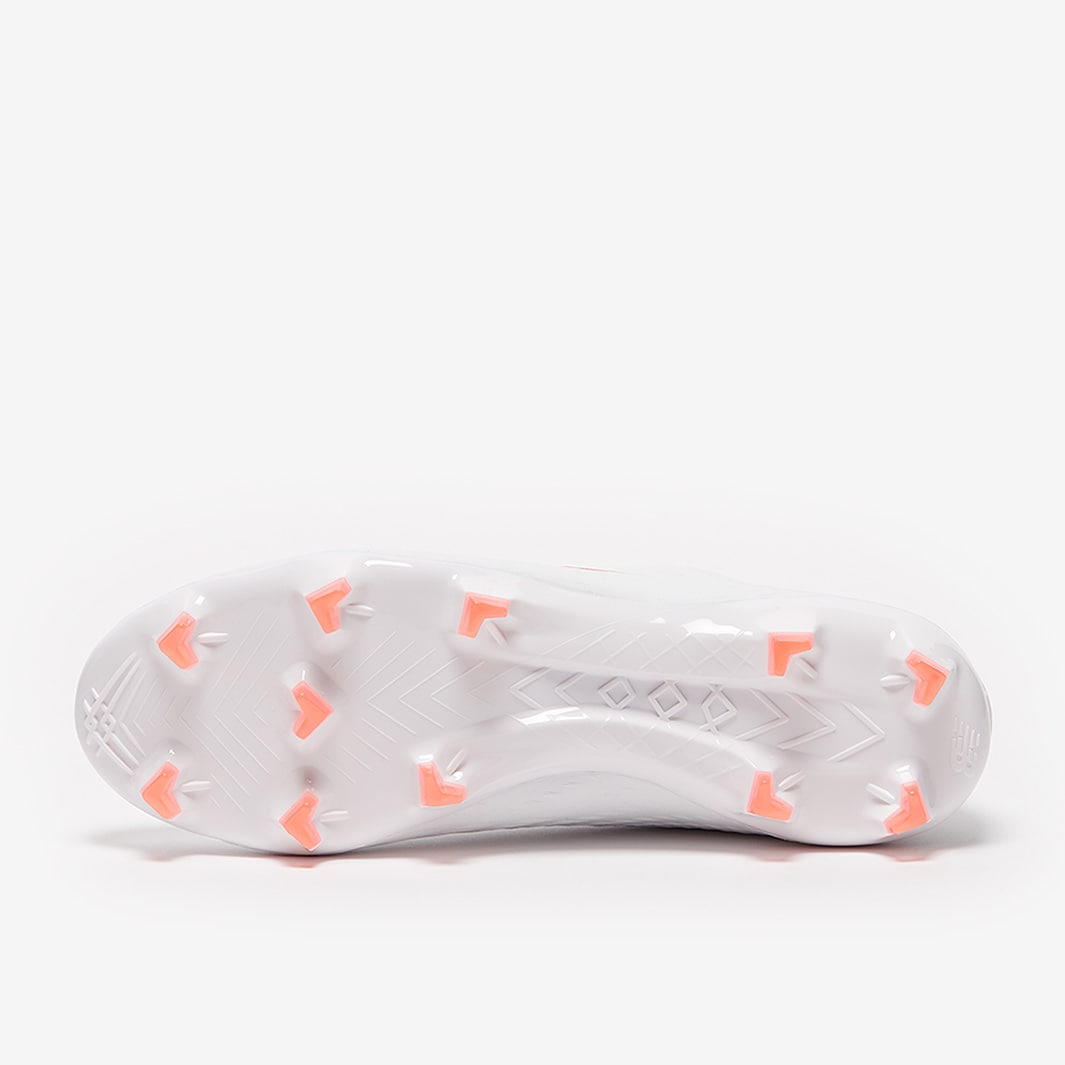 These are the New Balance Furon V6+ Pro Leather FG Tri-Aura football boots in White/White/Orange, featuring a refined upper for superior ball contact and streamlined speed.