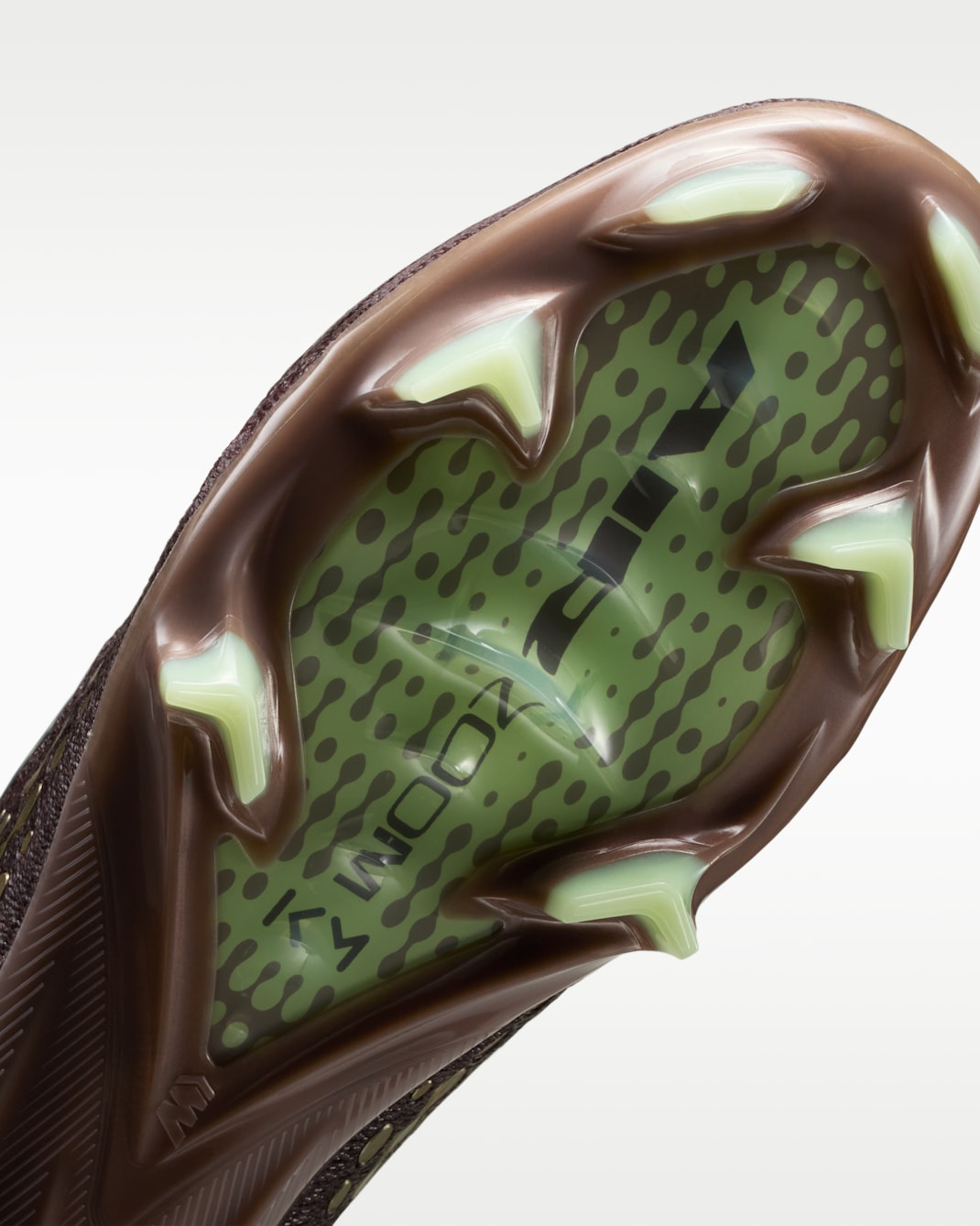 The full Flyknit construction incorporates AtomKnit zones along the sides to reduce weight and provide targeted support. A Dynamic Fit collar wraps the ankle in stretch knit fabric for a secure fit. The soleplate is finished in a translucent brown tone with green stud tips and visible Zoom Air graphics beneath the forefoot.