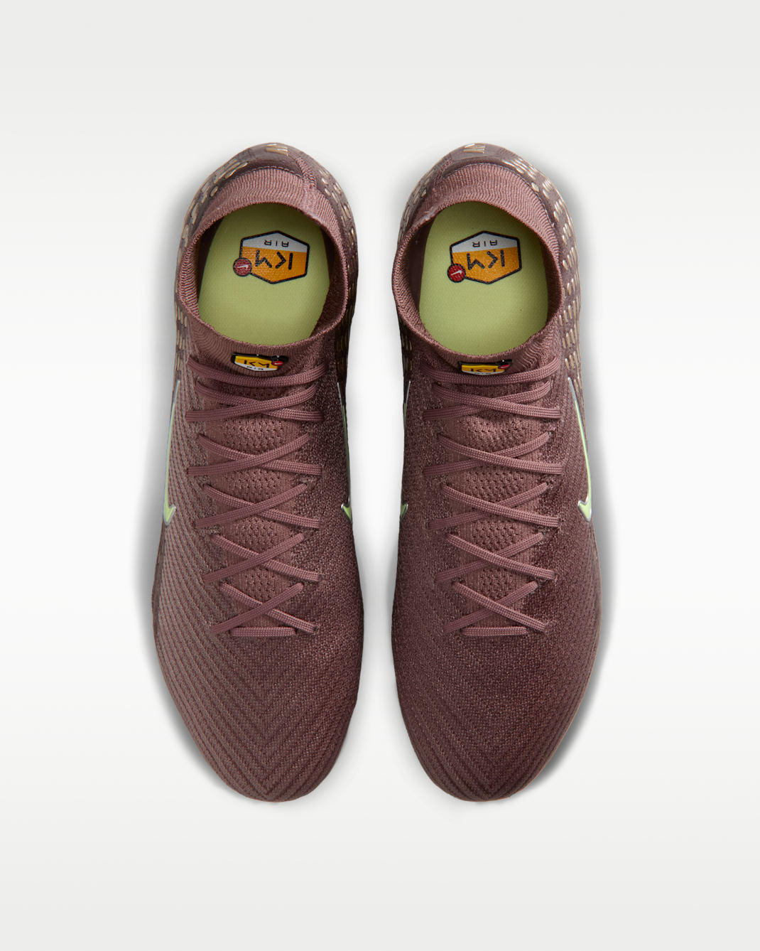 The Nike Mercurial Superfly 10 Elite features a deep plum Flyknit upper combined with Nike Gripknit technology across the forefoot. The textured Gripknit surface increases ball contact area and is engineered to provide consistent grip in both wet and dry conditions. Micro moulded detailing works with the upper construction to enhance boot to ball interaction at high speed. A metallic silver Swoosh with green outline appears on the lateral side, with Kylian Mbappé specific KM Air branding positioned on the collar and insole.