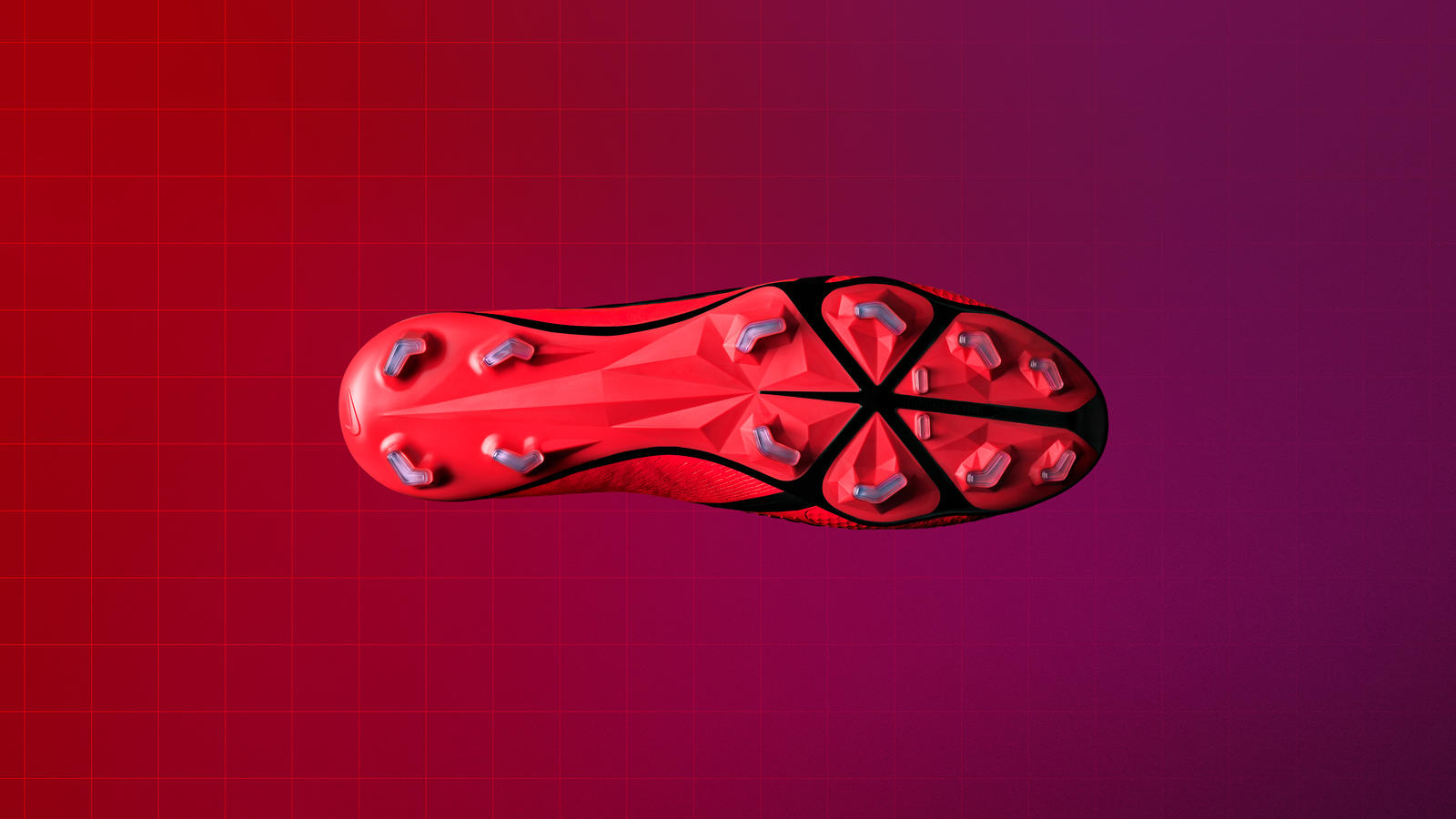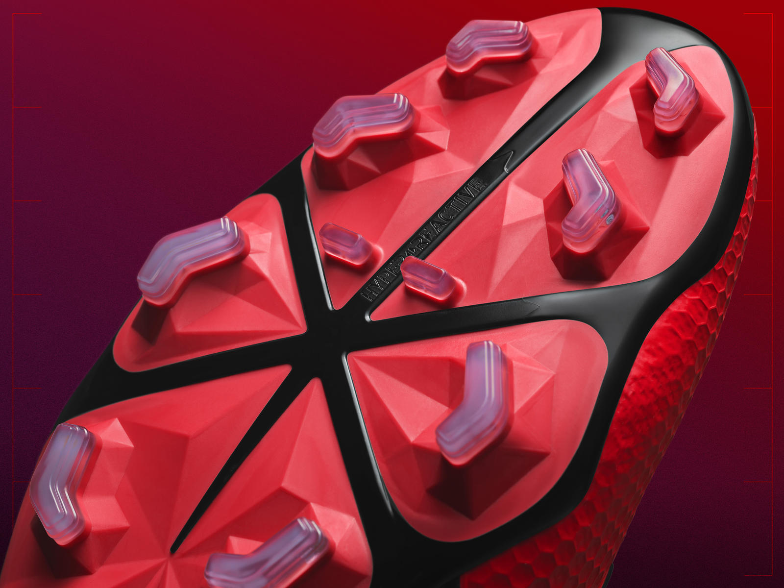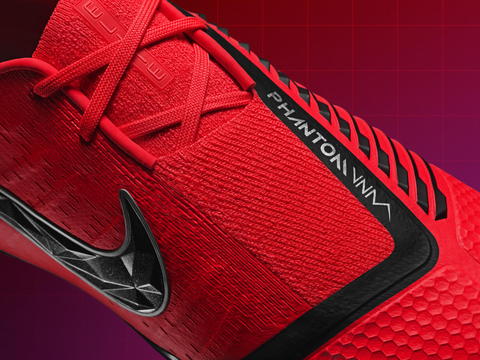 The 13 ridges of the Precision Pwr strike zone are set at specific angles and ascending heights to help keep the ball down if it is mishit and to provide bite on the ball. Much like its counterpart in the Phantom family, PhantomVNM increases the strike zone area by covering the laces, giving PhantomVNM a 30-percent larger strike zone than Hypervenom3. But, PhantomVNM does build off the Hyper-Reactive plate made famous on the Hypervenom3. The plate, which takes inspiration from Nike Free, is flexible in the forefoot for toeing off the ground with torque for sharp cuts. This iteration of the HyperReactive plate also strays from traditional plates by exposing its faceted structure. This aesthetic also carries over to the premium faceted Swoosh.