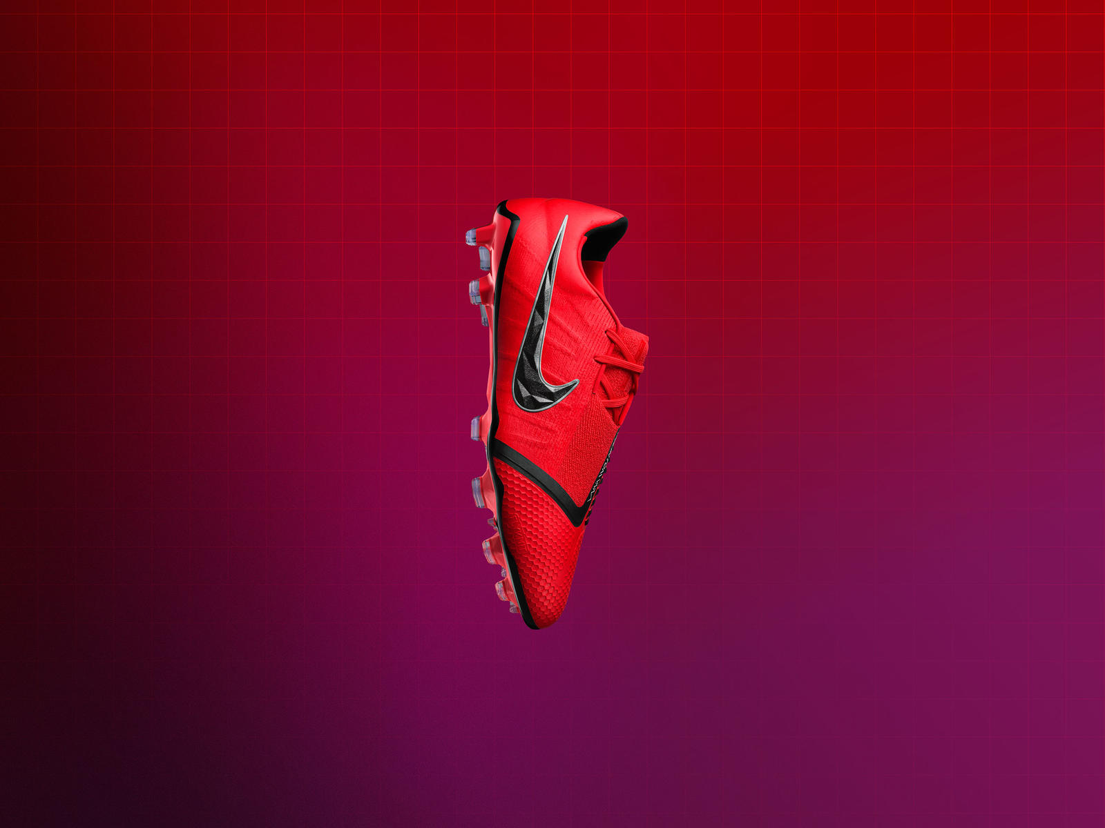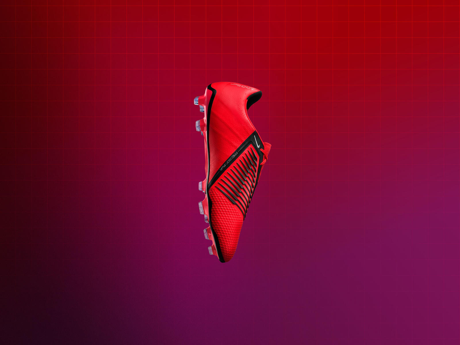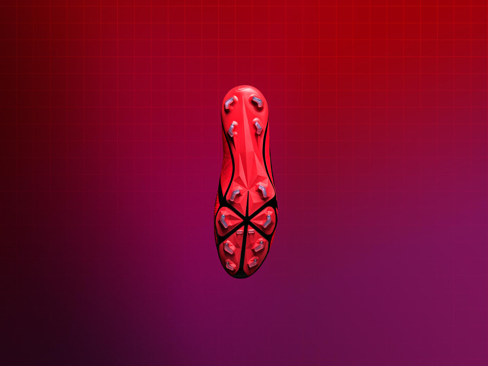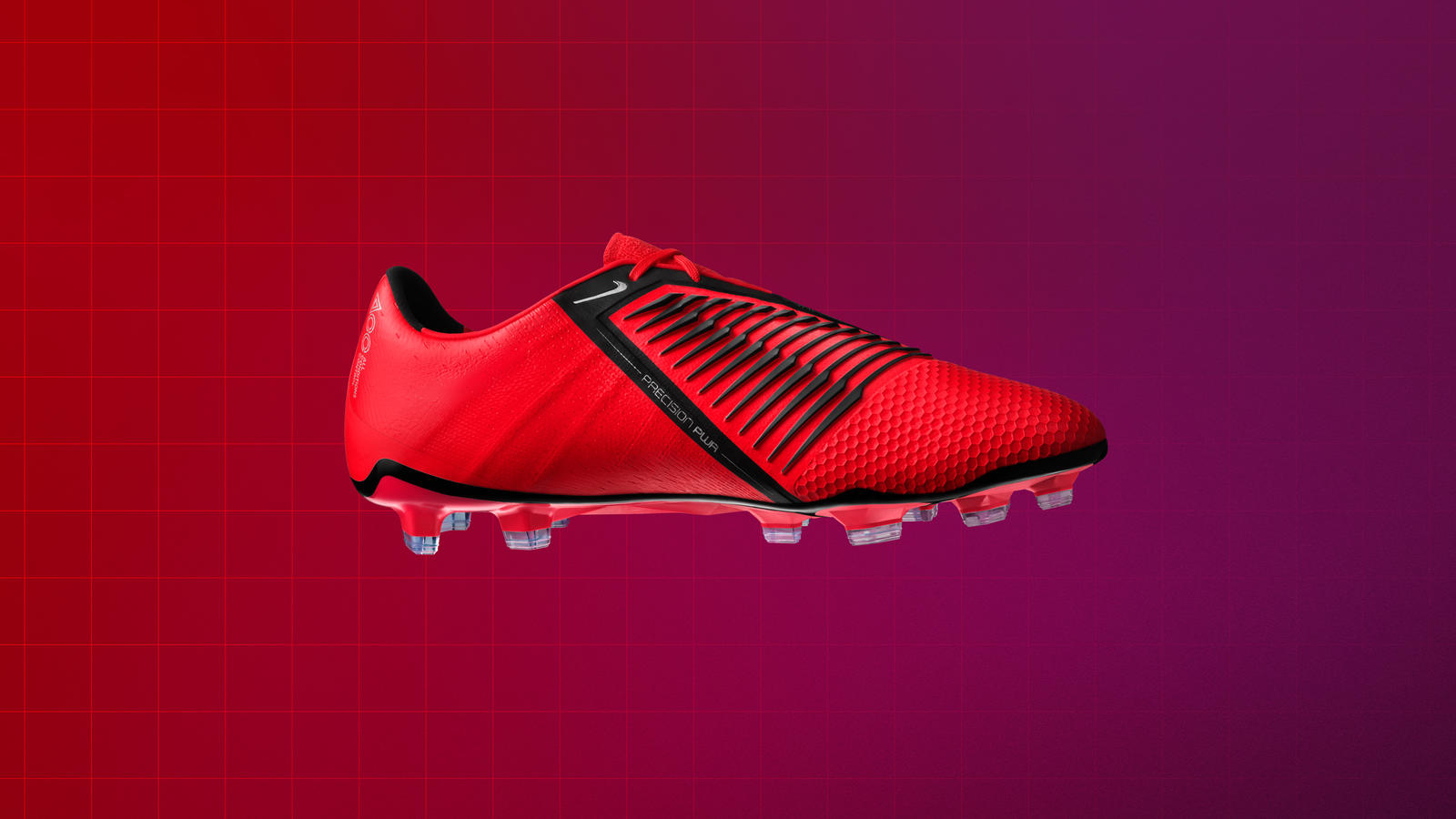 The 13 ridges of the Precision Pwr strike zone are set at specific angles and ascending heights to help keep the ball down if it is mishit and to provide bite on the ball. Much like its counterpart in the Phantom family, PhantomVNM increases the strike zone area by covering the laces, giving PhantomVNM a 30-percent larger strike zone than Hypervenom3. But, PhantomVNM does build off the Hyper-Reactive plate made famous on the Hypervenom3. The plate, which takes inspiration from Nike Free, is flexible in the forefoot for toeing off the ground with torque for sharp cuts. This iteration of the HyperReactive plate also strays from traditional plates by exposing its faceted structure. This aesthetic also carries over to the premium faceted Swoosh.