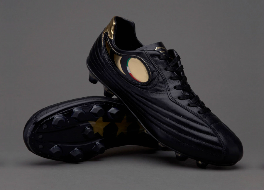 Made with the original patterns used for their 90s era boots, they feature classy metallic gold details and a subtle hint of the Italian flag. A lightweight modern plate features moulded studs for responsive traction in all directions on natural firm ground surfaces.