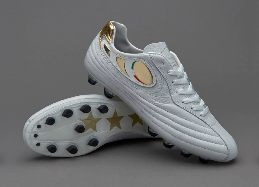 Made with the original patterns used for their 90s era boots, they feature classy metallic gold details and a subtle hint of the Italian flag. A lightweight modern plate features moulded studs for responsive traction in all directions on natural firm ground surfaces.