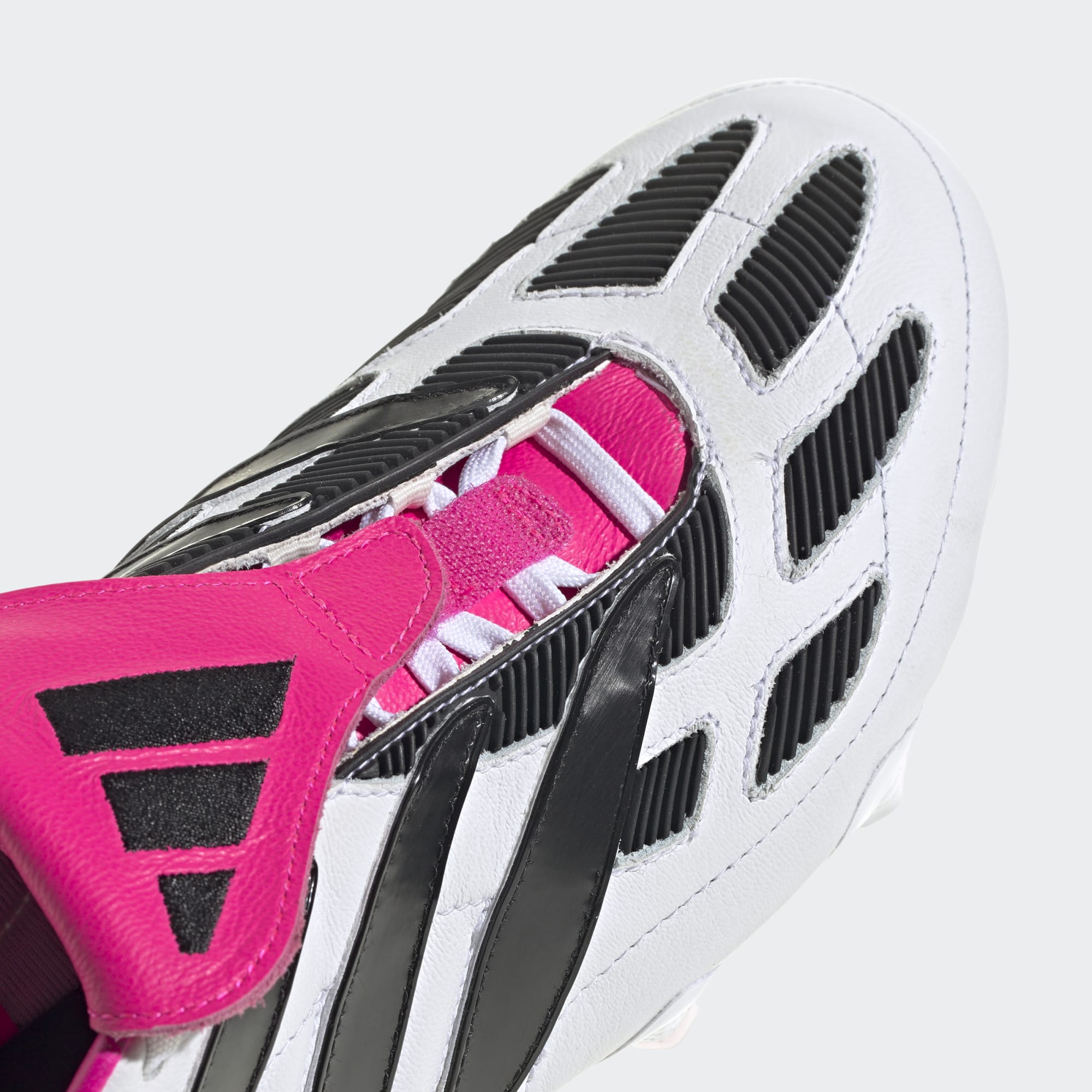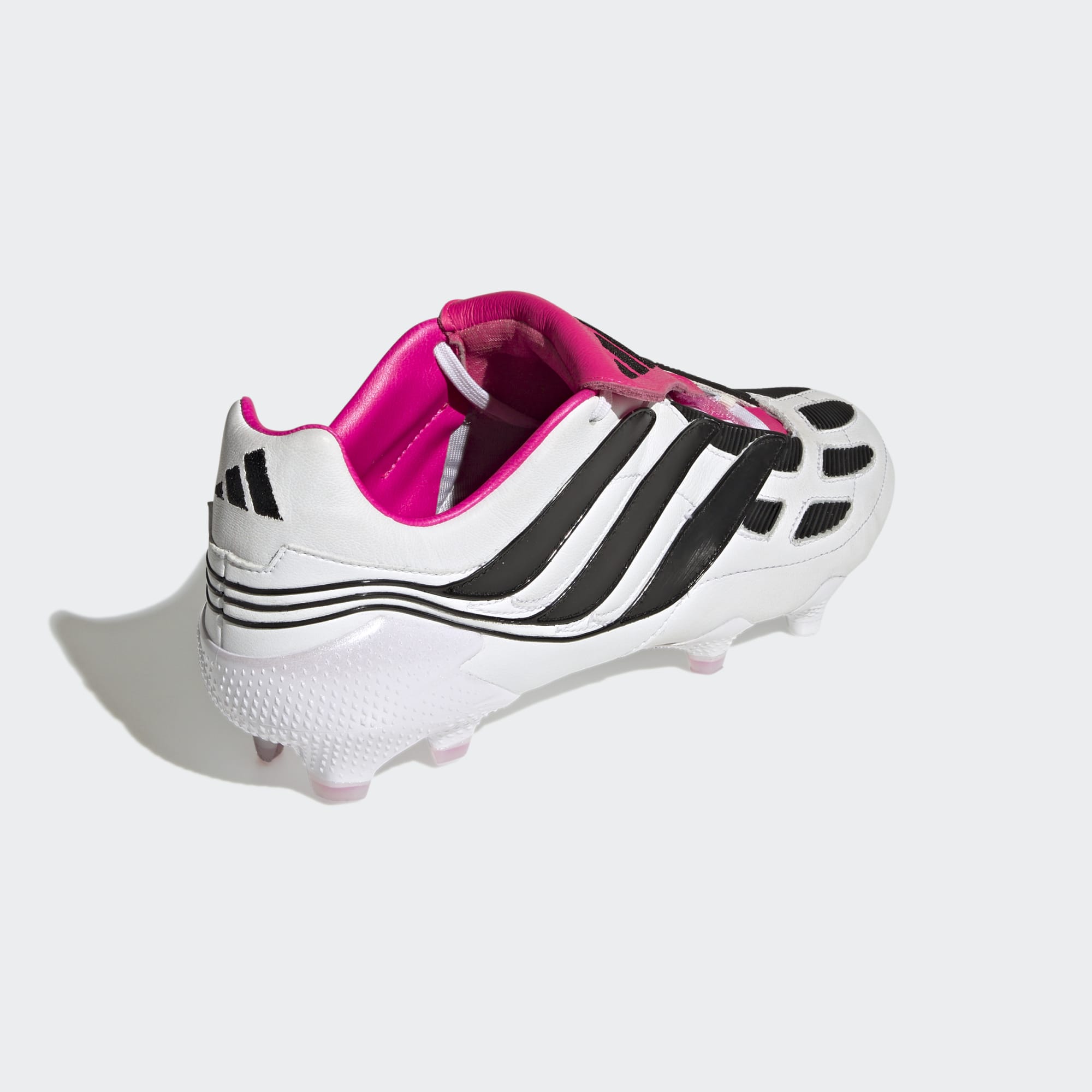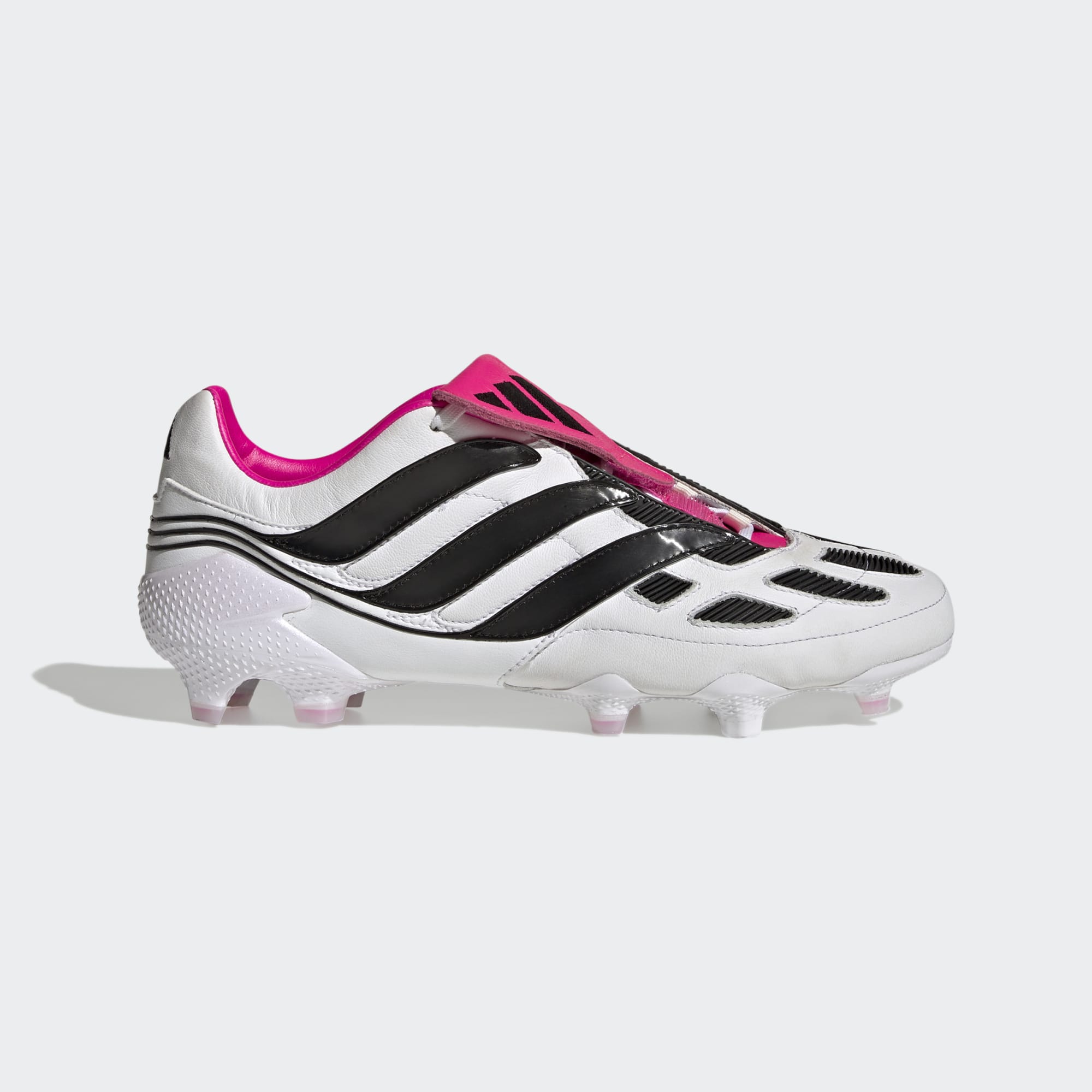 First launched in 2000, the Precision is targeting a return in 2023. The soft cow leather upper on these adidas Predator Precision+ football boots in Cloud White/Core Black/Team Shock Pink has all the iconic elements of the original, including its fold-over tongue and stitched-on rubber forefoot pads.