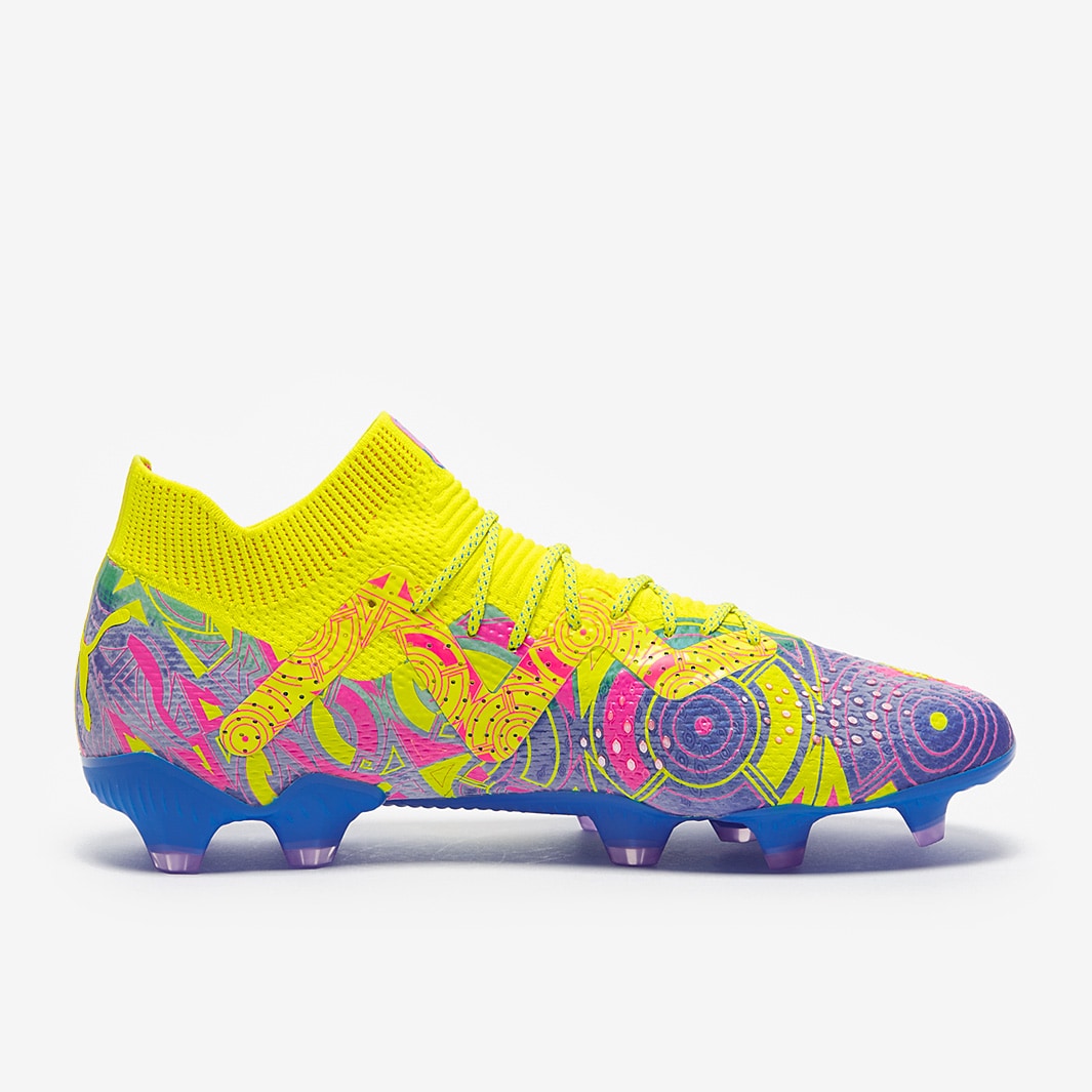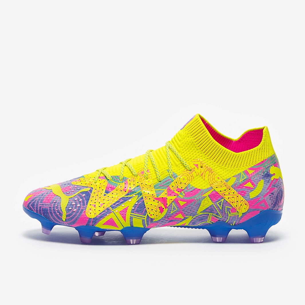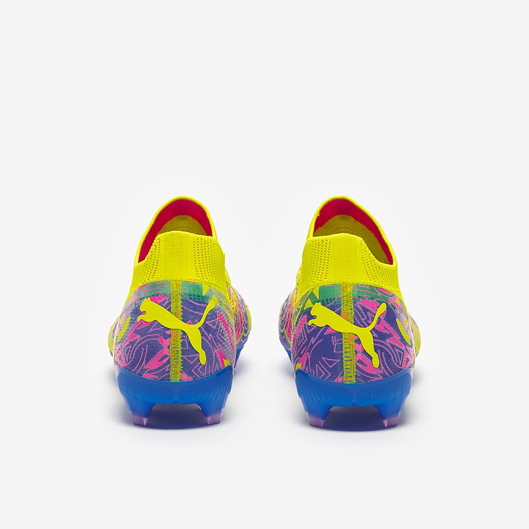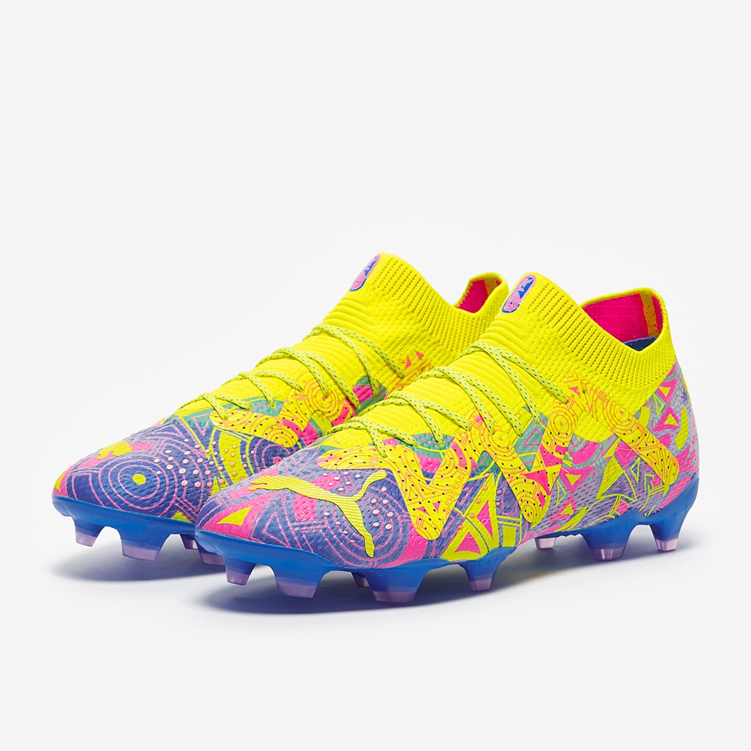 Unleash your creativity on the pitch with the PUMA Future Ultimate Energy FG/AG football boots in Ultra Blue/Yellow Alert/Luminous Pink, designed with game-changing PWRTAPE technology to elevate your performance.
