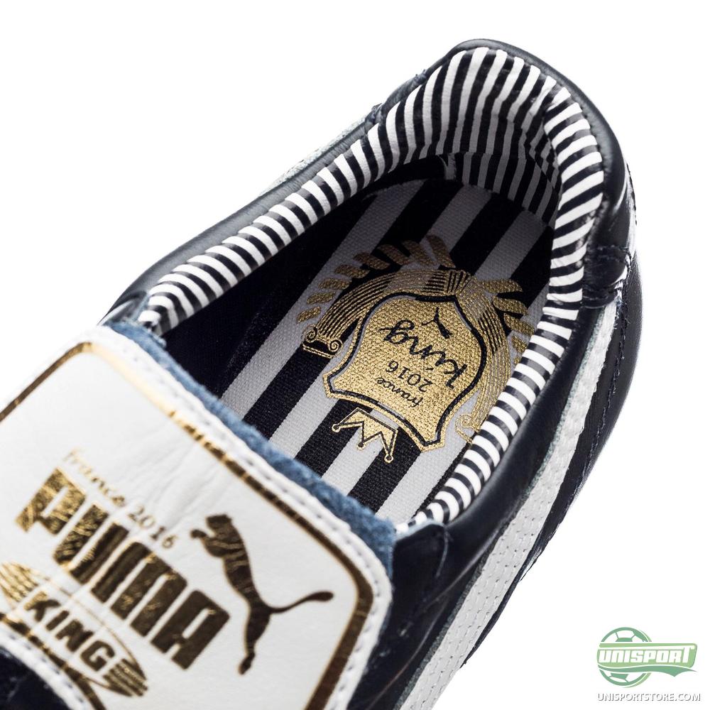 Puma King Top Stripe di has a classic fold-over tongue. The tongue covers the laces, which give you a cleaner strike to the ball. On the inside of the tongue you can see the iconic 'mariniére-stripes, the dates are for EC 2016 start and end date, which is '10.06.16 - 10.07.16'. On the well-known sole the conical studs give you a perfect penetration in the ground, which improves your maneuverability.