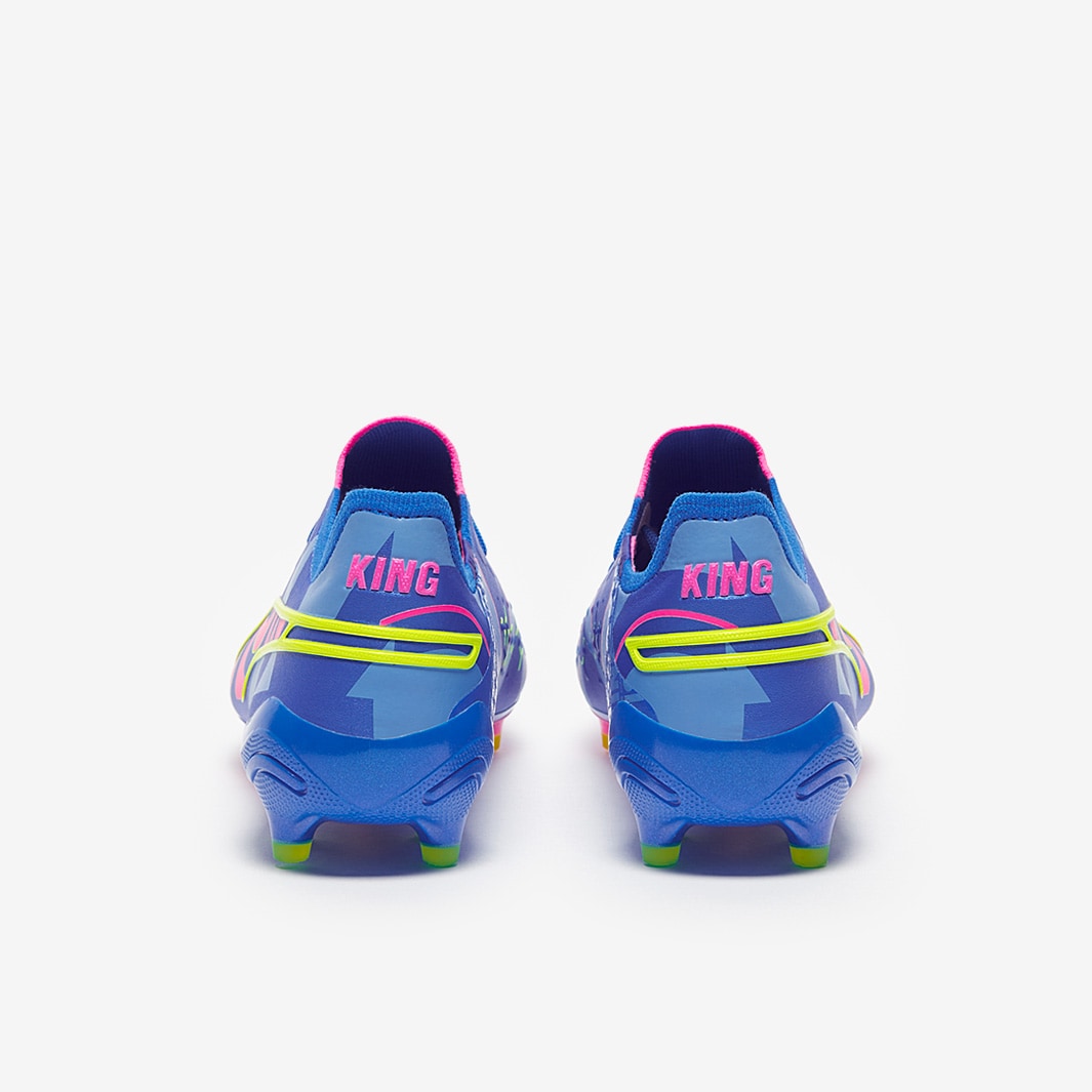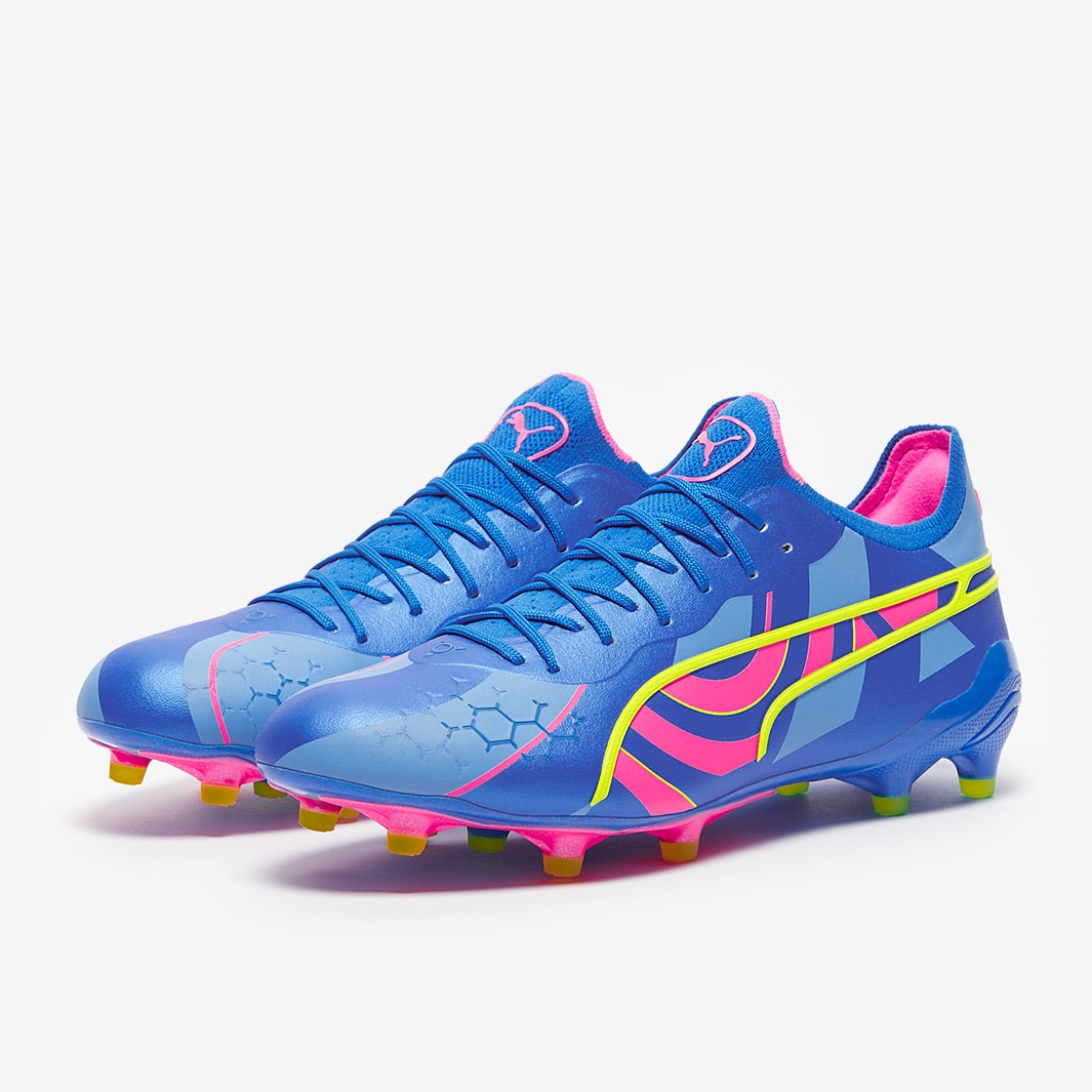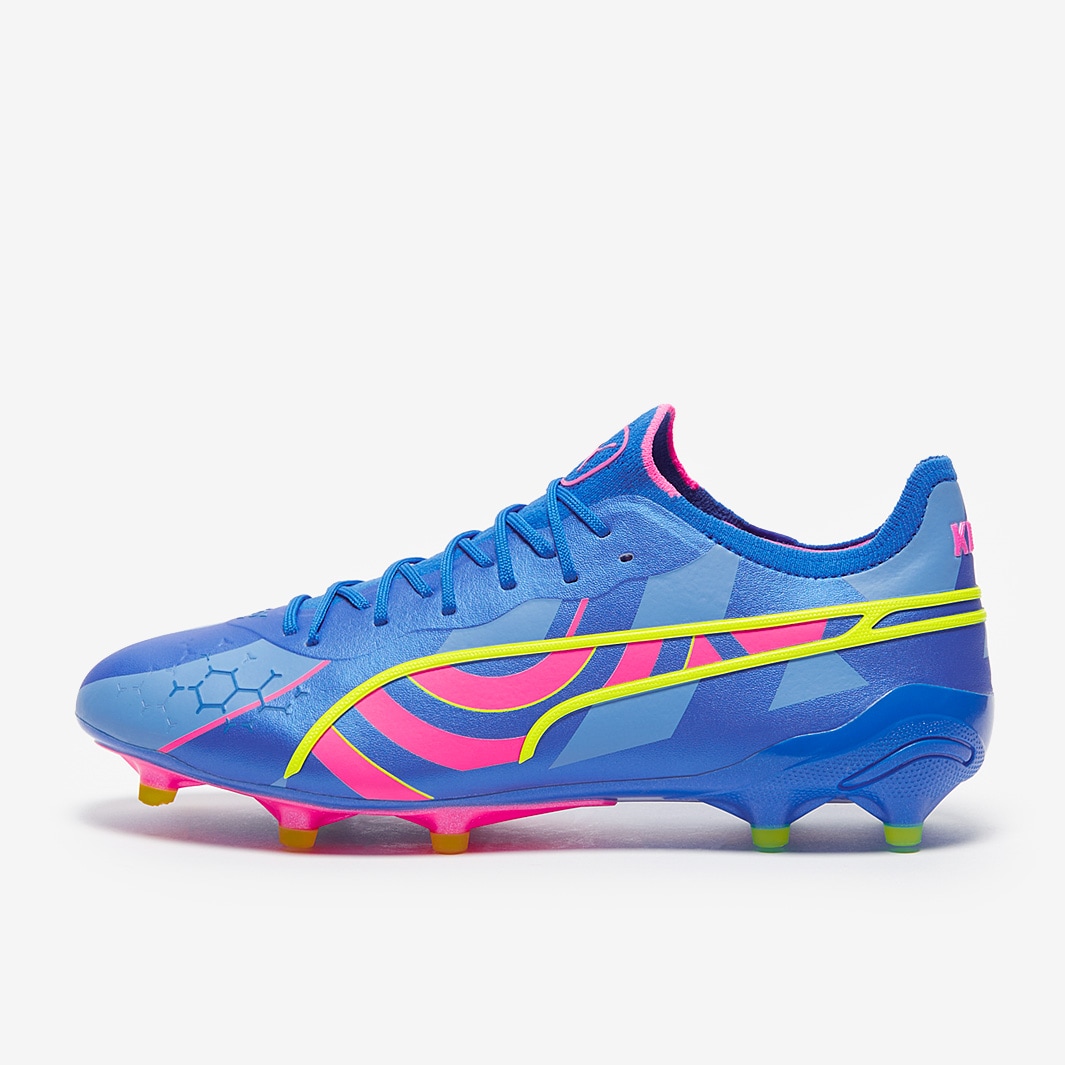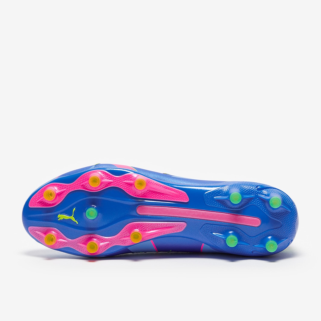 Experience effortless control on the field with the PUMA King Ultimate Energy FG/AG football boots in Ultra Blue/Luminous Pink/Luminous Blue.