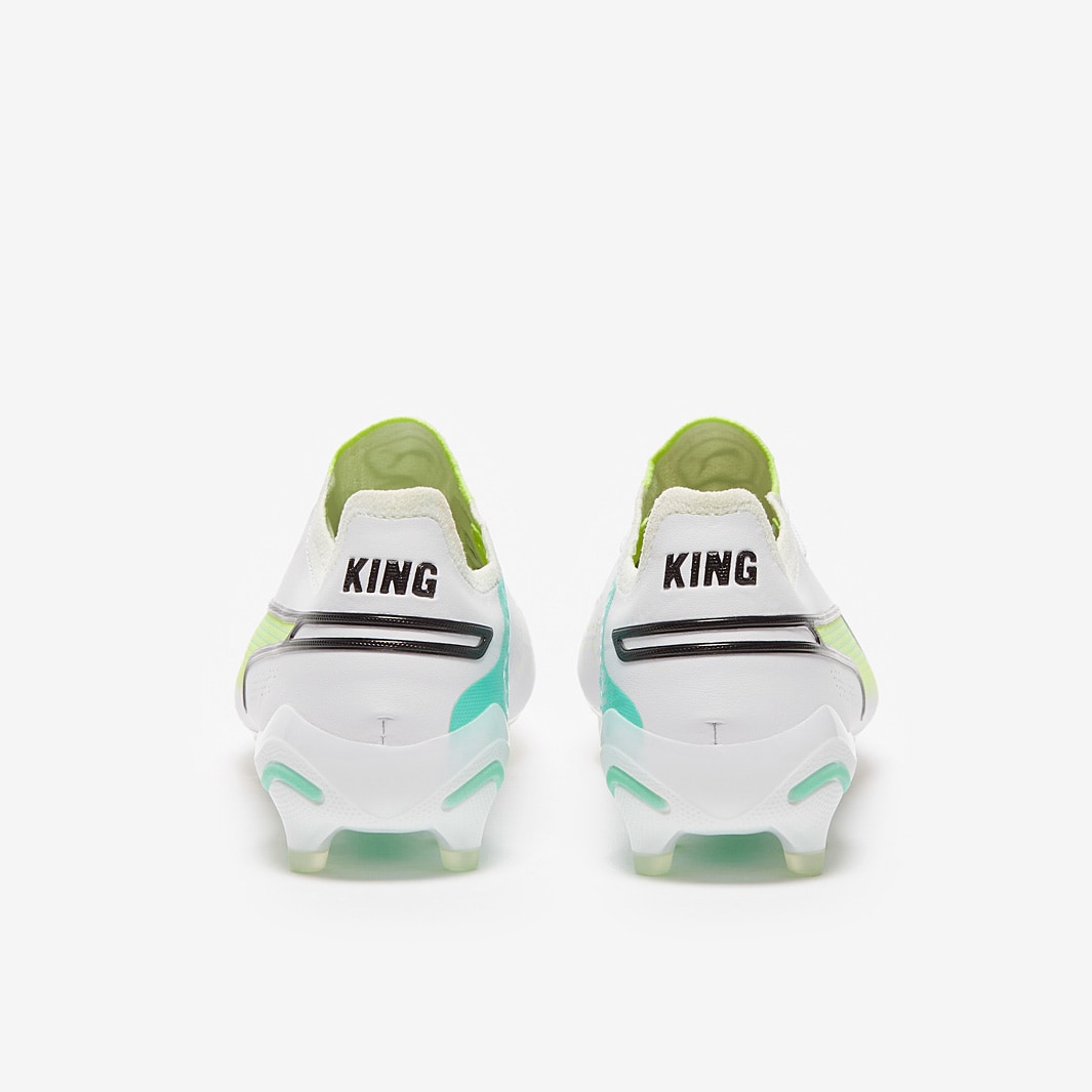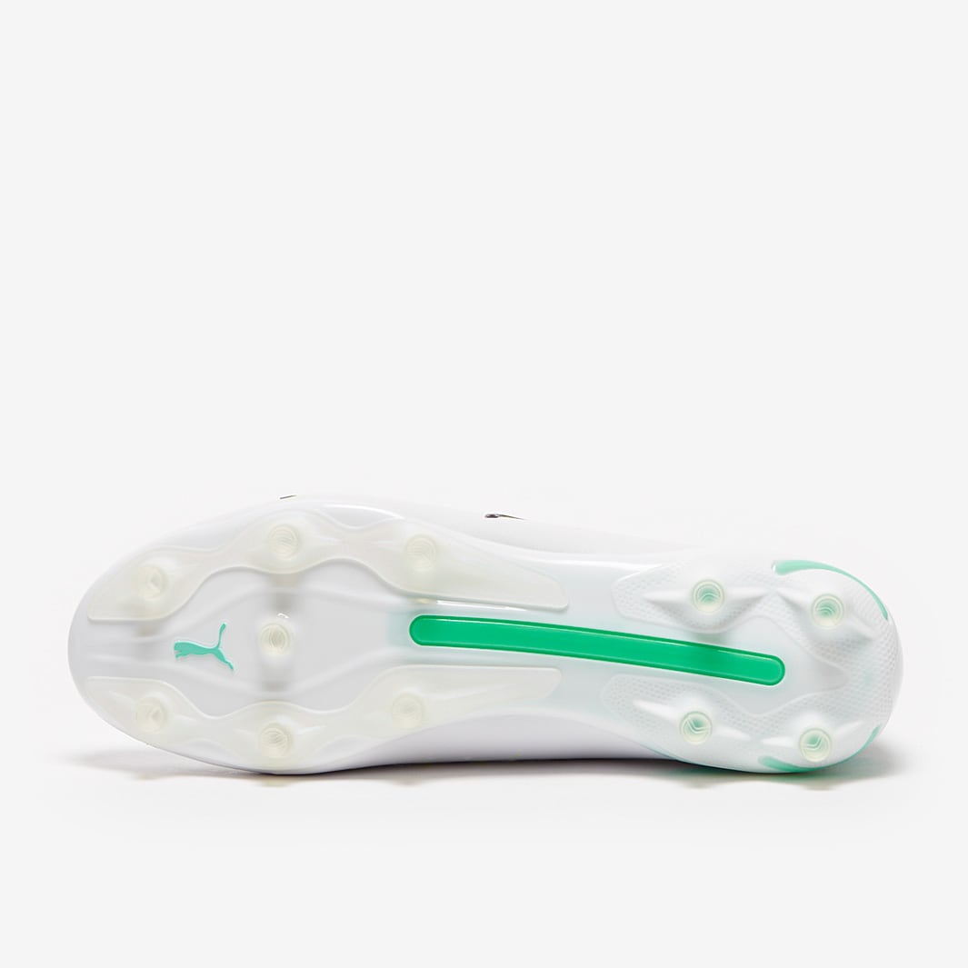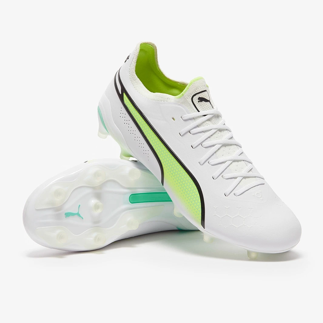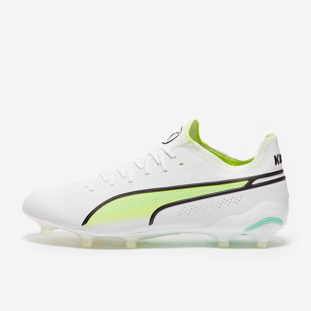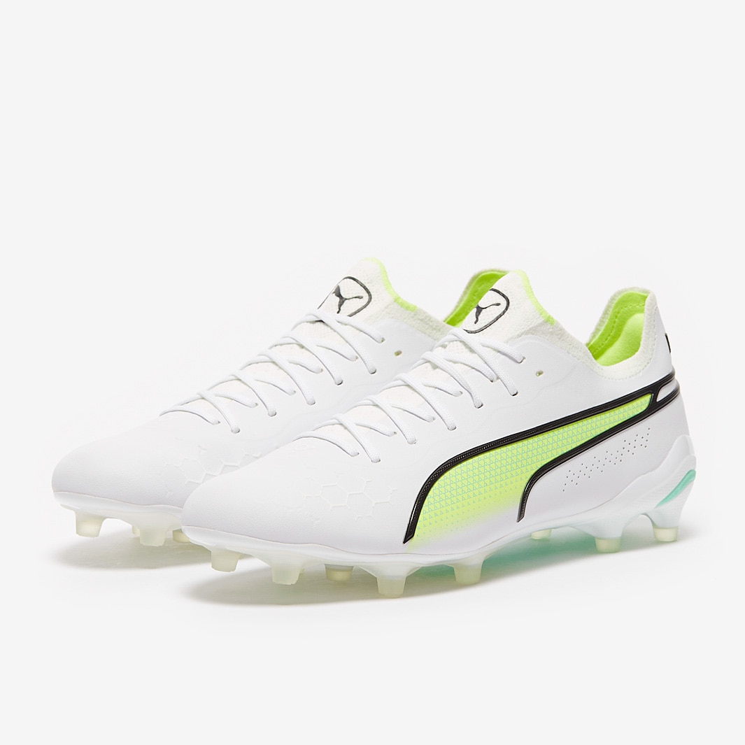 These are the new PUMA King Ultimate FG/AG football boots in Puma White/Puma Black/Fast Yellow/Electric Peppermint.
