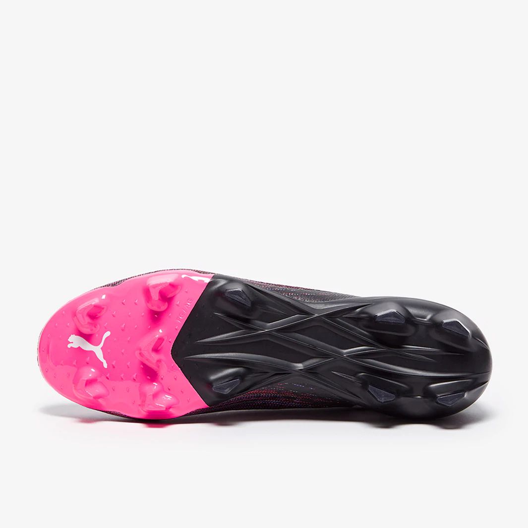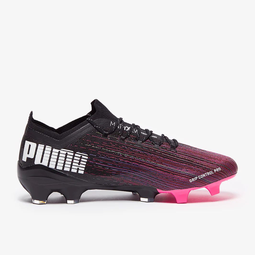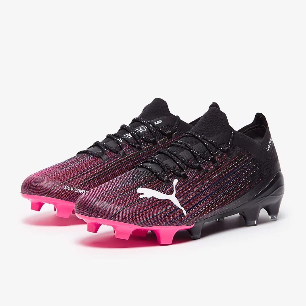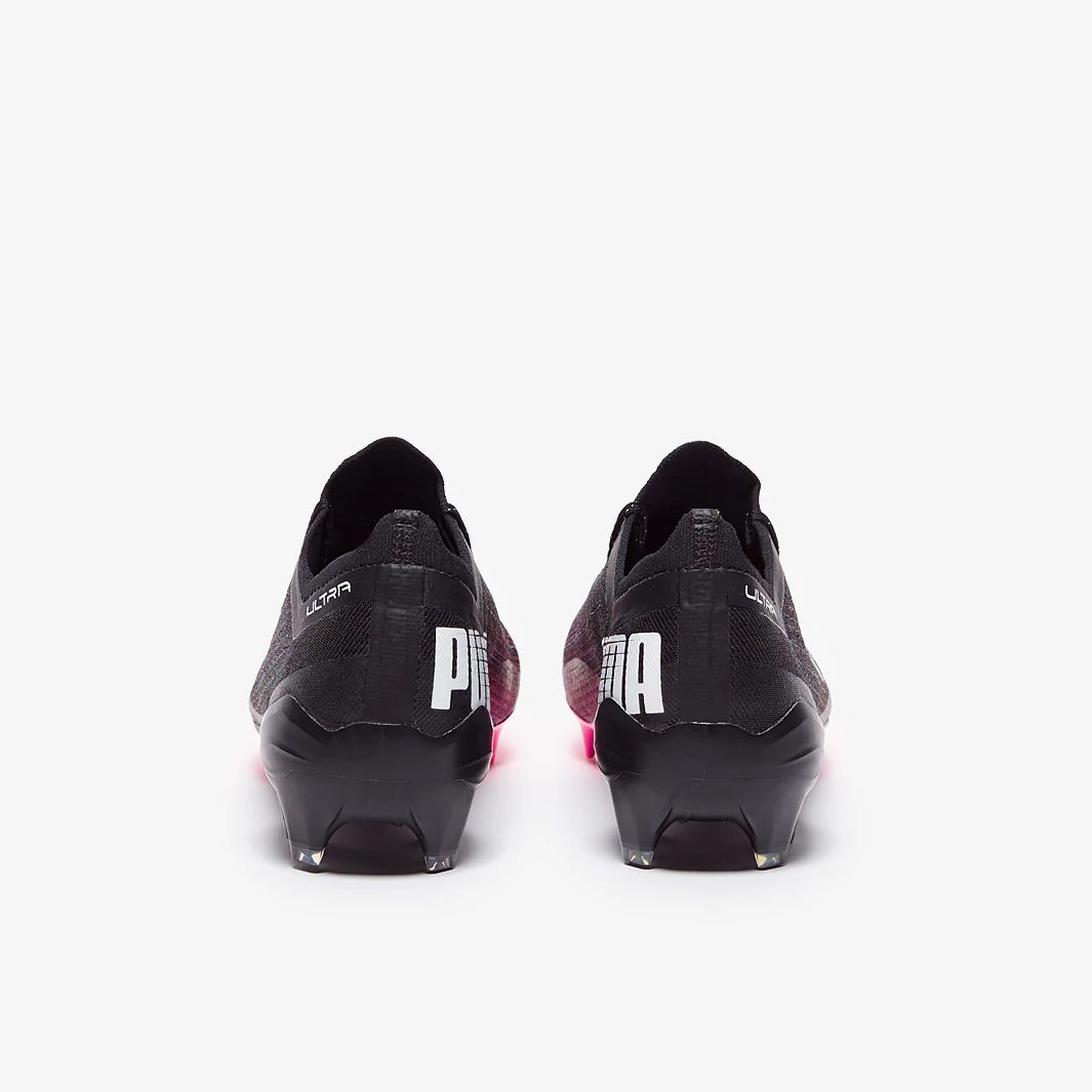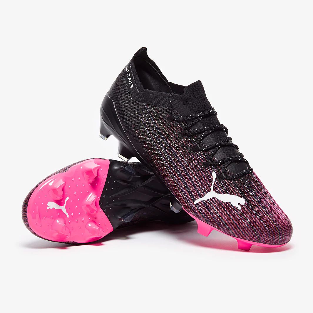 These are the new PUMA Ultra 1.1 FG/AG football boots in black/luminous Pink, featuring a lightweight, speed-focused design with an ultra-fast outsole inspired by running spikes.