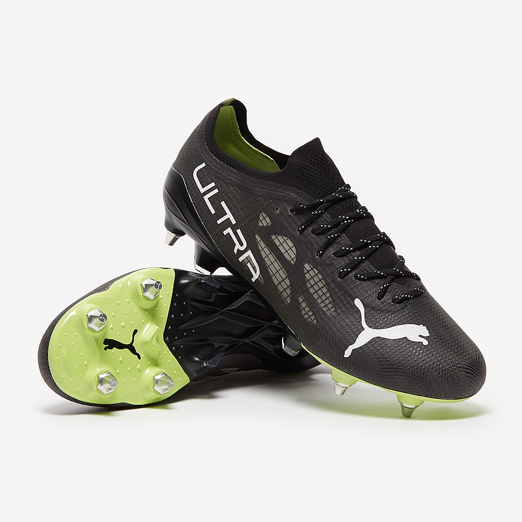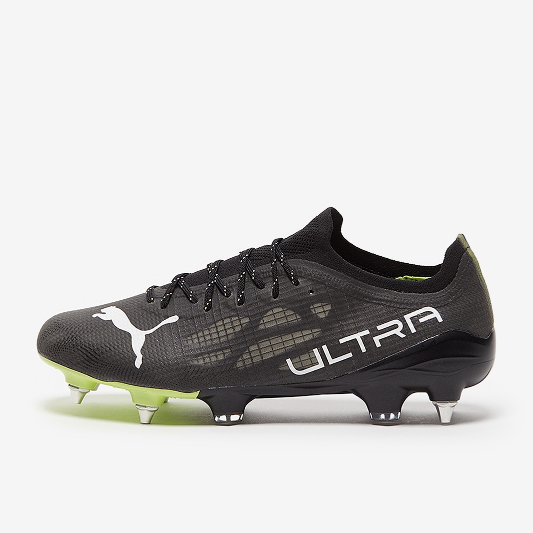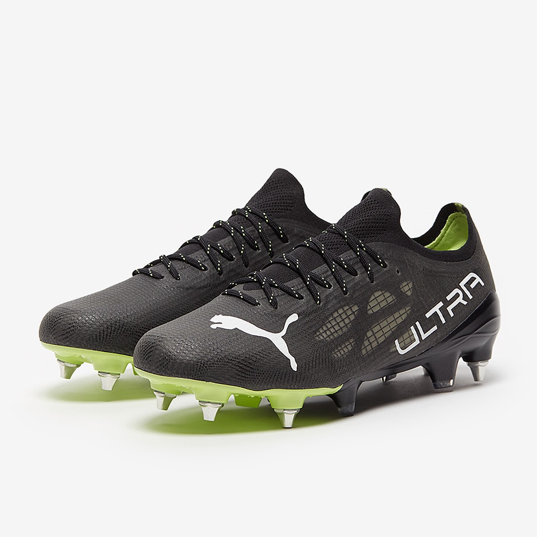 These are the PUMA Ultra 1.4 MxSG football boots in Puma Black/Puma White/Fizzy Light, featuring new cutouts on the ULTRACut upper for an even more lightweight feel.
