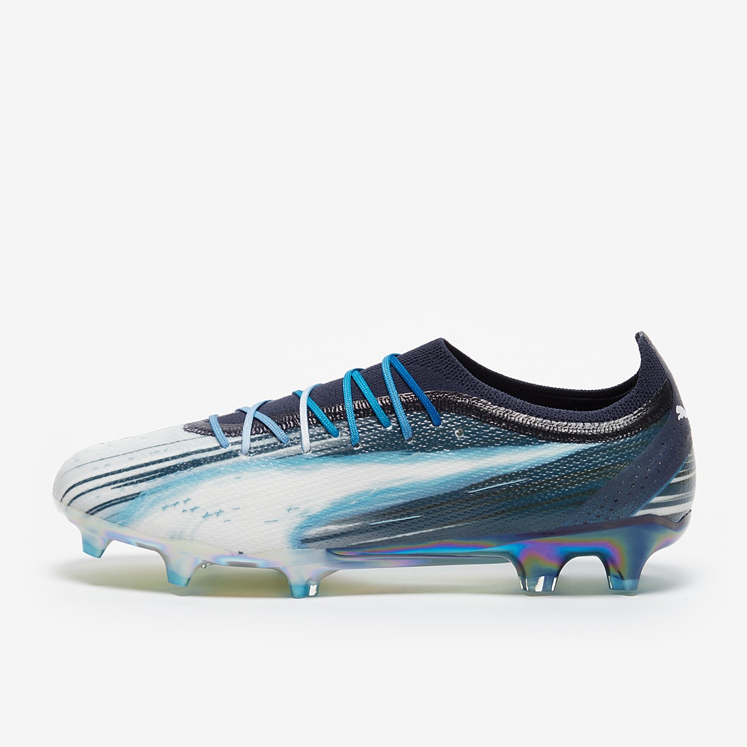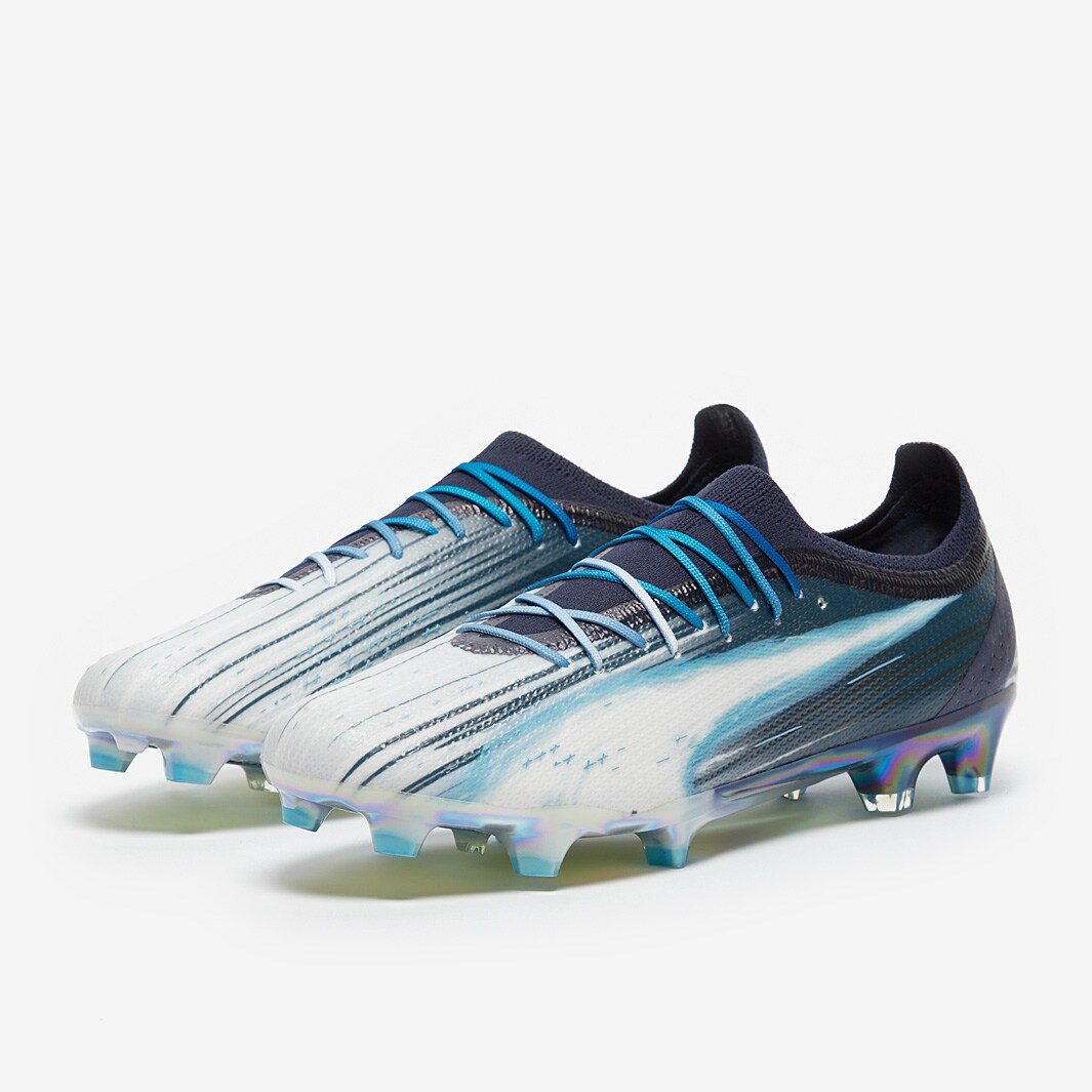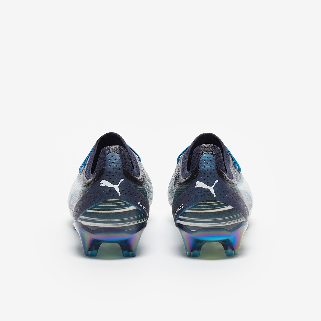 These are the new PUMA Ultra Ultimate Elements FG/AG football boots in Puma Navy/Puma White/Bright Aqua, showcasing the exclusive "Elemental Lightning" design by renowned artist SILNI.