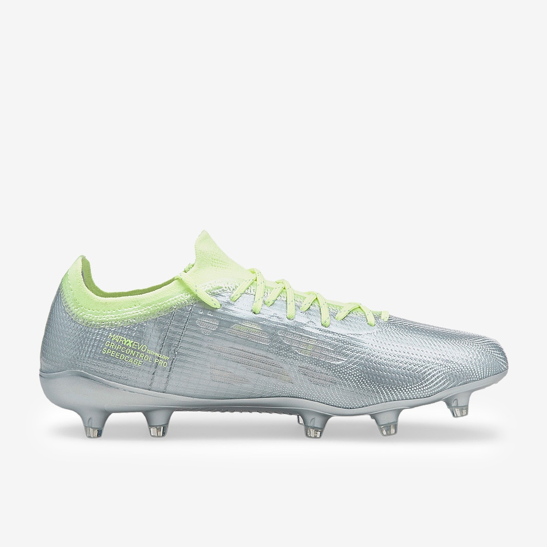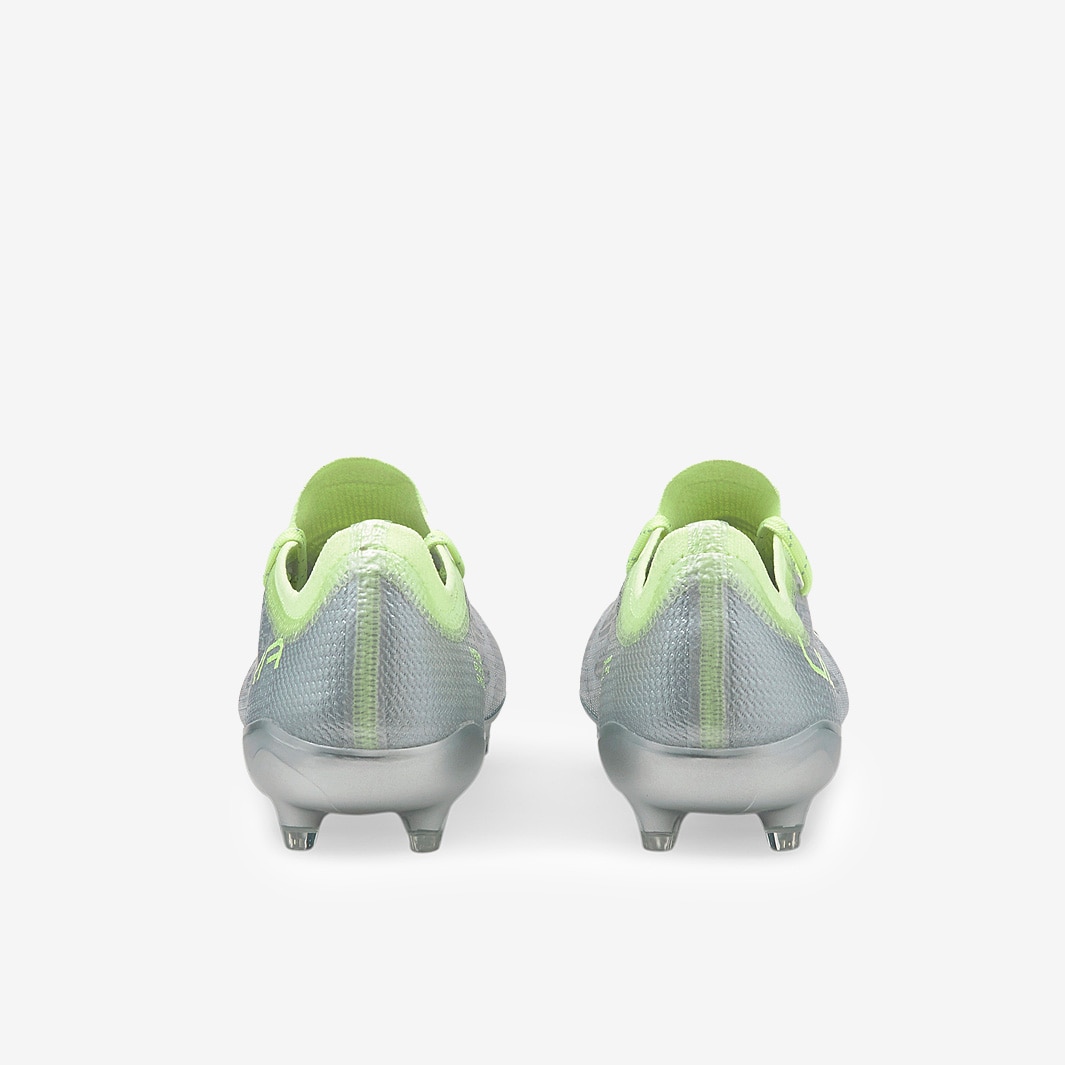 PUMA released these Women's Ultra 1.4 FG/AG football boots in Diamond Silver/Fizzy Light, featuring new cutouts on the ULTRACut upper for an even more lightweight feel.