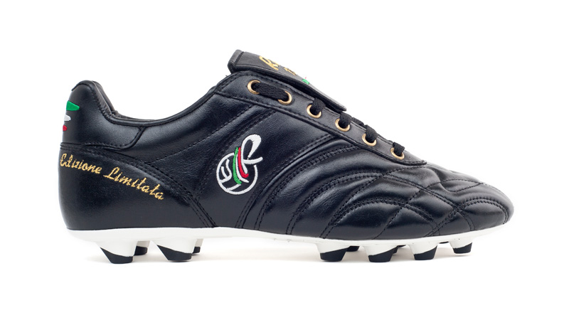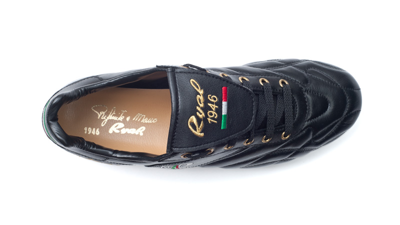 The Ryal 1946 is a handmade football boot with an upper of black K-leather and has a PU-sole with fixed studs. 100% made in Italy.