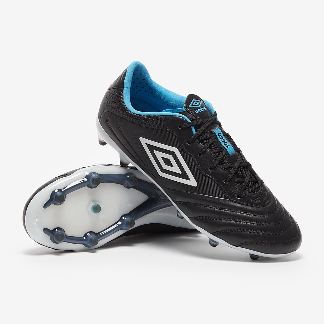 The Umbro Tocco III Pro FG football boots in Black/White/Malibu Blue empower you with their Dyneema-infused leather upper for unmatched ball control.