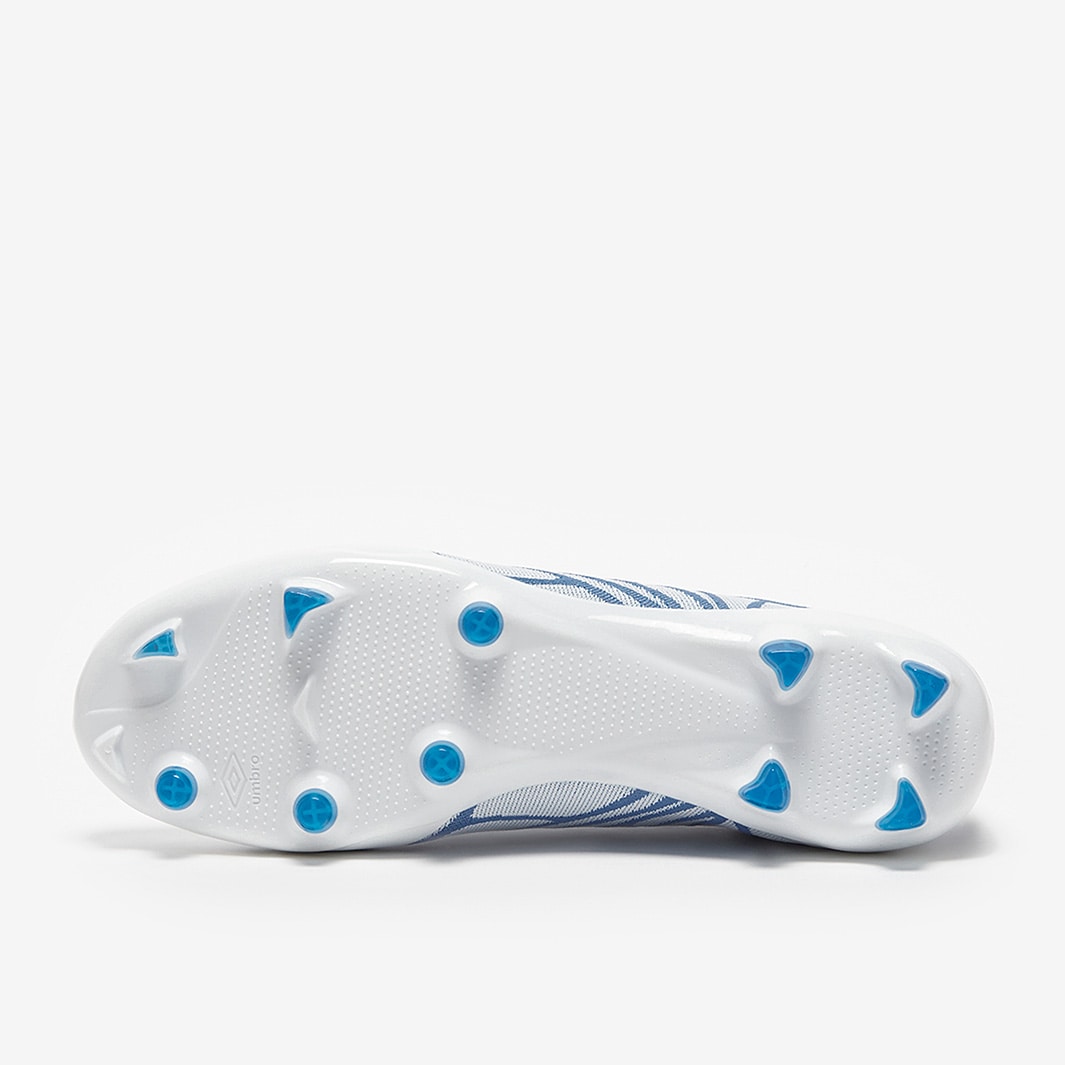 These are the new Umbro Velocita Alchemist Pro FG football boots in White/Malibu Blue/Clear Sky, designed for fast and attacking play with a streamlined build.