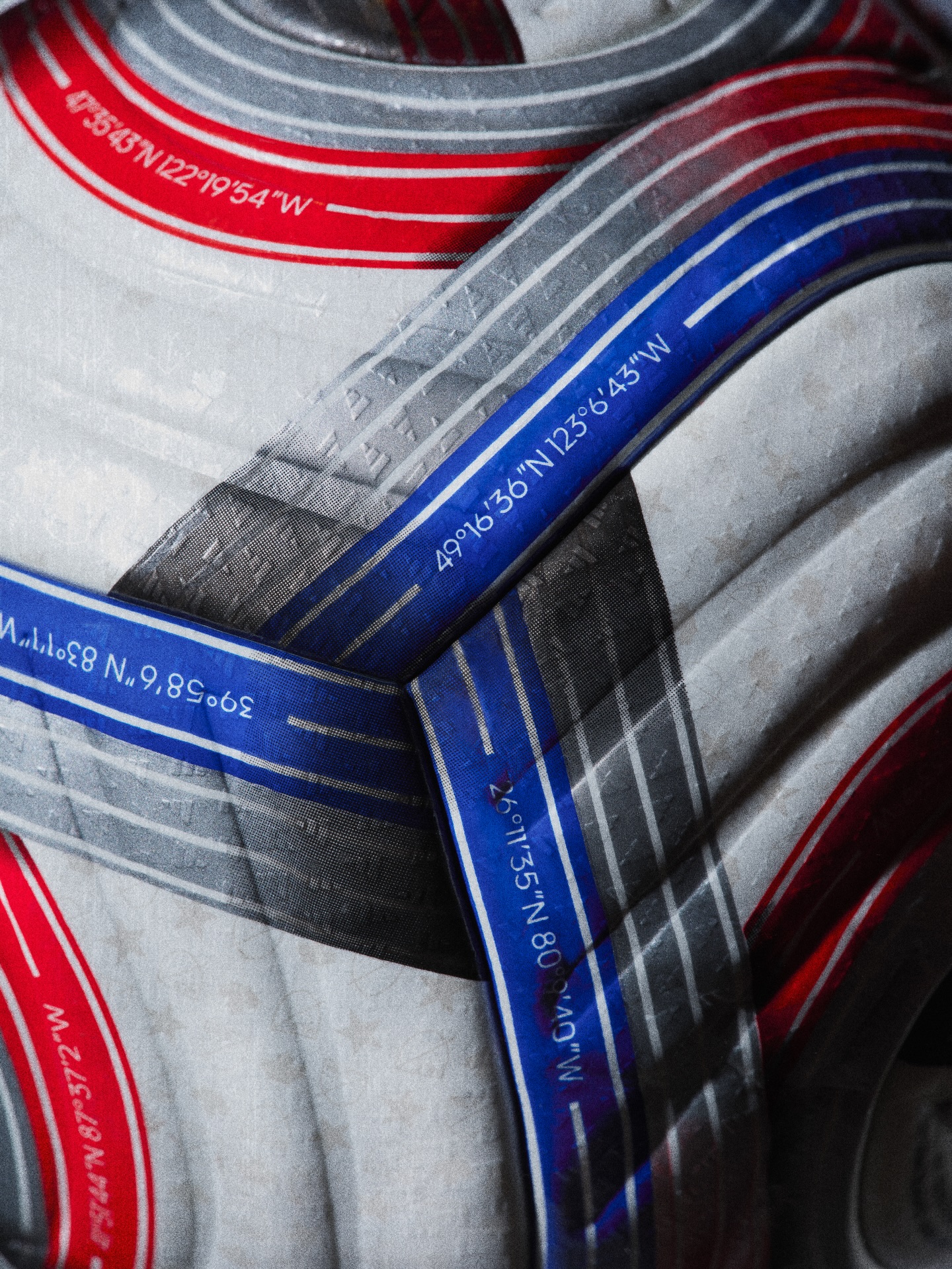 The adidas match ball features a white base combined with flowing red, blue, and silver graphic elements that wrap across the surface. These curved bands integrate fine linear detailing and printed coordinate markings, referencing the geographic locations of all 30 MLS stadiums. Additional graphic elements include subtle MLS shield motifs, stars, and league related symbols, creating a unified visual language representing both the United States and Canada.